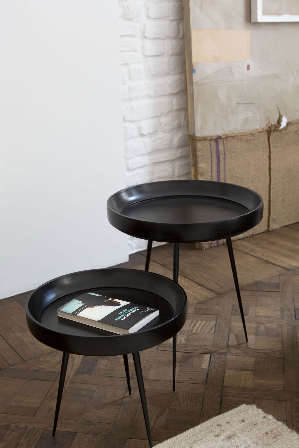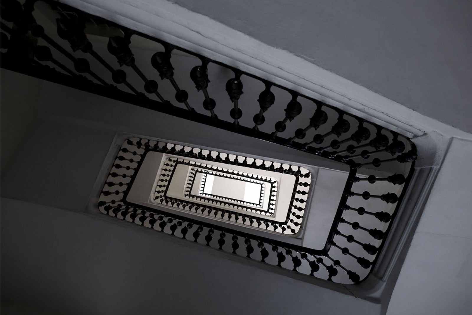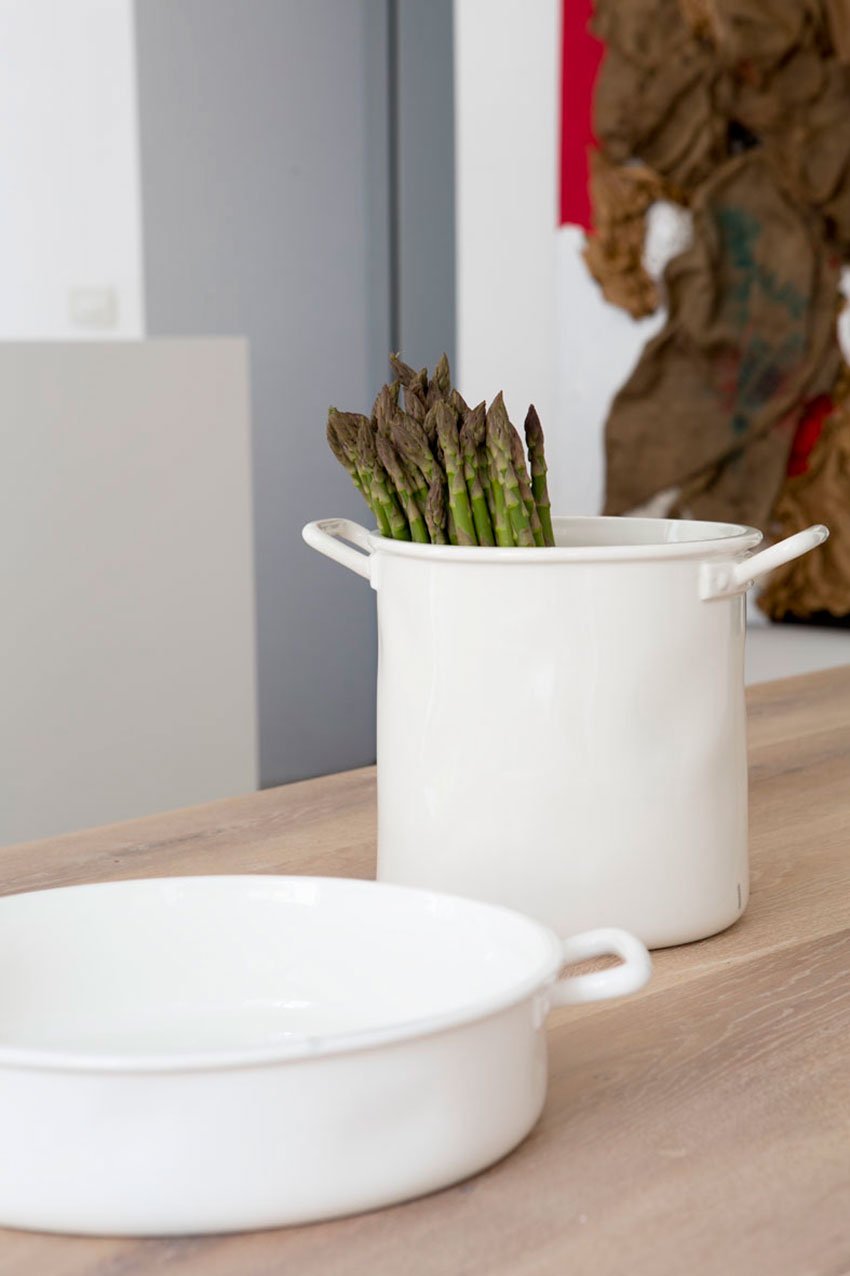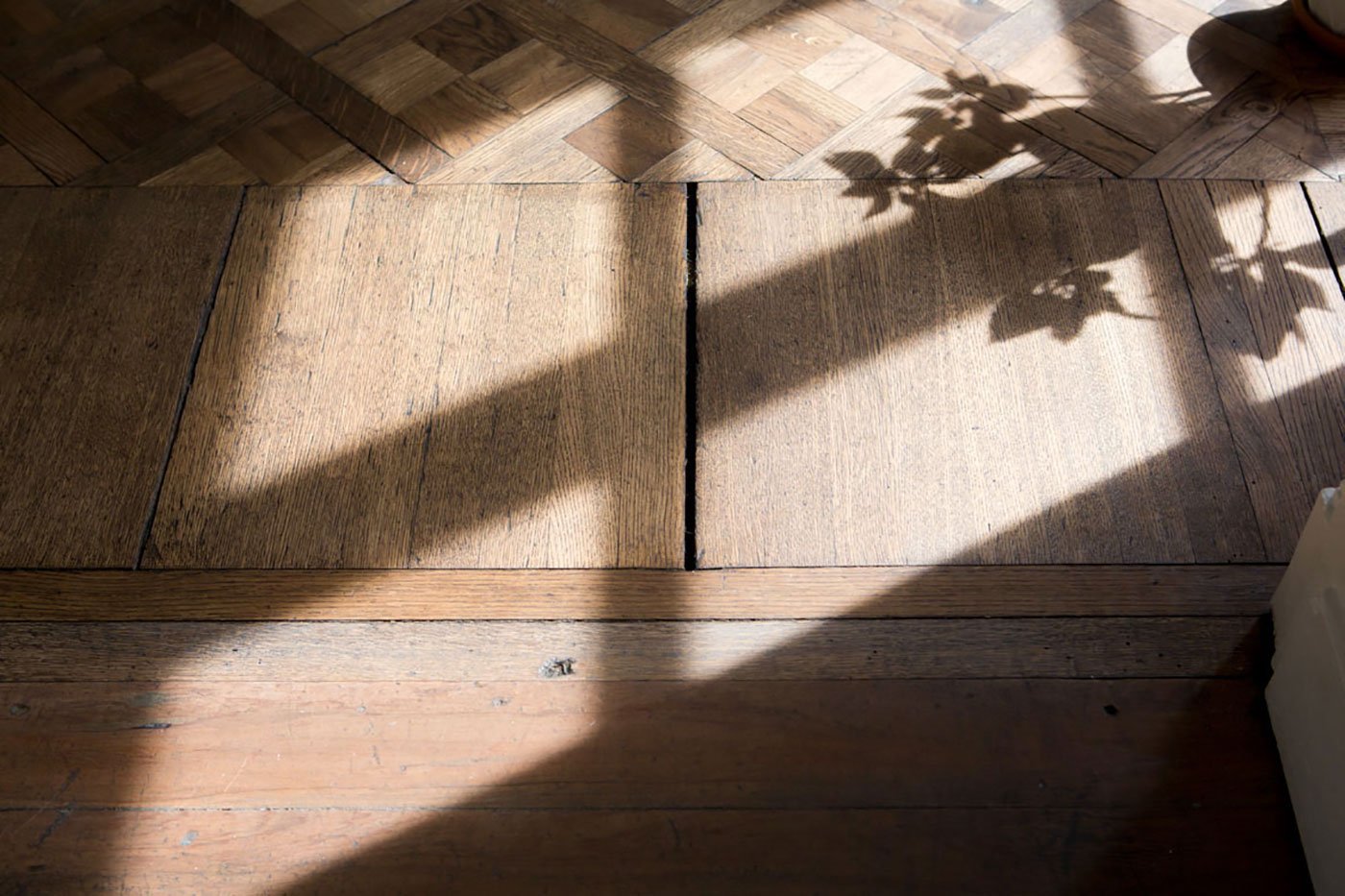 An interior design project by Fabio Fantolino, Basilica updates a home in Turin, Italy with a palette of neutral colors. In every room but the bathroom, the walls and ceilings are painted white. The white backdrop in the living room is a particular standout, as it includes a painted brick panel and contrasts with the vintage wooden floors of various patterns. In the kitchen, minimalist white cabinets are paired with a black backsplash. Additionally, there is a partial interior wall obscuring the worktop. To create dialogue between the open plan kitchen and dining room, the barrier is engraved with a Harriet Van Horne quotation, “Cooking is like love. It should be entered into with abandon or not at all.” In more private areas such as the master bedroom and bathroom, the floors are polished for a smooth, sophisticated effect. The square-framed bed is a particular standout in the bedroom, and the bathroom is a dark, cozy space with black panels. All of the rooms are finished with gray, black, and brown furniture and decor to round out the earthy look.