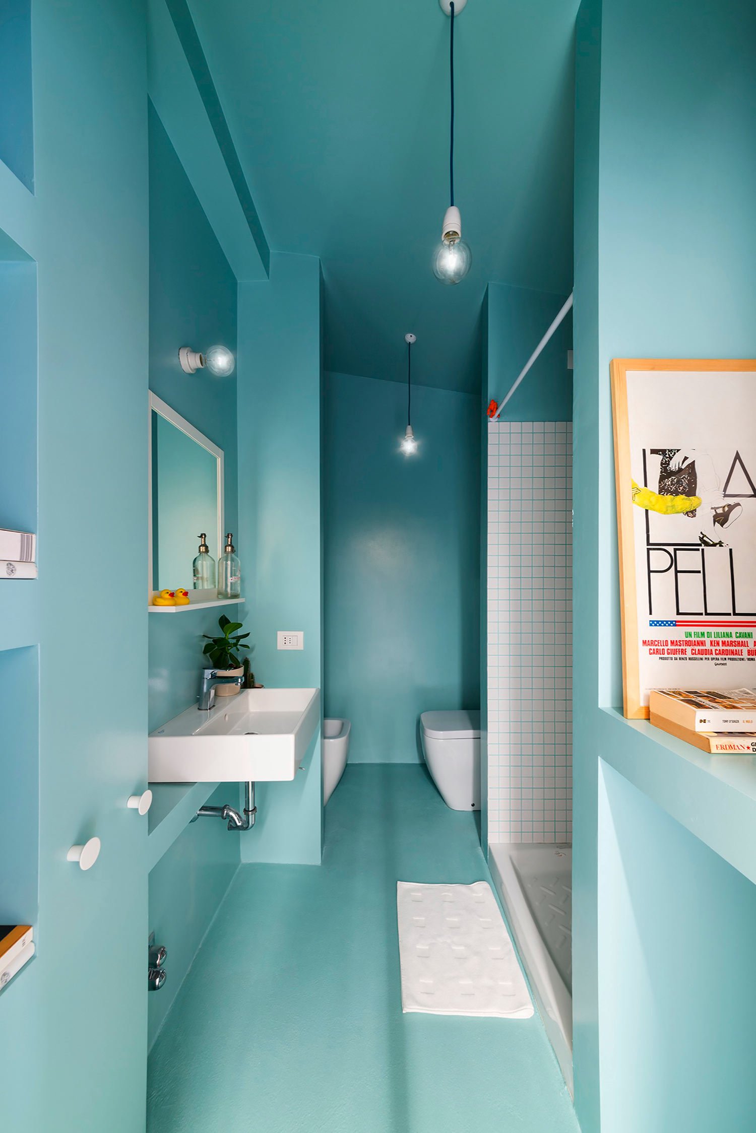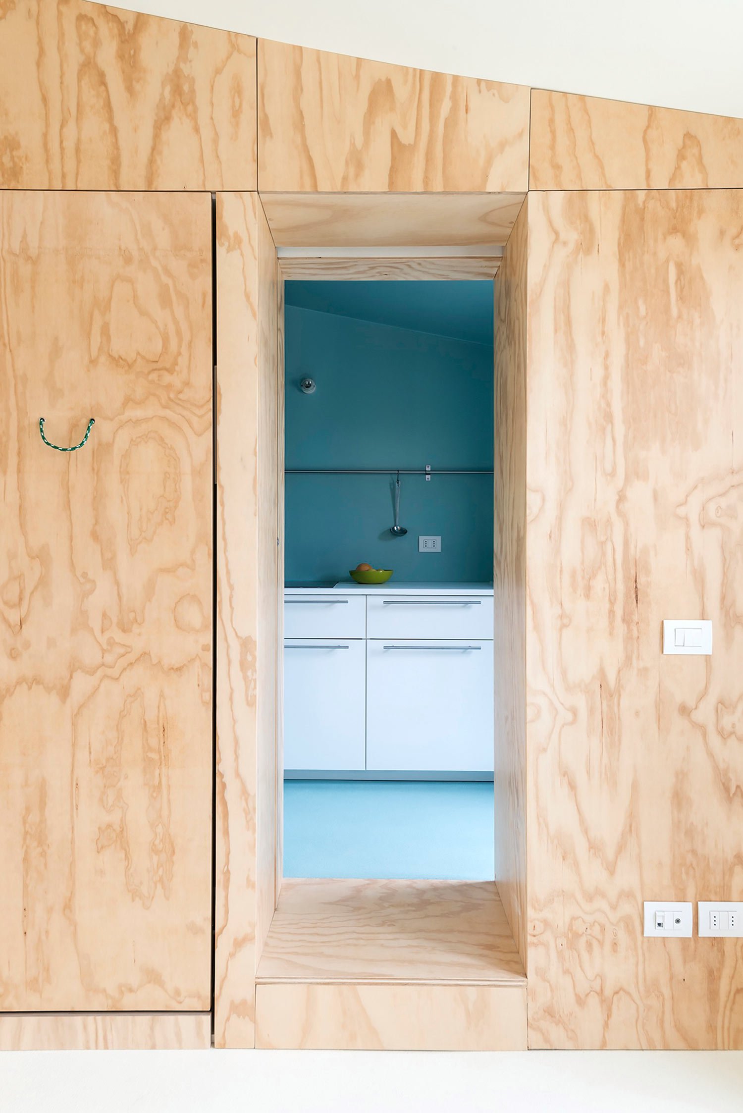 Part of the growing architectural effort to reduce the footprint it takes to maintain a comfortable life, studioWOK’s intervention in this 28 square meter space creates the impression of a far larger abode. The so-called “Batipin Flat” can be found in the streets Milan, distinguished by a dynamic main room that provides nearly every function for daily life within its clever plywood walls; the “active” structural features conceals all furniture — like the folding double bed – as well as personal belongings to avoid clutter and allow for endless flexibility throughout the day. Large sliding glass doors overlook the terrace, giving the illusion of a greater expanse while providing generous natural light that complements the organic ambiance of the room’s white surfaces and pale wooden walls. A monochromatic theme of turquoise blue adds a dose of color to the kitchen and bathroom, both of which are packed tightly in the loft’s close corners. This simple home accounts for nothing more than everyday necessities through an elegant model of efficient design. Photography © Federico Villa.