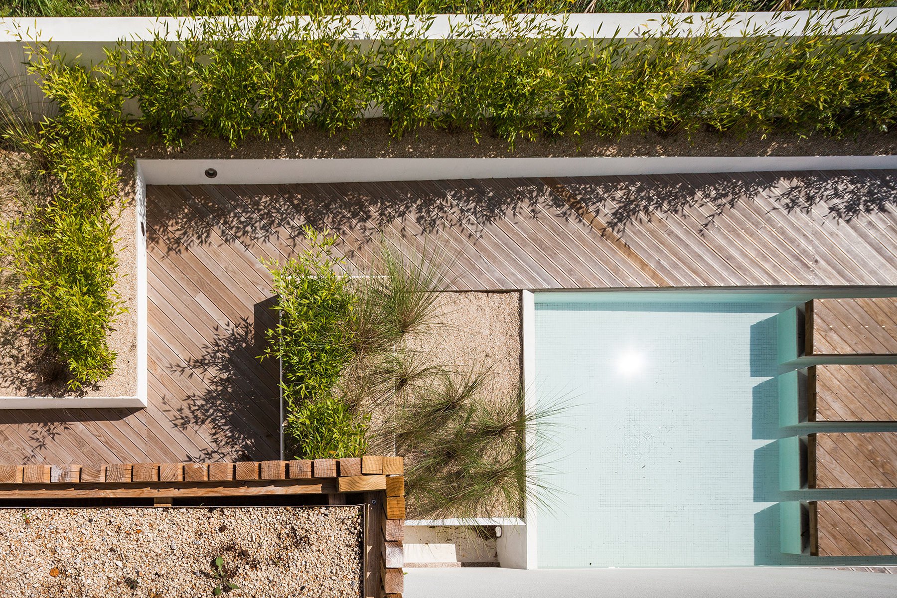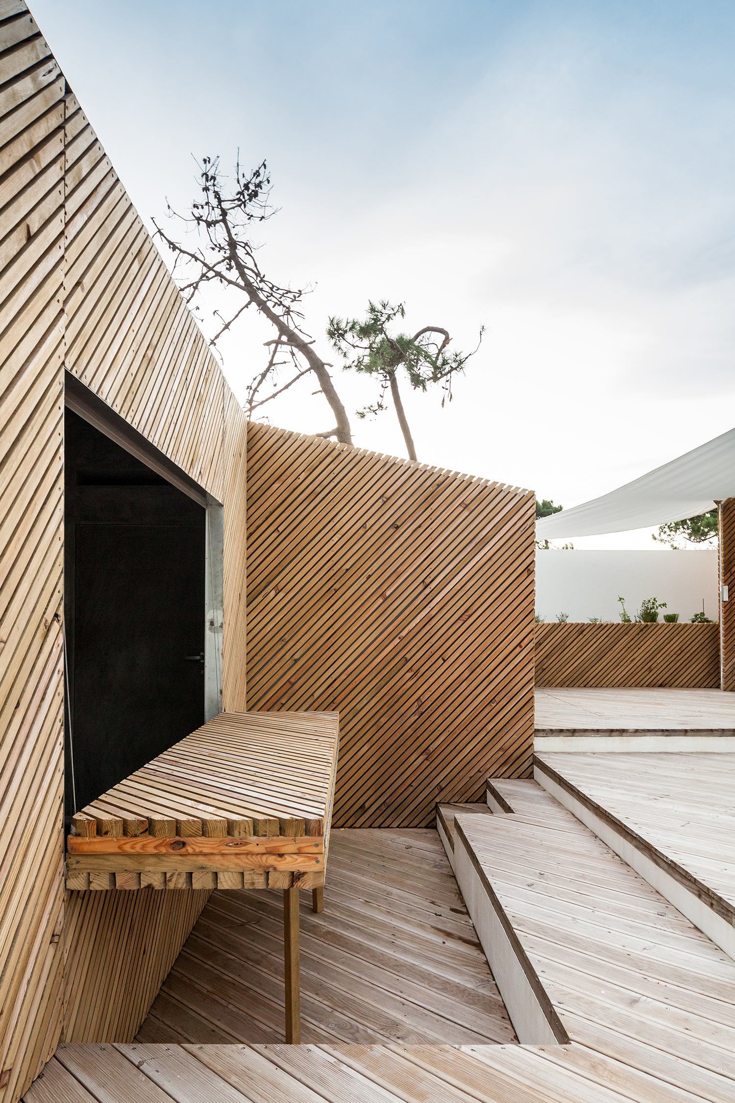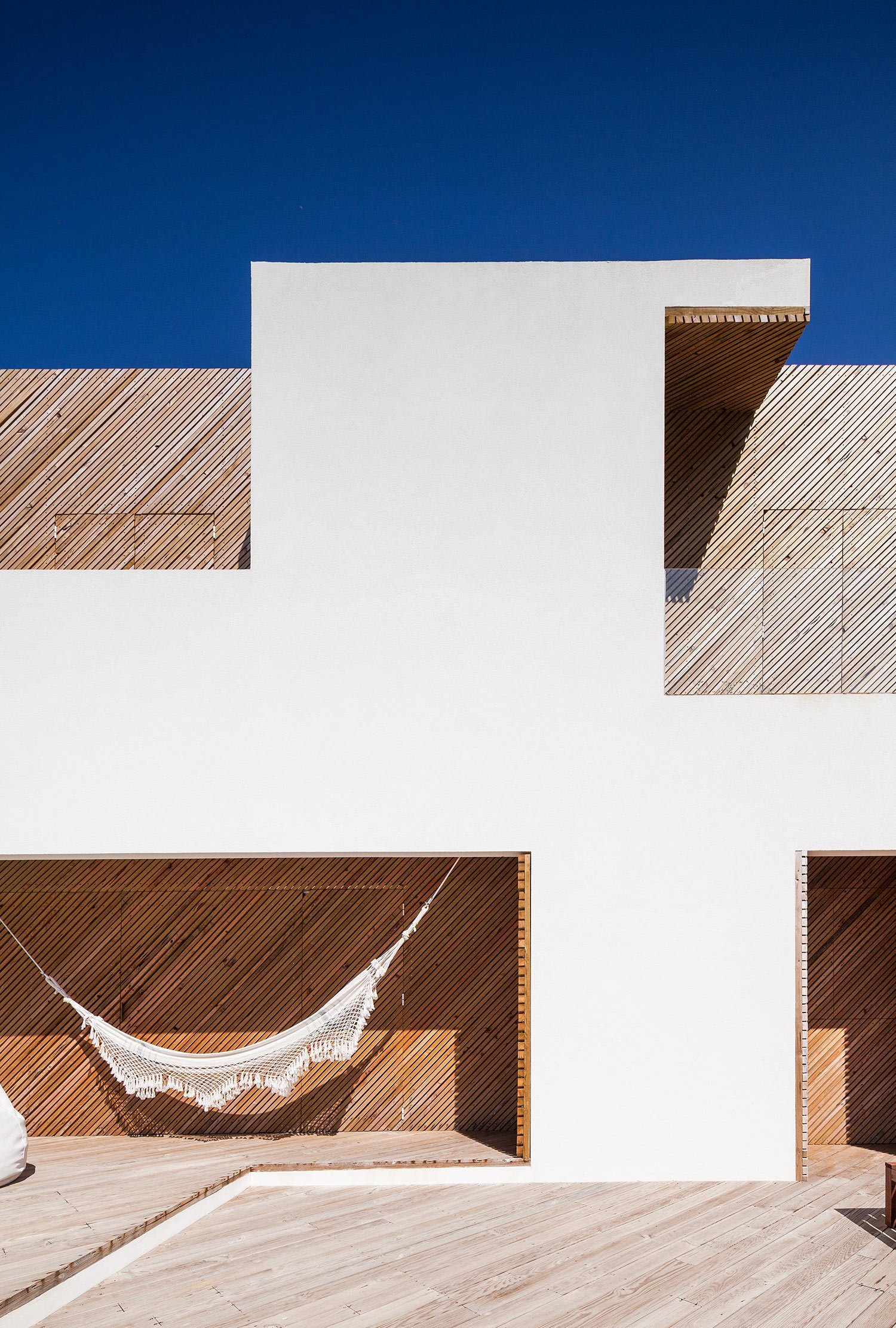 Like a bright seaside home, the resulting SilverWoodHouse contrasts naturally finished and white painted wood inside and out. The warm color palette enhances the lighting within the home and outdoors on the terrace. Inside, the home has an open design with many spacious areas such as the home office with built-in shelving. Nonetheless, the architecture beckons one outside onto the balconies and terrace. On the wood-lined patio, one will find a pool, a seemingly floating deck, a sandy garden, and shore-inspired furniture such as a crocheted hammock, bean bags under a canopy, and lounge chairs for stretching out and tanning. The white fabric details are a crisp and clean yet soft counterpart to the otherwise woodsy design. Photography by João Morgado