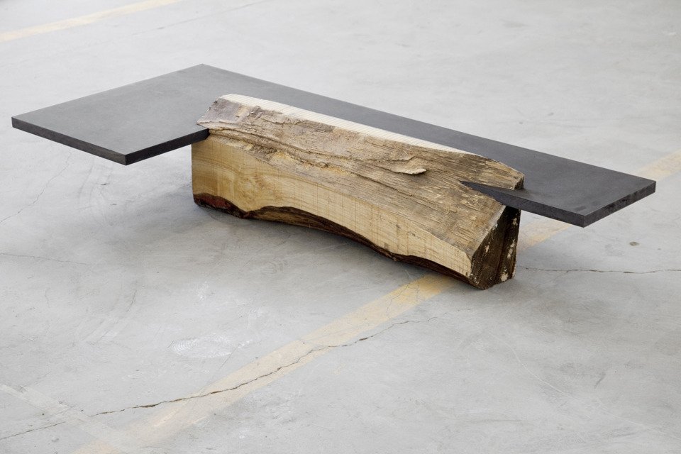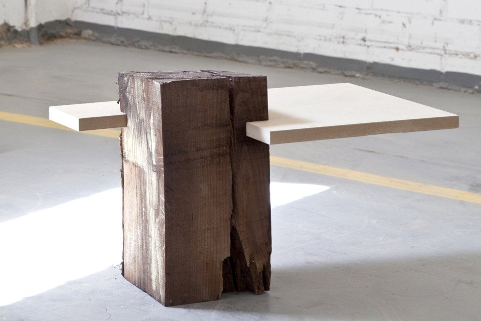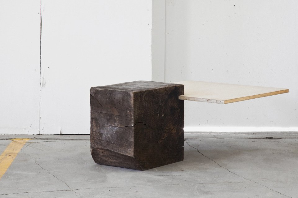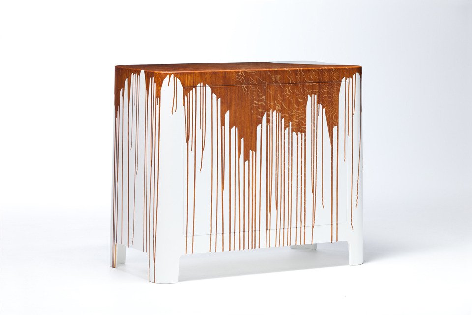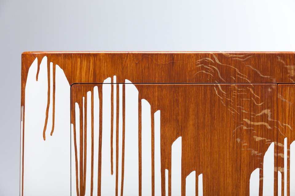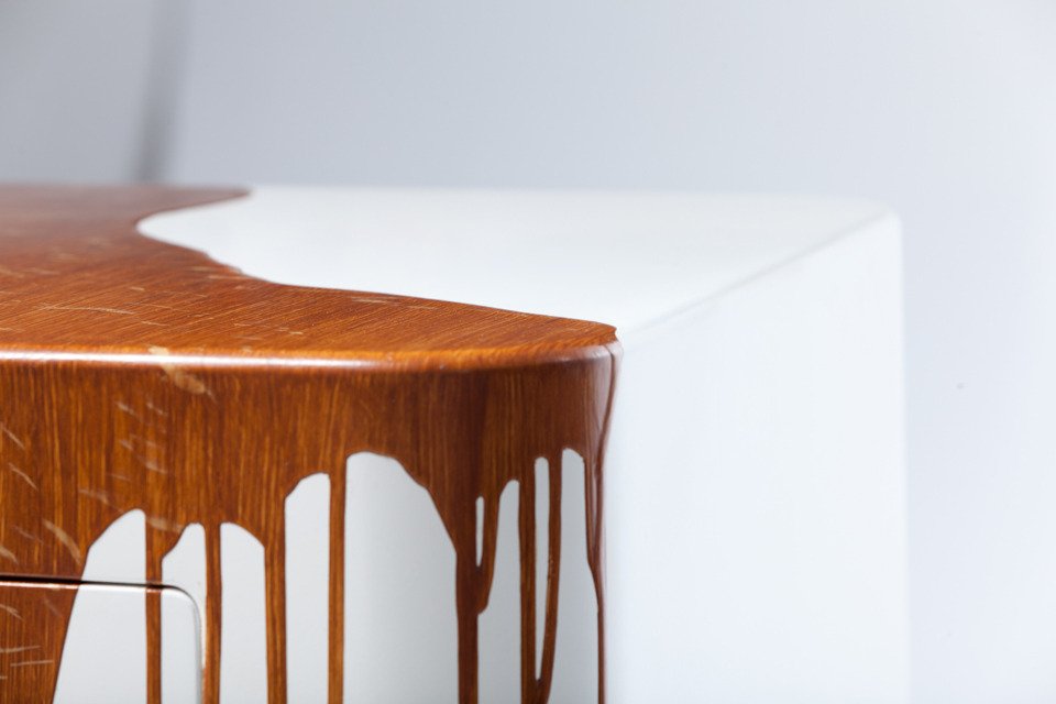 Challenging the typical perception of a table as a plane supported by four legs, Damien Gernay presents an alternative formal definition through Beam Tables. A plane is ceremoniously intersected with a wooden pedestal, the cantilevered surface serving as the tabletop – asymmetrical yet precariously balanced. Similarly, Gernay continues his foray on stereotypes by exploring materiality. In Textured Sideboard, a white set of drawers is sullied by wood-textured paint drips, which surely turns the idea of painting and staining a piece of furniture on its head. Both pieces are loud works in their composition and motivation – so be prepared for your ordinary furniture to raise an objection or two.
