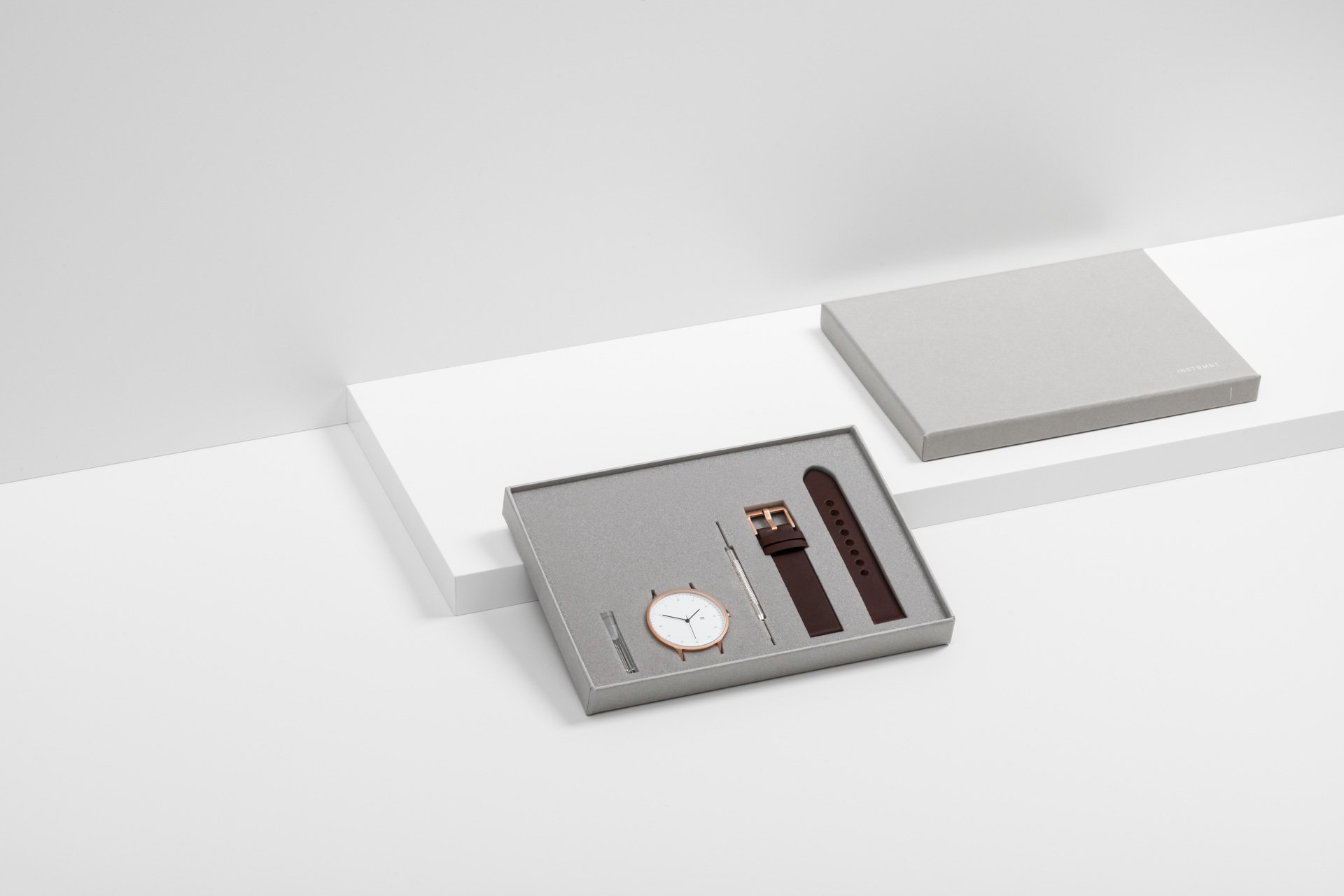 I’m proud to say it came from a practical consideration. When we launched Instrmnt, we were poor graduate designers, but did not want to cut corners in order to save money. Instead, we tried to make cost savings on the less important things, such as postage and parcel packaging. By standardizing the size of our watch box (DVD casing size), we could buy mass-produced shipping mailers that cost pennies and would fit through any mailbox. Given the box dimensions, watch components had to be laid out horizontally. We loved the aesthetic and the reasoning behind it—literally making an instrument that the customer could construct themselves and thereby giving them more ownership of the product.