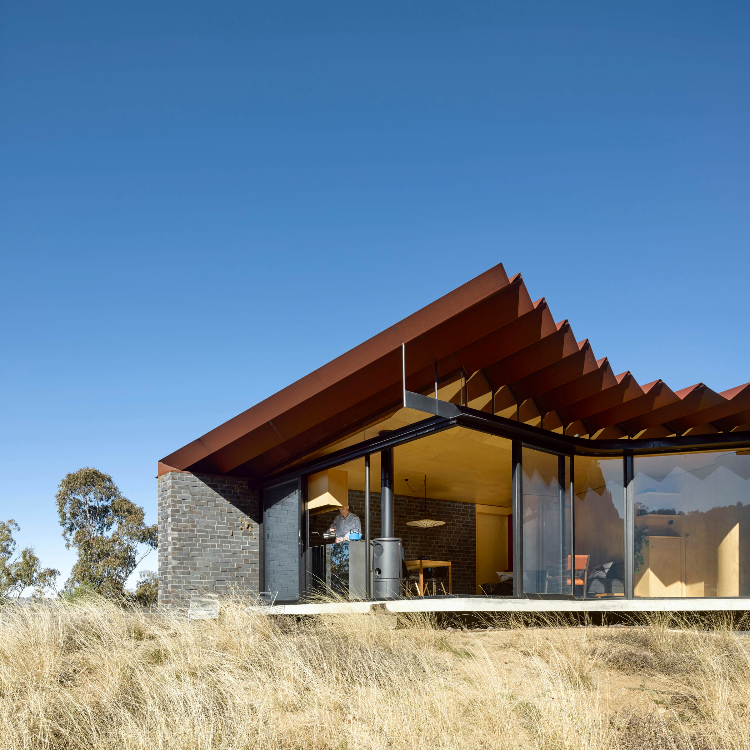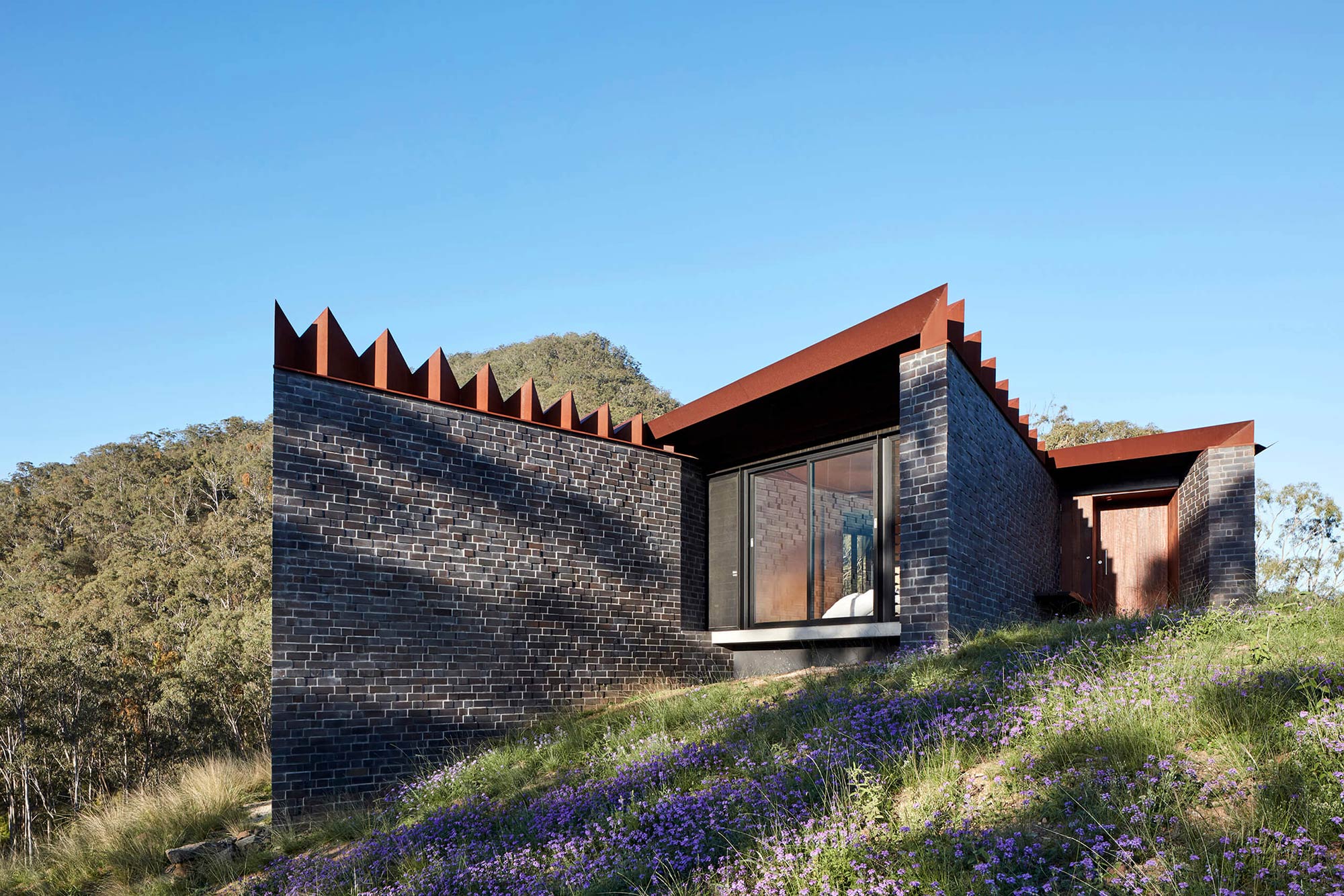 Located in a rocky but forested area in Killarney, Queensland, the Bellbird Retreat is an award-winning, creatively designed house. Australia-based architecture and design firm Steendijk envisioned the weekend retreat as a getaway from urban living. The site, in a bushfire-prone area, guided the entire concept for the cabin, from shape and size to the choice of materials. Built halfway up a mountain, the retreat opens to stunning views of the surrounding woodland and mountainous landscape. Seen from above, the building resembles the open wing of a bird. The angular volumes feature gray brick walls that shelter the living spaces from bushfires and also give a beautiful texture to the exterior. A Corten steel roof with a striking zig-zag pattern tops the structure; its distinctive design has a functional, fire prevention purpose as well as an aesthetic one.