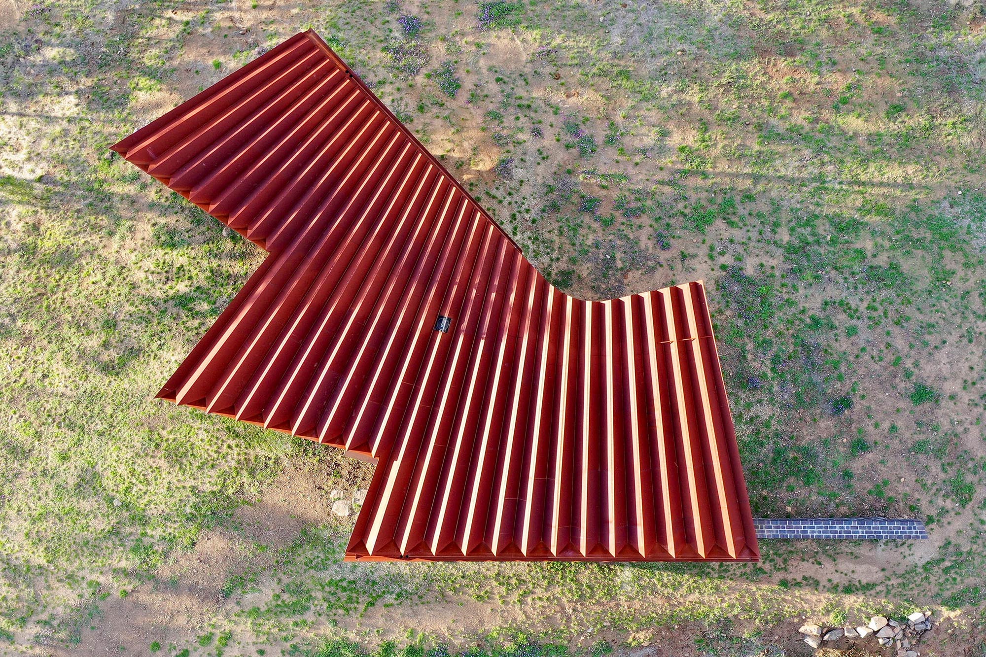 Contrasting the sharp steel and brick elements, the house features curved floor-to-ceiling glazing that immerses the inhabitants into nature. The light-filled interiors are both compact and comfortable. The glass doors slide to open the retreat to the surroundings and extend the living spaces. Apart from the kitchen, small dining area, and lounge space, the house also contains two bedrooms and a bathroom. While the bedrooms feature openings that frame views of the morning sun, the bathroom has a skylight. A curved metal sheet creates the shower area and reflects the natural light and the colors of the sky.