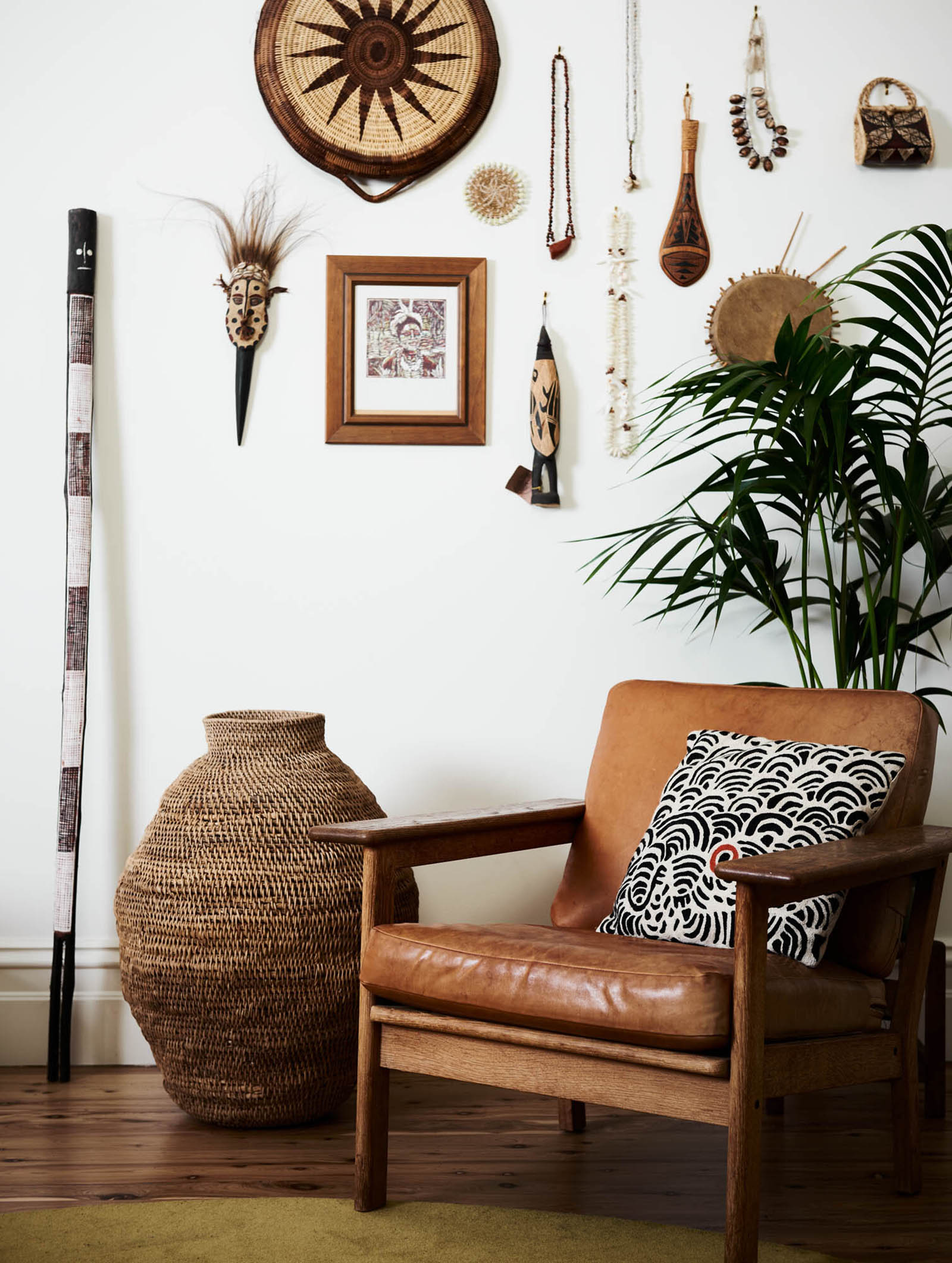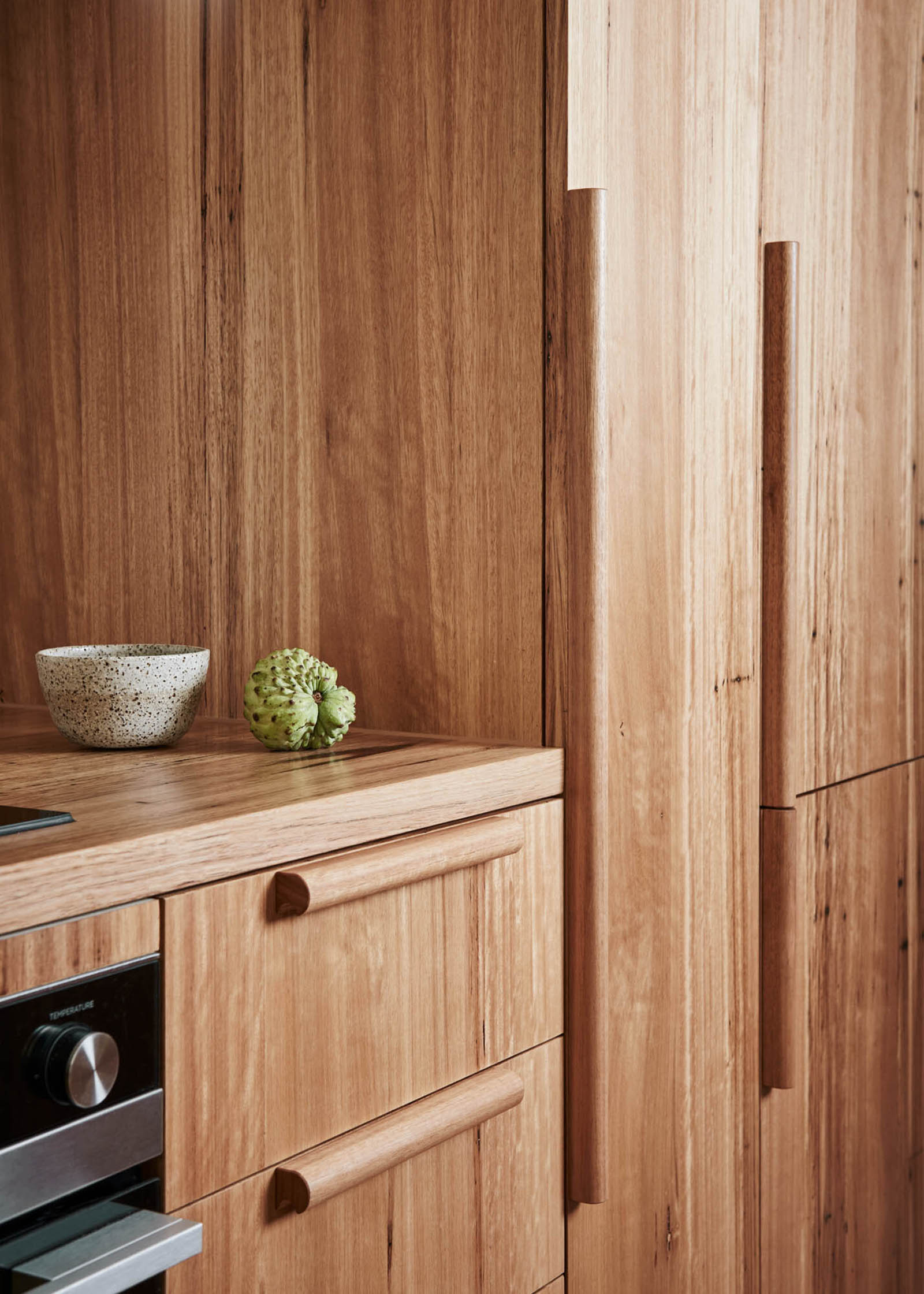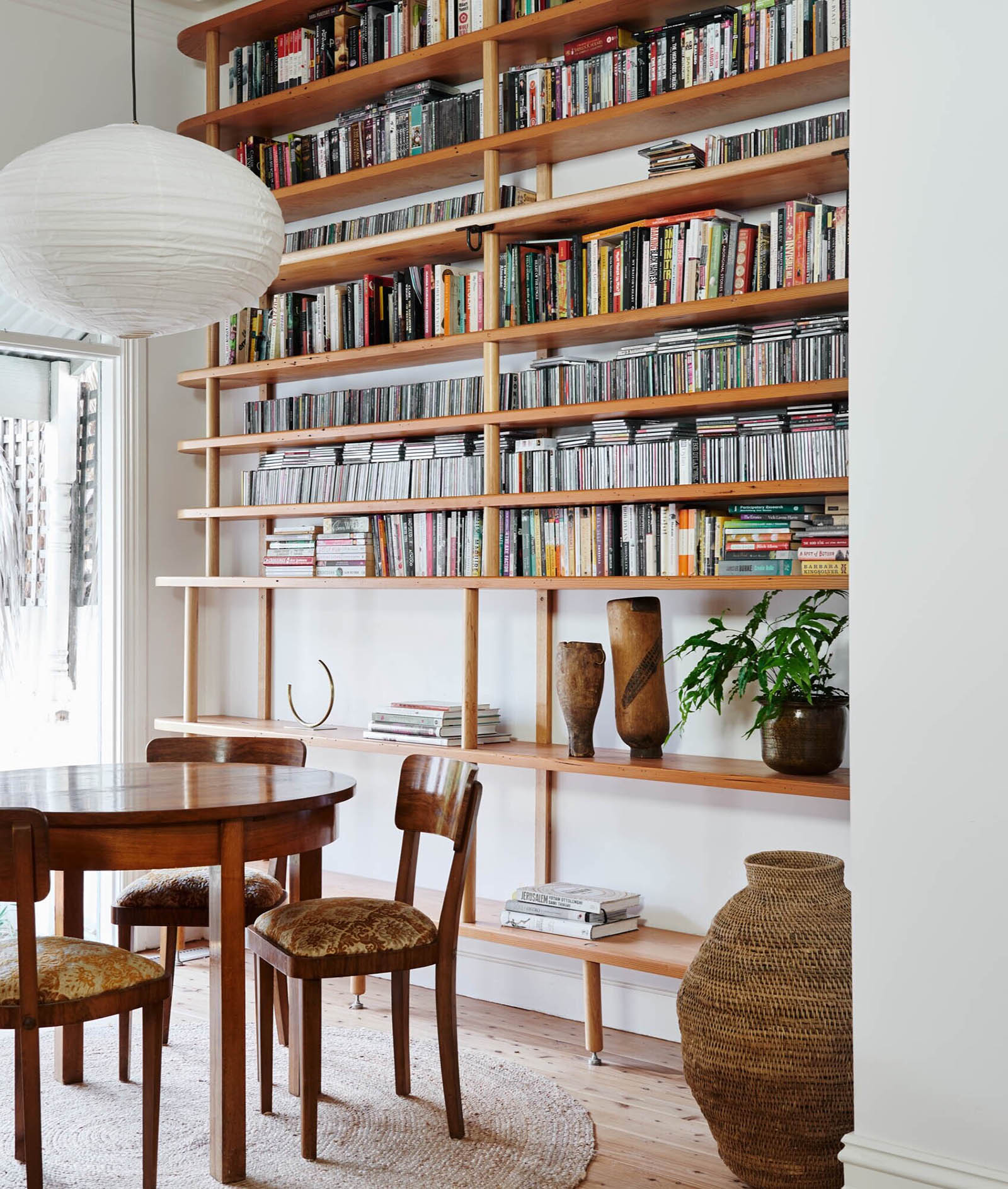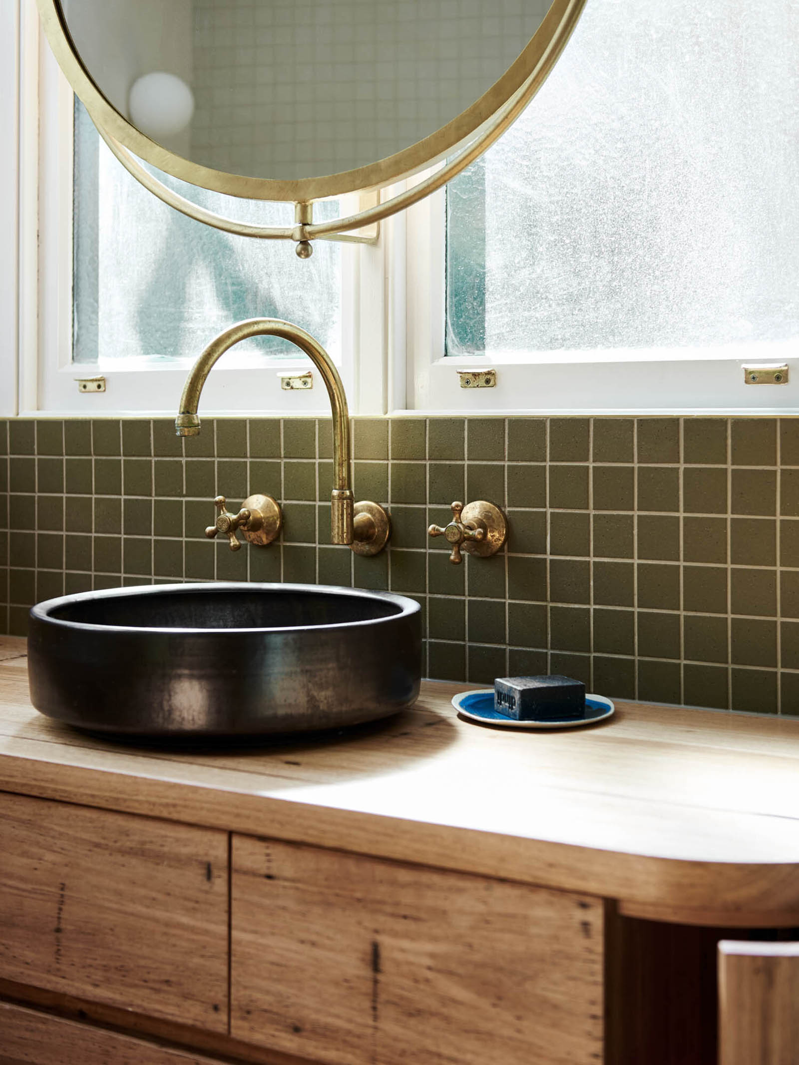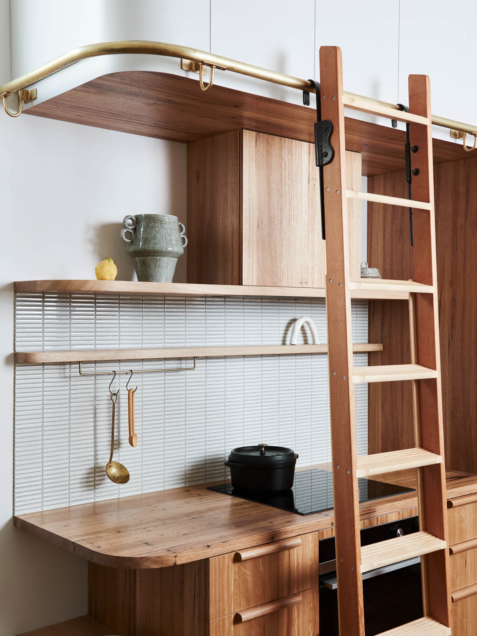 Drawing inspiration from the Australian bush, the designer used a palette of natural materials and colors throughout the house. The kitchen features custom joinery with a blend of clean lines and elegant curves. While the kitchen island with a built-in bar boasts a curved silhouette, the ceiling-height cabinets feature rounded shapes. A ladder with a brass rail support offers easy access to the storage areas at the top. The designer also cut back an internal wall to greatly improve the brightness of the kitchen and its connection to the courtyard.