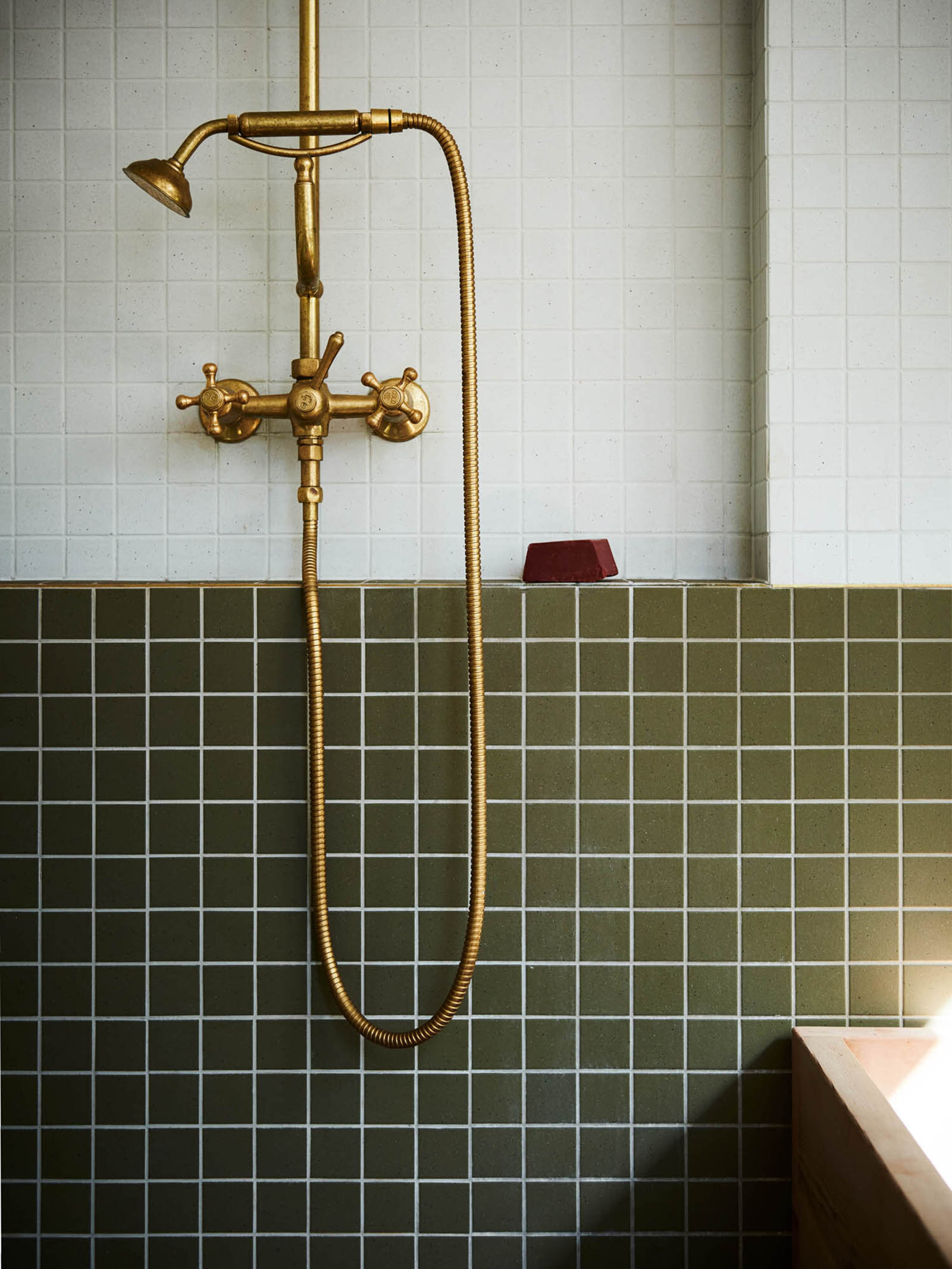 The bathroom and laundry room feature wooden cabinets and furniture as well as splashes of green hues. While the laundry room boasts aloe vera and olive shades, the modern bathroom features darker green tiles. Other stylish features include a pressed metal ceiling, dark gray flooring, and a Japanese-style wood soaking bath. The redesign project also focused on sustainability; for example, the designer used recycled wood and replaced the old gas burners in the kitchen with a modern, energy efficient induction stove. Photography© Lisa Cohen.