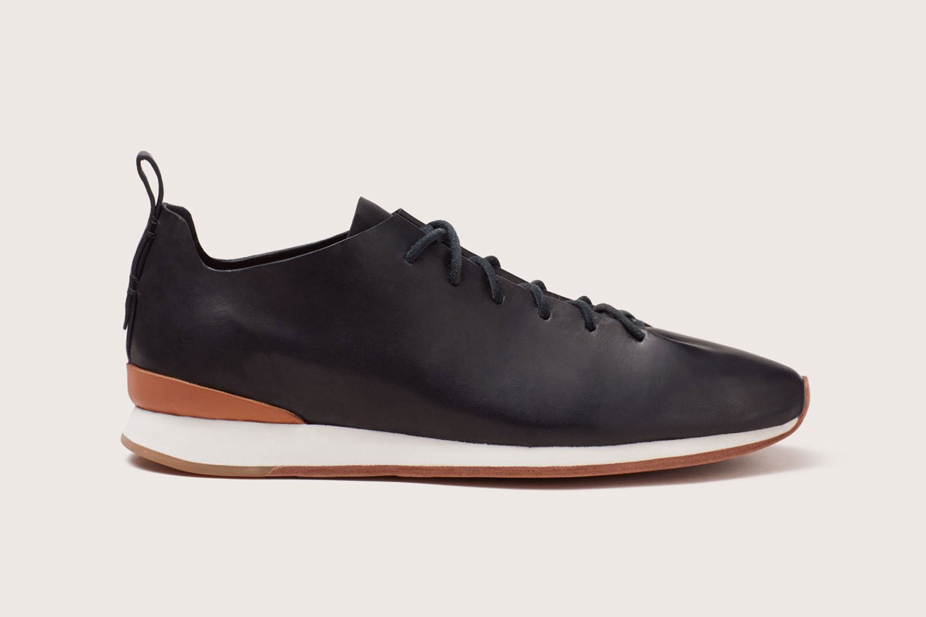 Feit shoes are always beautifully handcrafted, but the impeccable craftsmanship is especially obvious with these Black Runner Sneakers. The upper is semi-cordovan leather in black with a round toe and features a tan leather trim, a leather pull loop, and top stitching at the heel. A white midsole adds a bold contrast to the minimalist design, while the outsole that combines rubber and tan leather completes this handmade sneaker.