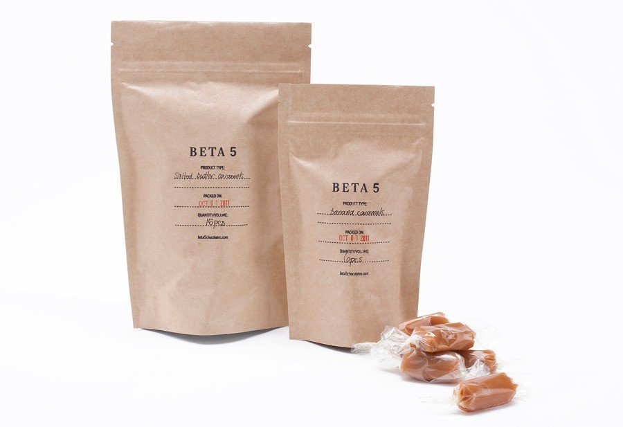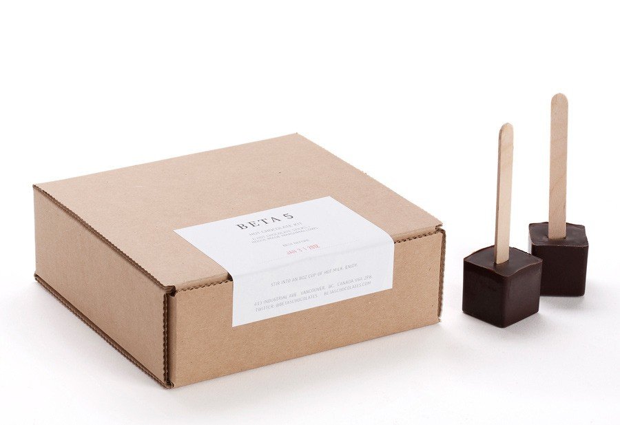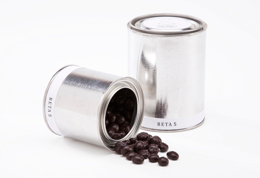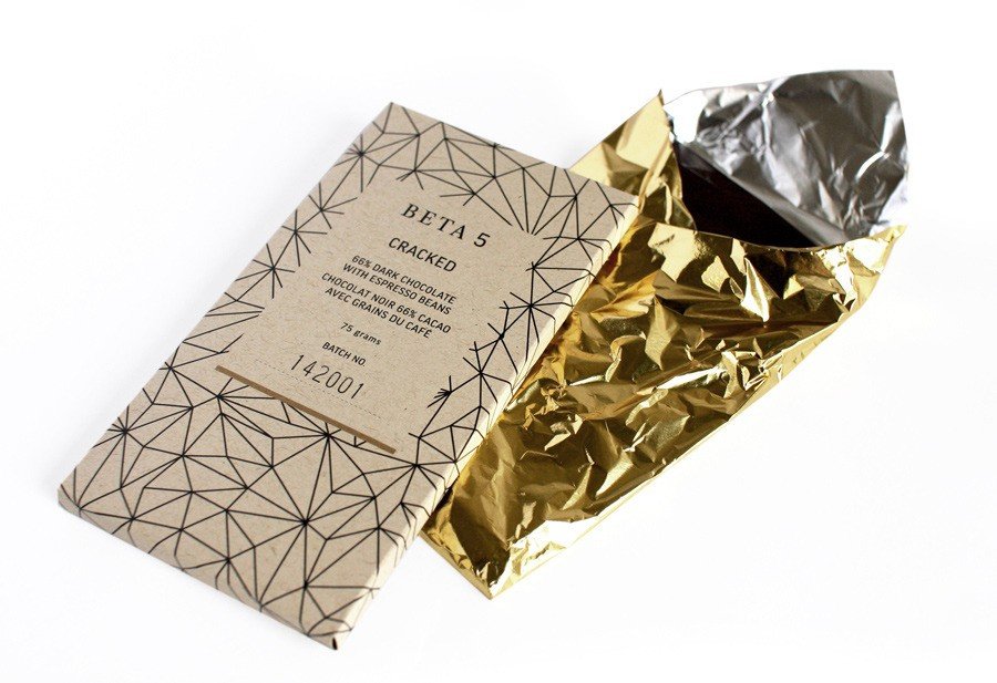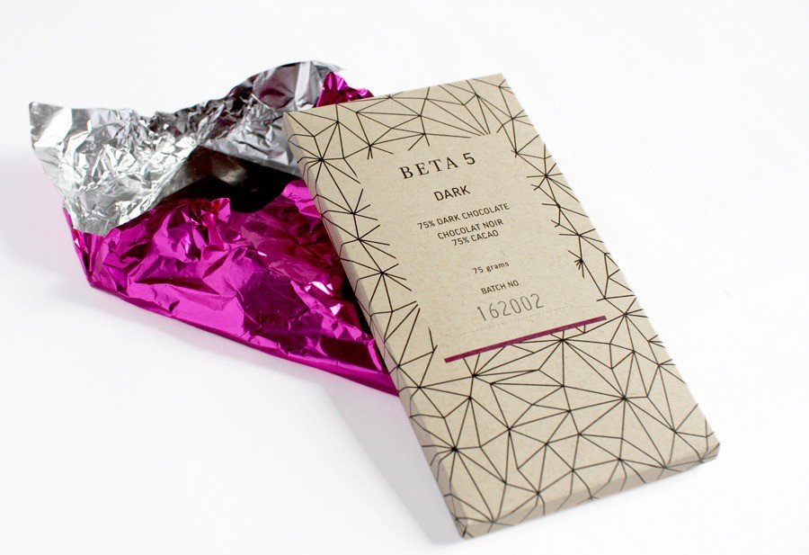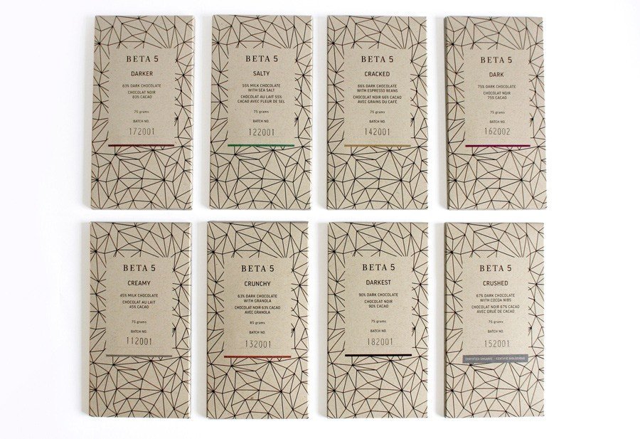 Chocolate has never looked better! The sinfully delicious candy from Beta 5 gets a makeover from Glasfurd & Walker, and has become ever the more tempting. Known for their high-end work in graphic design, Glasfurd & Walker tackles the challenge of designing a look that entices but still yields to the craftsmanship and flavor of the after-dinner treats. The bars of chocolate are wrapped in a vividly vibrant foil – each one color coded for its respective type – while the paper casing on the outside displays a simple geometric pattern and a stripe of that shiny foil to match. The angular patterns are a motif that appears on the box for Valentine’s chocolates and other items as well, as if the graphic encourages the buyer to break off a piece of chocolate and succumb to a sweet tooth. The name Beta 5 is derived from the form-5 beta crystal structure, the most stable of cocoa butter crystallization; but really, the science takes a back seat when it comes to the delectable product and attractive packaging. Beta 5 also produces baked goods and preserves, and the jars of marmalade and bags of caramels are in the same butcher paper brown, accented with chrome and white. For those who are counting the calories… well, this is a splurge worth spending. Buy here