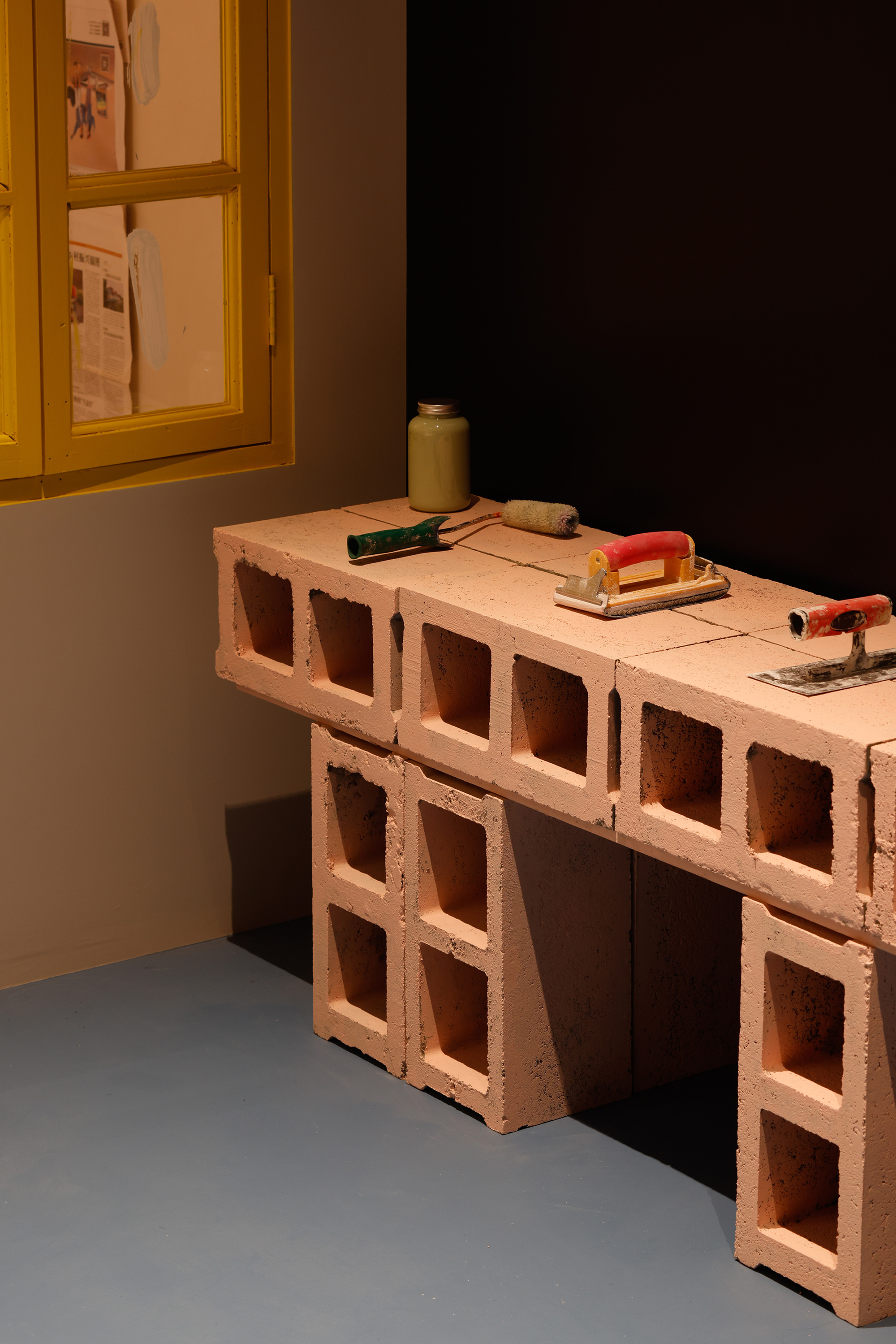 Salvaged from an abandoned local building, a vintage window with a yellow frame offers a view into the lounge area. On the glass, the white marks left during the construction phase were embraced by the designer and preserved as a Malevich-style element. Elsewhere, thin plastic sheets cover pastel-hued objects; a white curtain boasts splashes of bright paint; and paint brushes dipped in different colors showcase the company’s palette in a fun way. Photography by Yunmian Photography Studio.