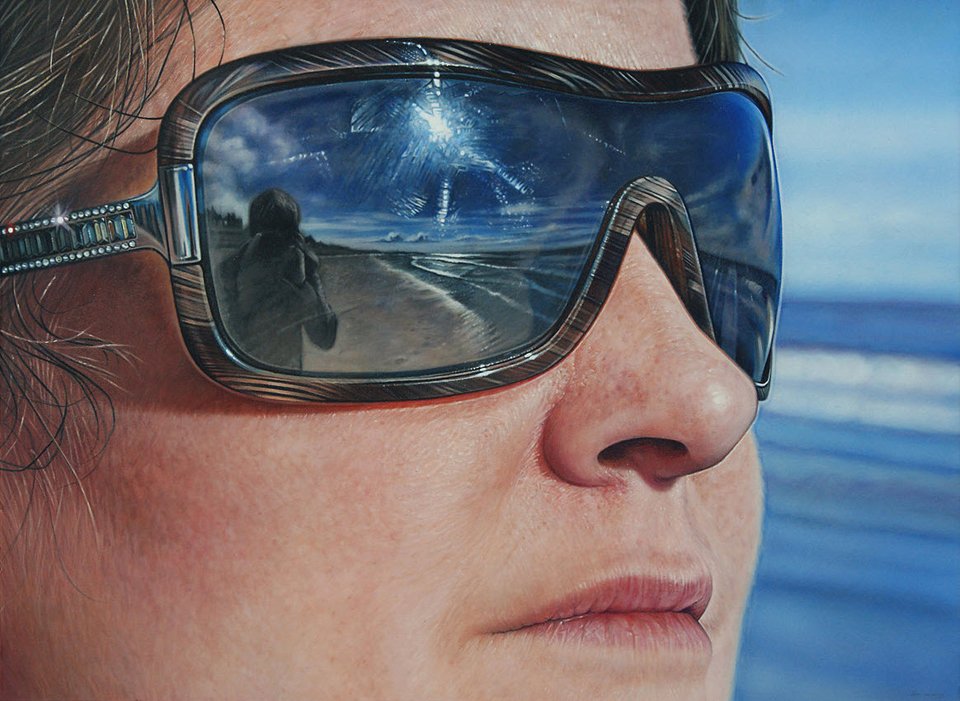 You will barely believe your eyes at the sharp paintings by Simon Hennessey from Birmingham, UK. He capitalizes on reflections in sunglasses to portray the city scape or culture. “Constructing my own interpretations of a reality results in blurring the boundaries of what is real and what is made up. I use the camera only as a source to assist me with gathering information.” The crystal clear imagery accentuate strands of hair, skin pores, and every glittering detail on the glasses lens. It is the phenomena of a more-than-real-life zoom in. Nowhere else can we find such immaculate takes on a day in the sun.