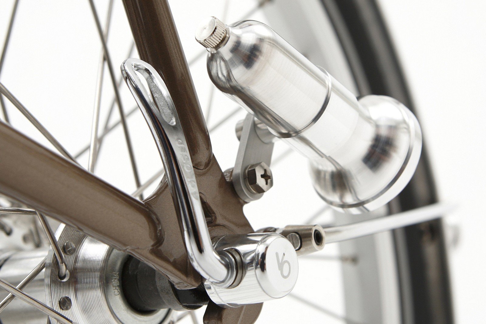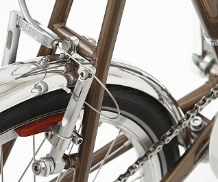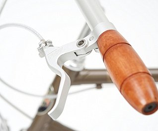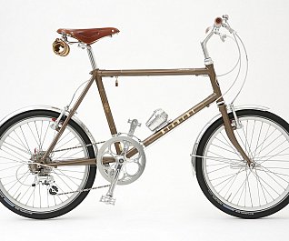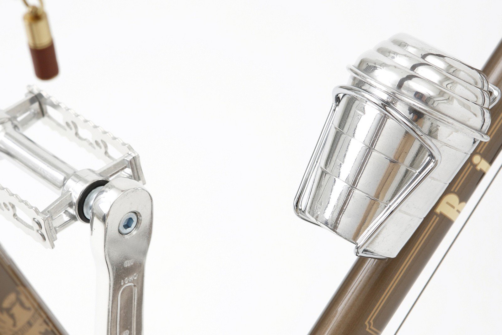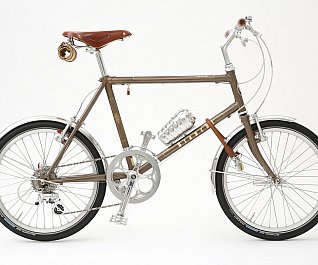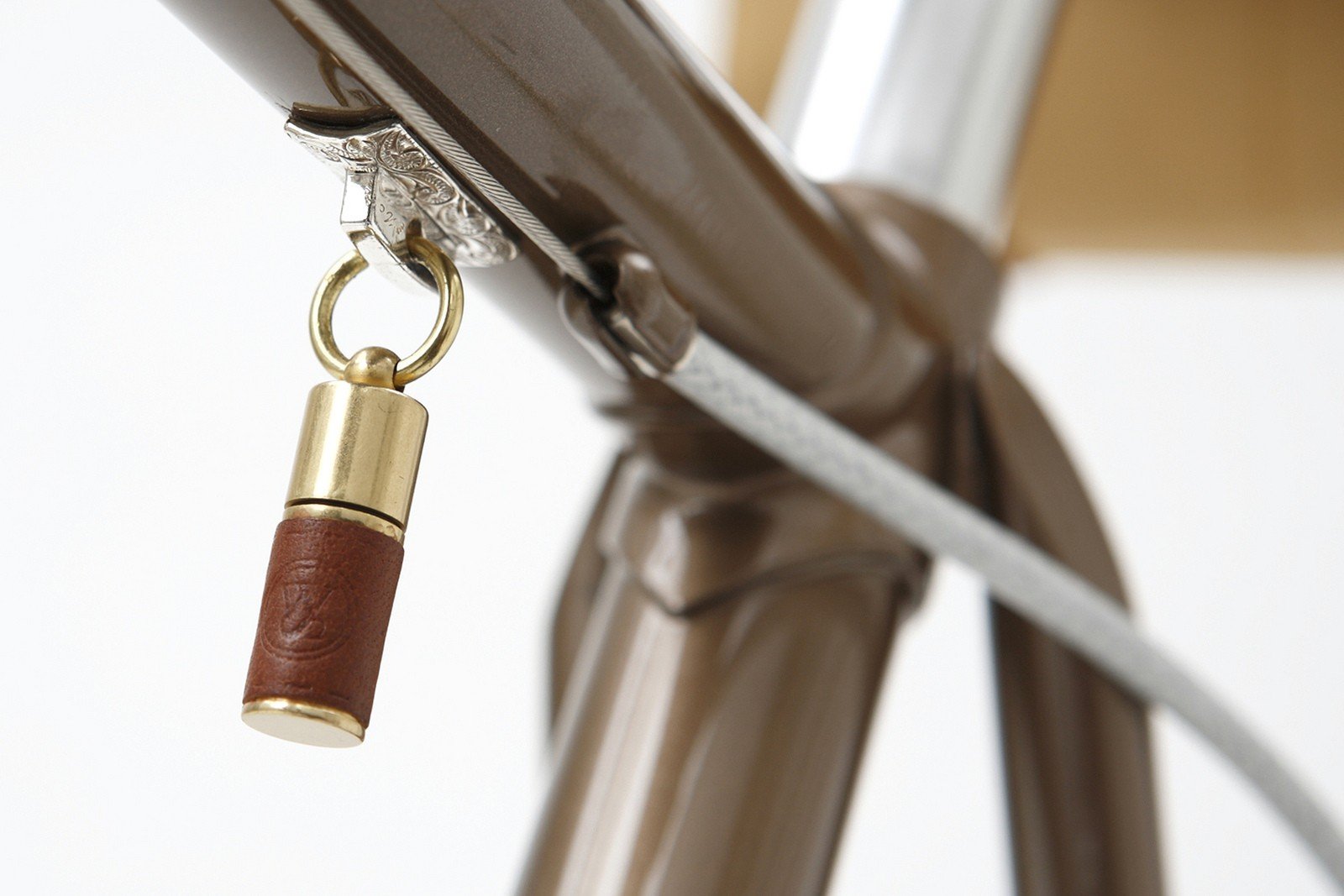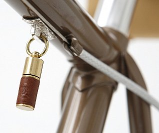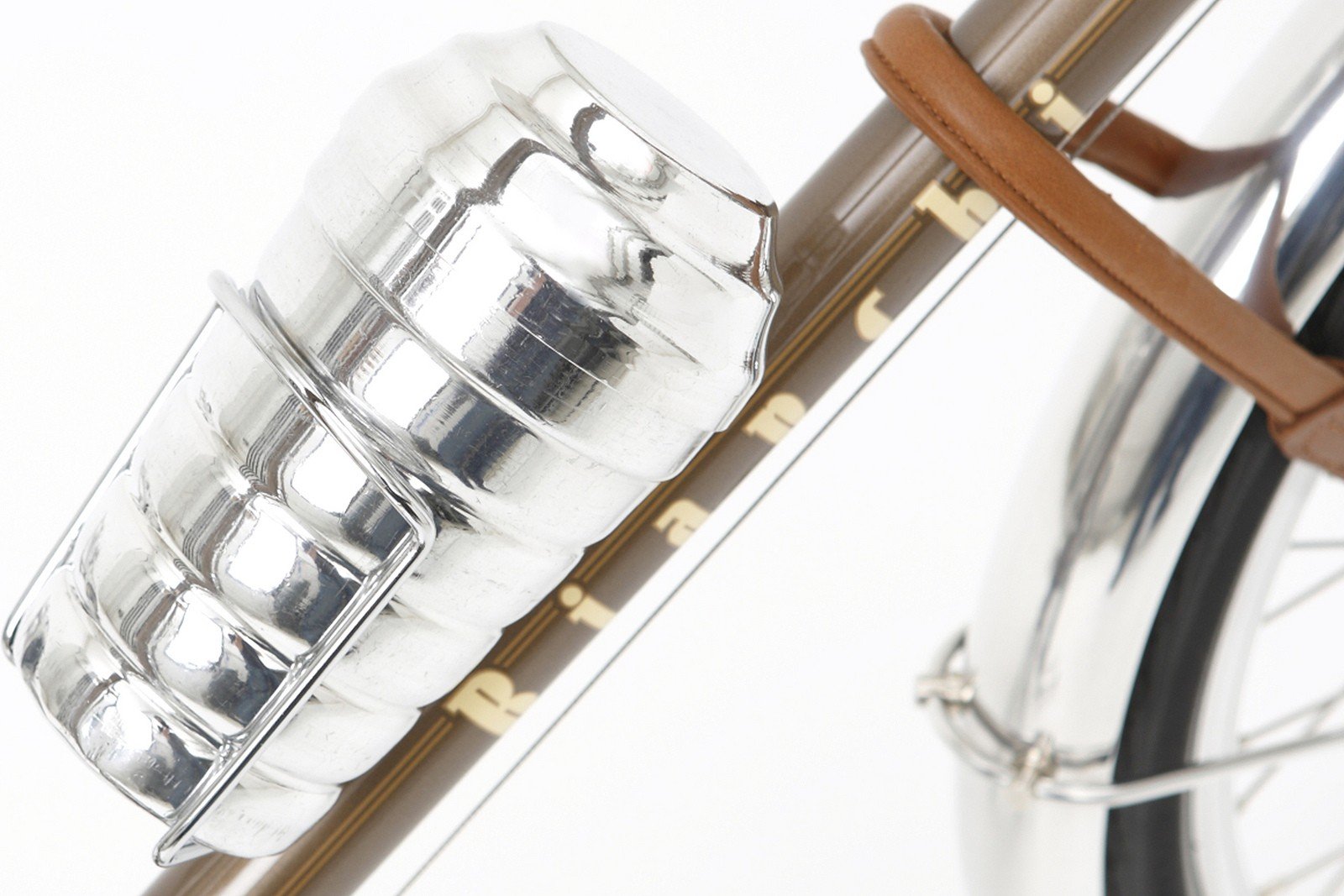 “She’s So Charming!” is the tagline that renovations enthusiast Jin “Buick” Hidaka has given to his Bianchi Mini Velo-7, a bicycle that now sports panache and sass in addition to function. The vehicle has both charm and charms alike, and is fitted with a number of vintage pieces that add a bit of shine to the ordinary and a hint of old-world sophistication to the modern. A small aluminum bottle and cage of a 1950s American design is an upgrade from a typical plastic fixture, and a vintage padlock from Henry Squire & Sons of the UK hangs on leather straps as a cable-lock alternative. The seat of the bicycle is an upscale leather Brooks saddle and is accompanied by a 1980s Garrick Anderson tool roll in the same natural palette. Hidaka also embellishes with new items such as orange LED headlights in a retro aluminum casing that blends nicely with the mix of hardware. Wooden handle grips from Abici Miele allow the rider to cruise in style on a bicycle that is equipped for the road and accessorized for the runway.