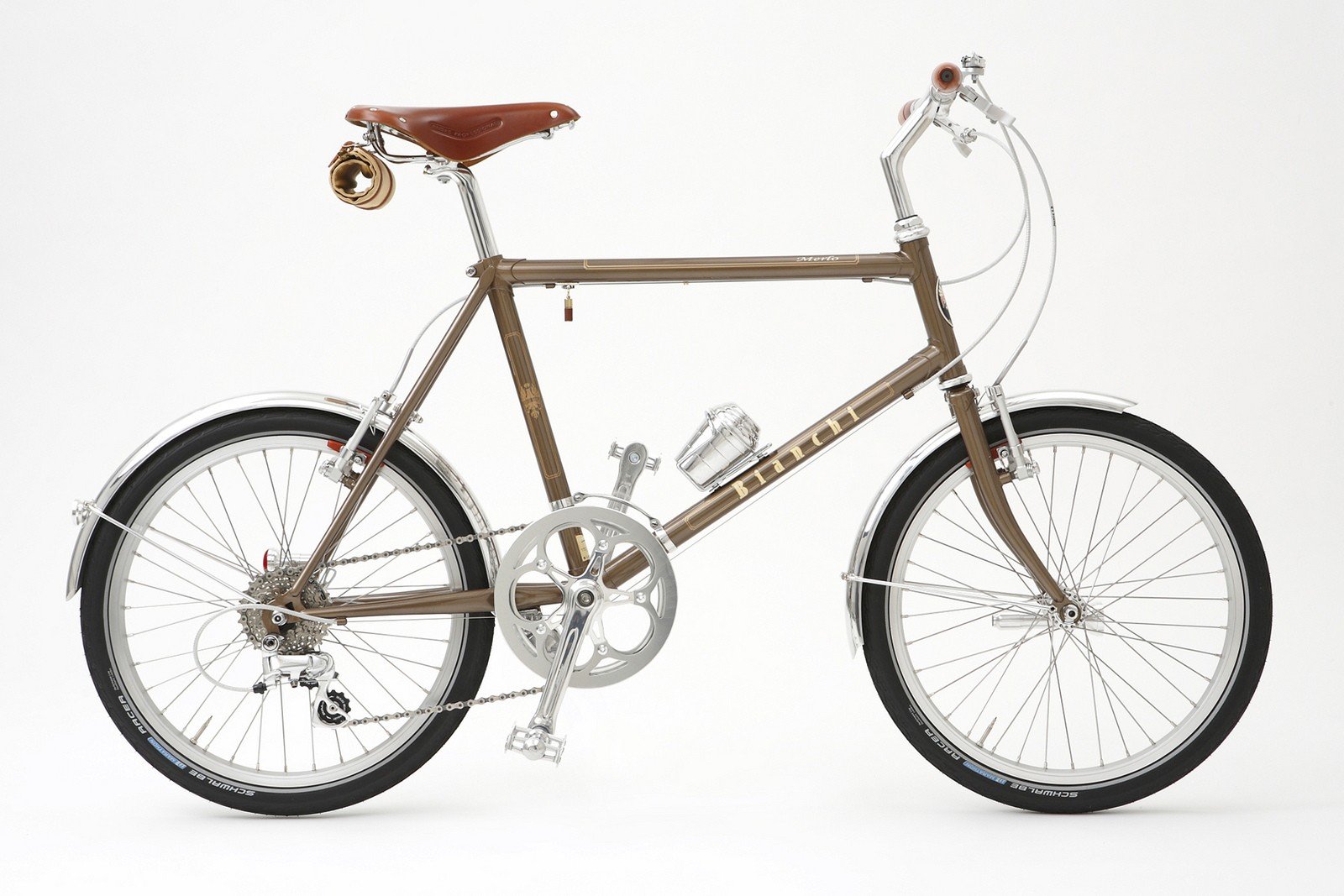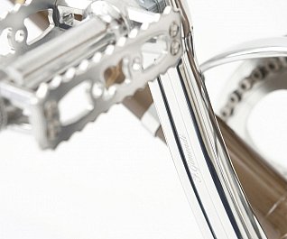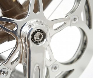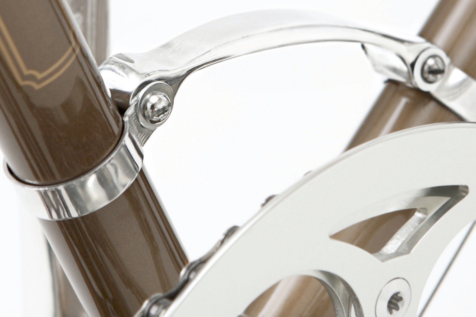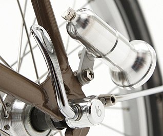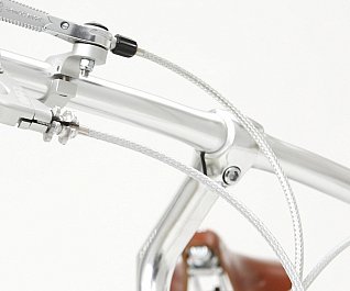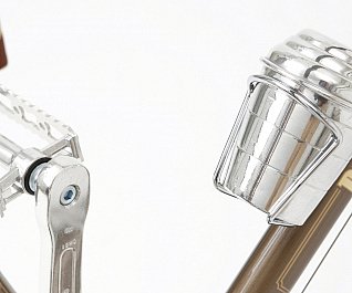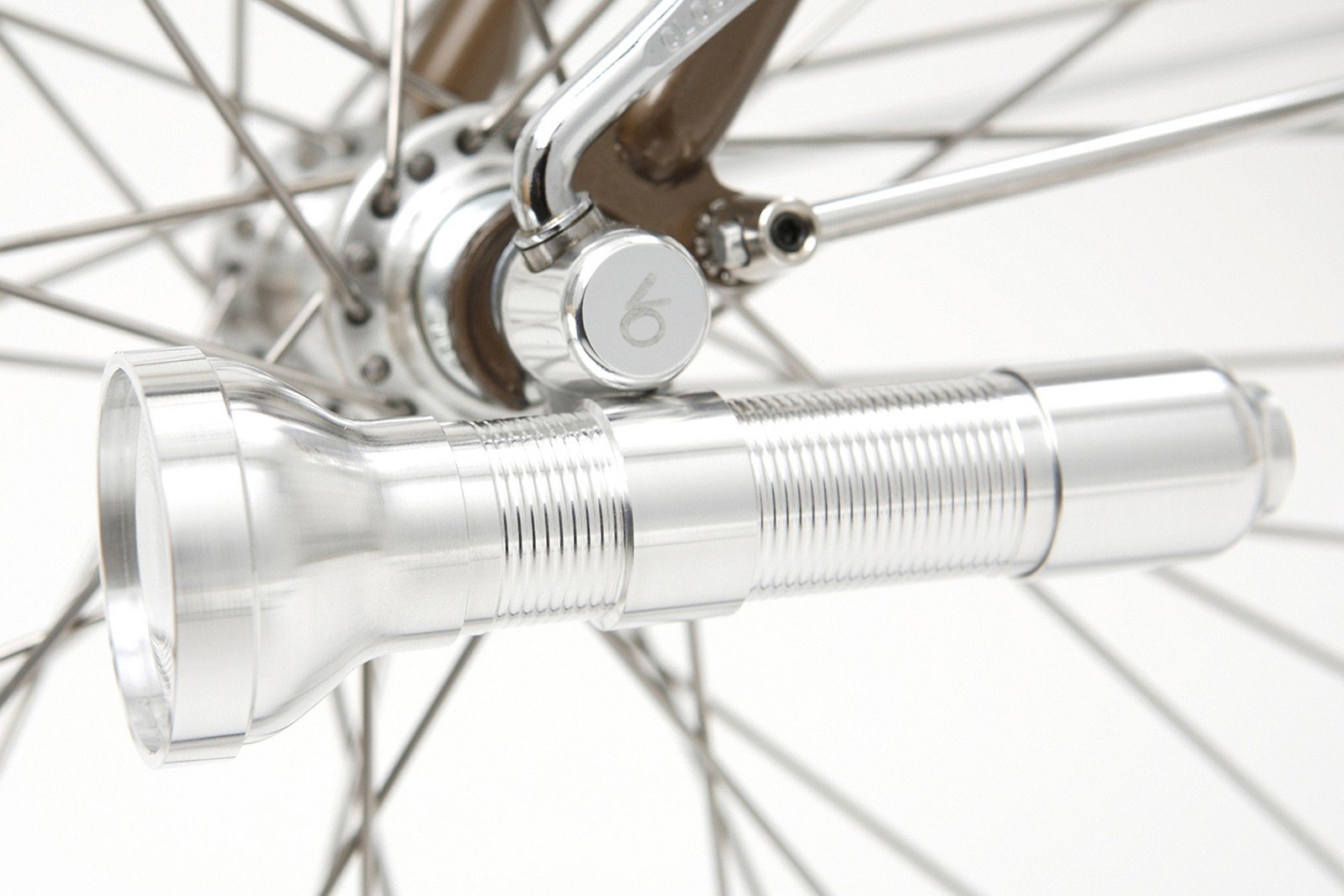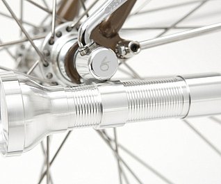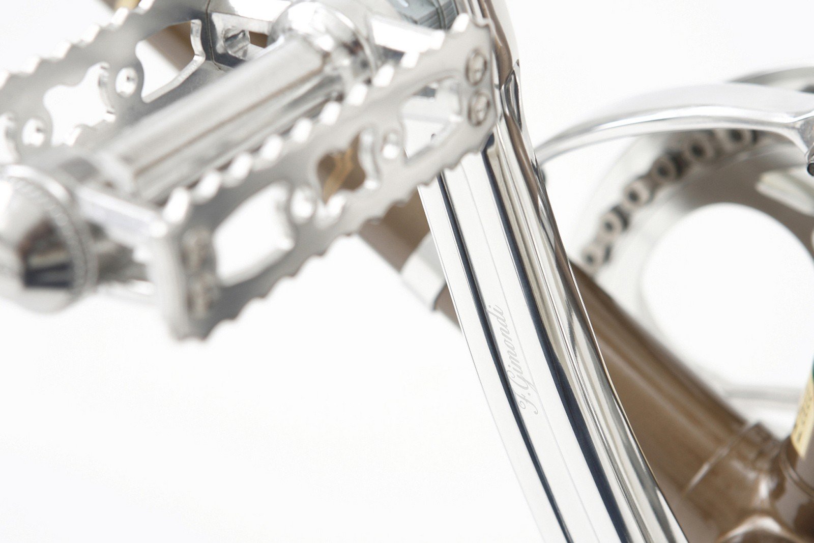 “She’s So Charming!” is the tagline that renovations enthusiast Jin “Buick” Hidaka has given to his Bianchi Mini Velo-7, a bicycle that now sports panache and sass in addition to function. The vehicle has both charm and charms alike, and is fitted with a number of vintage pieces that add a bit of shine to the ordinary and a hint of old-world sophistication to the modern. A small aluminum bottle and cage of a 1950s American design is an upgrade from a typical plastic fixture, and a vintage padlock from Henry Squire & Sons of the UK hangs on leather straps as a cable-lock alternative. The seat of the bicycle is an upscale leather Brooks saddle and is accompanied by a 1980s Garrick Anderson tool roll in the same natural palette. Hidaka also embellishes with new items such as orange LED headlights in a retro aluminum casing that blends nicely with the mix of hardware. Wooden handle grips from Abici Miele allow the rider to cruise in style on a bicycle that is equipped for the road and accessorized for the runway.