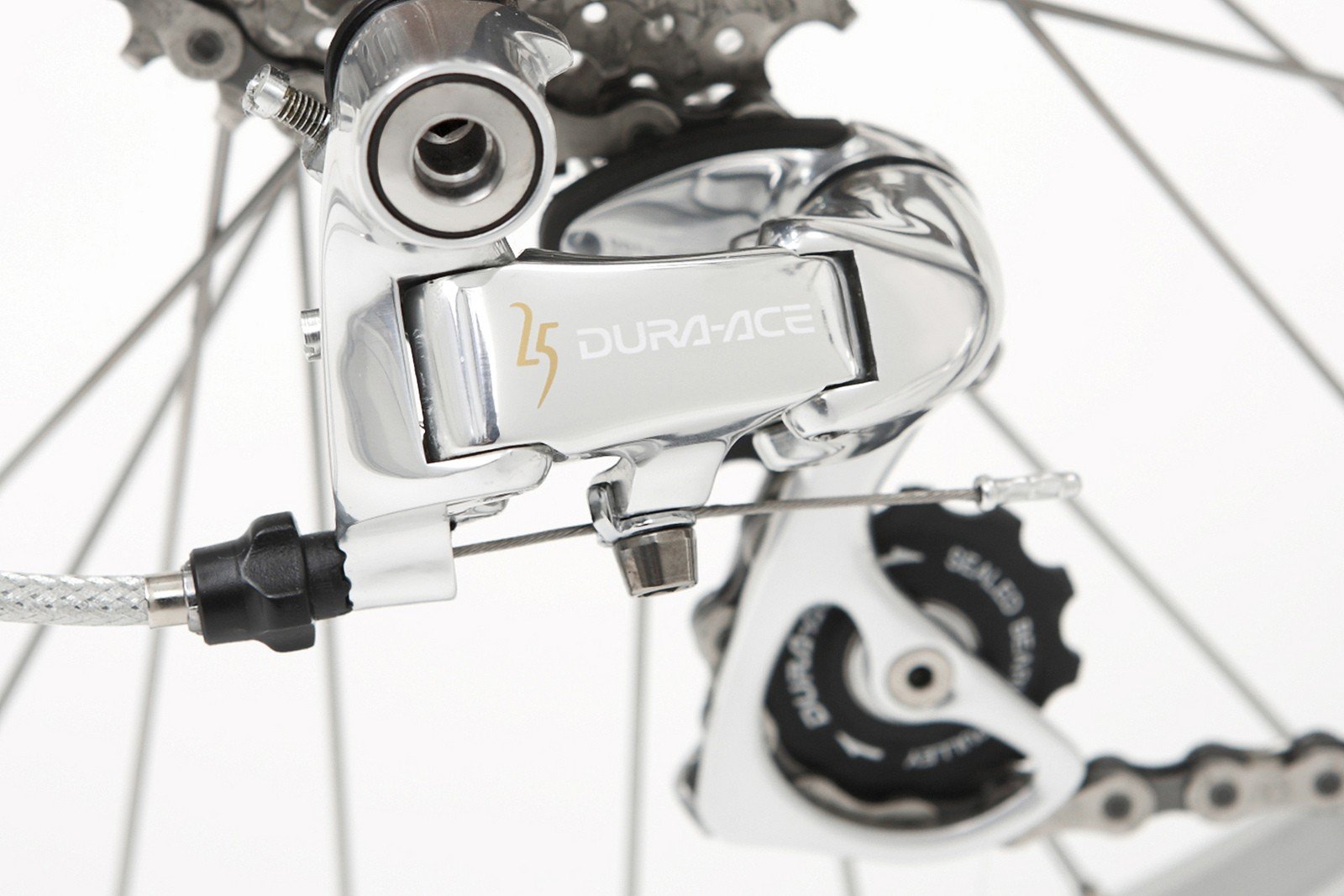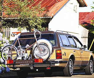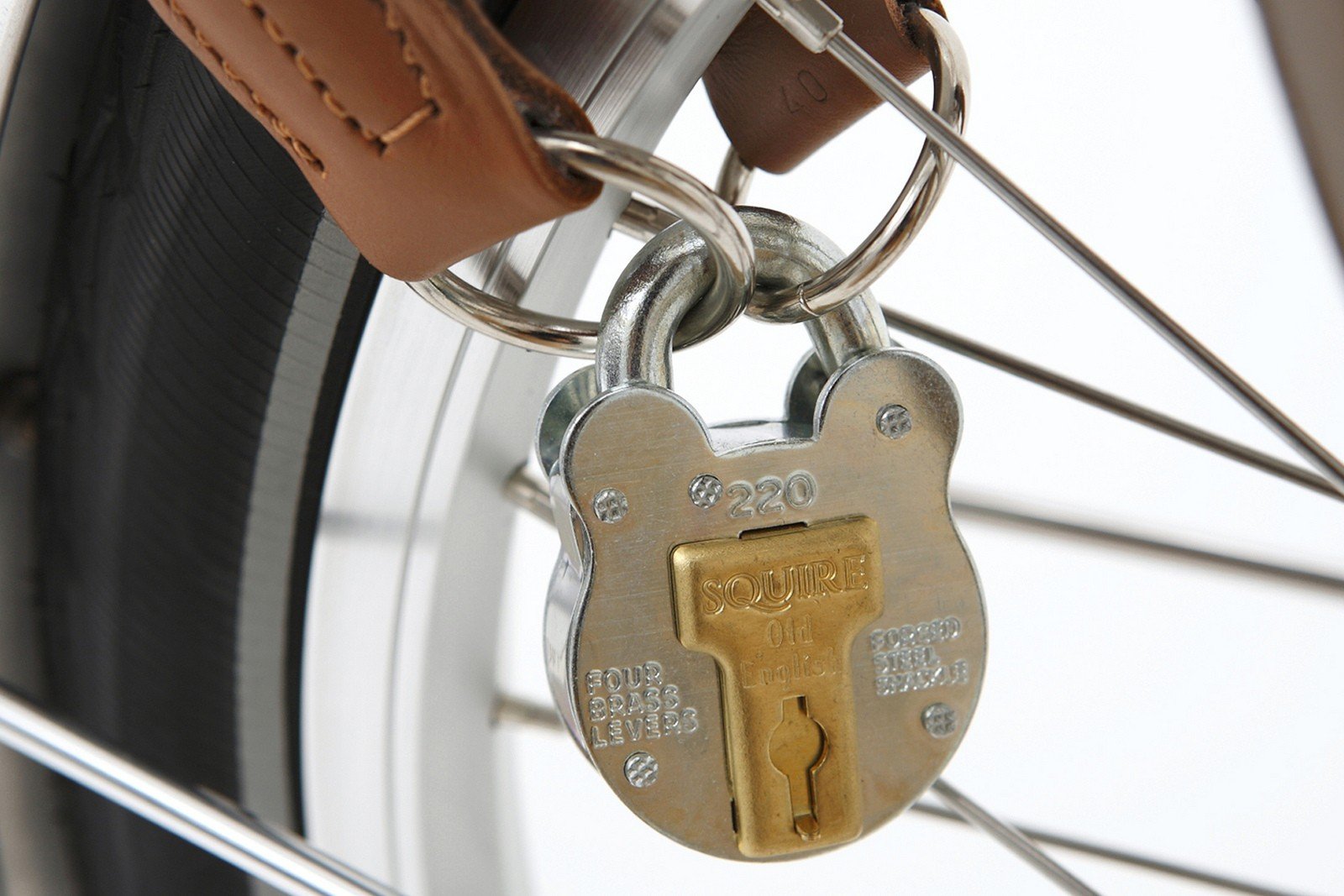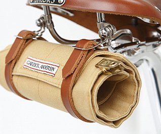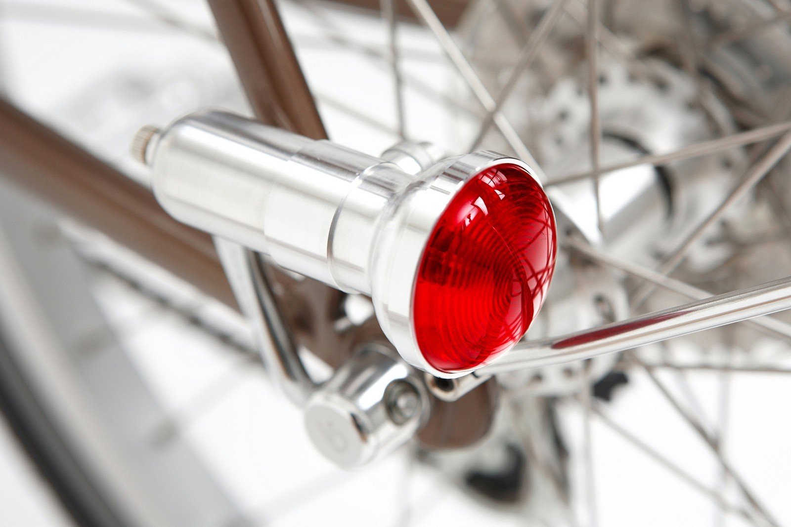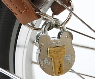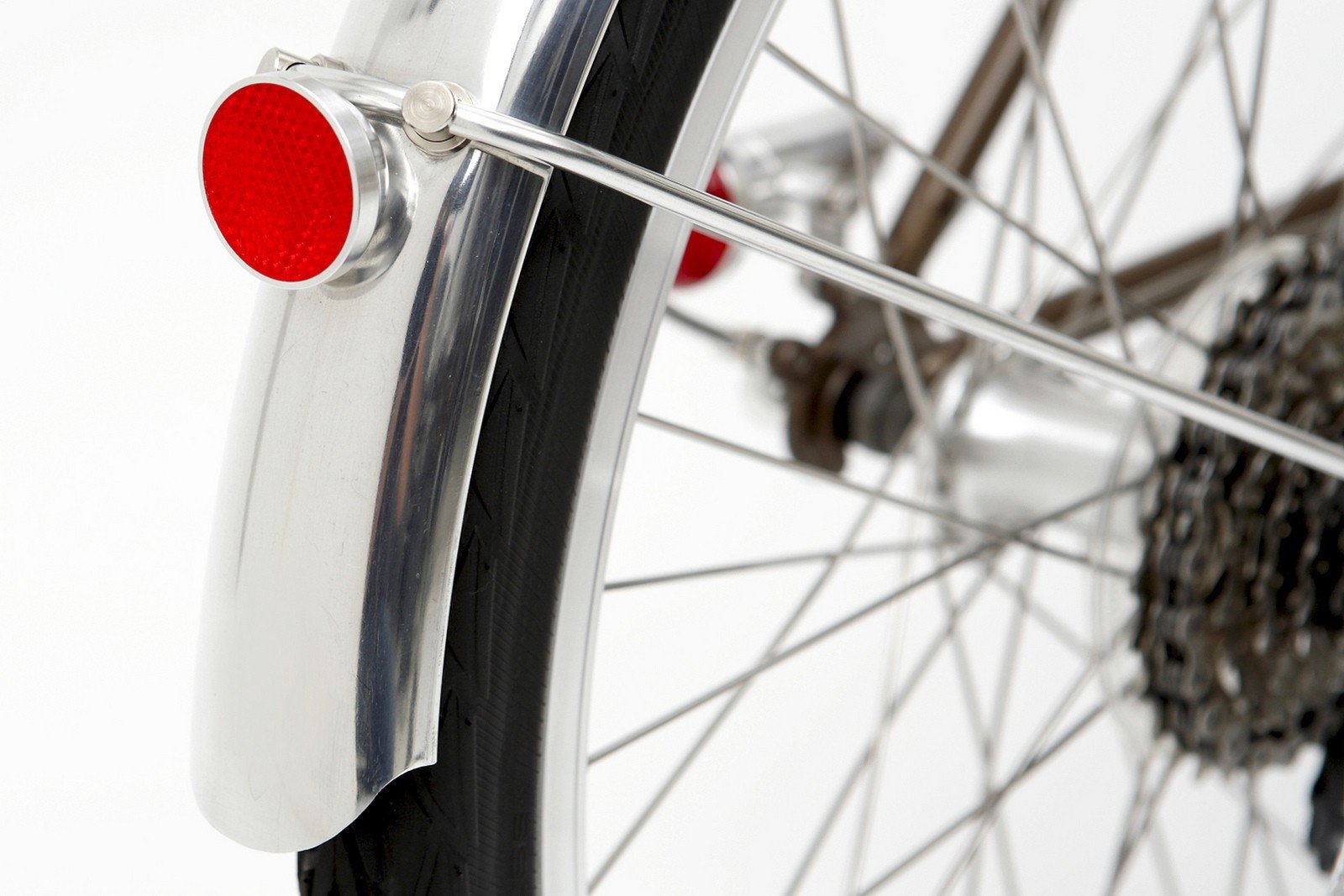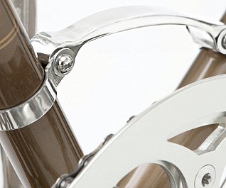 “She’s So Charming!” is the tagline that renovations enthusiast Jin “Buick” Hidaka has given to his Bianchi Mini Velo-7, a bicycle that now sports panache and sass in addition to function. The vehicle has both charm and charms alike, and is fitted with a number of vintage pieces that add a bit of shine to the ordinary and a hint of old-world sophistication to the modern. A small aluminum bottle and cage of a 1950s American design is an upgrade from a typical plastic fixture, and a vintage padlock from Henry Squire & Sons of the UK hangs on leather straps as a cable-lock alternative. The seat of the bicycle is an upscale leather Brooks saddle and is accompanied by a 1980s Garrick Anderson tool roll in the same natural palette. Hidaka also embellishes with new items such as orange LED headlights in a retro aluminum casing that blends nicely with the mix of hardware. Wooden handle grips from Abici Miele allow the rider to cruise in style on a bicycle that is equipped for the road and accessorized for the runway.