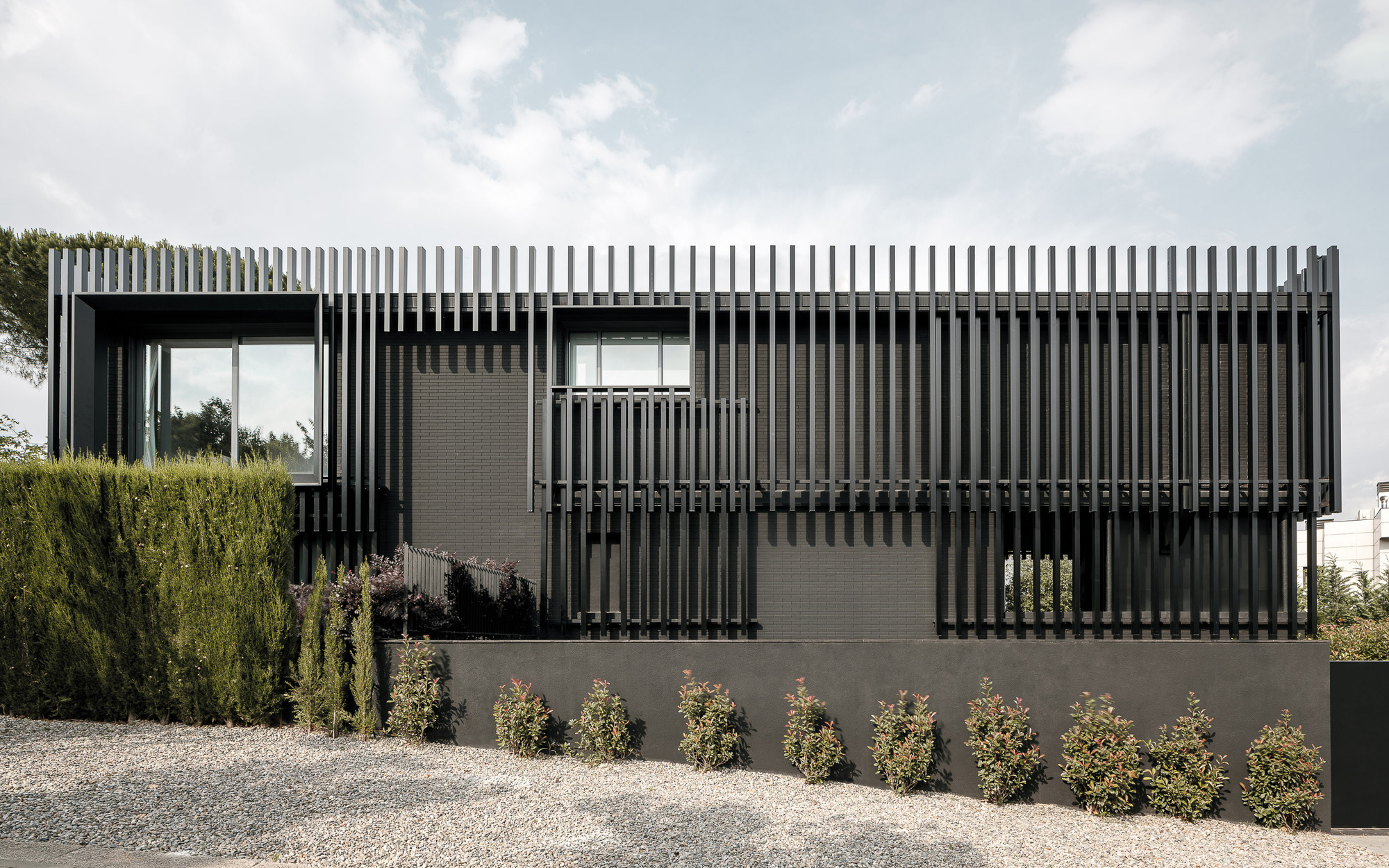 A house redesigned with vertical strips and black brick walls.