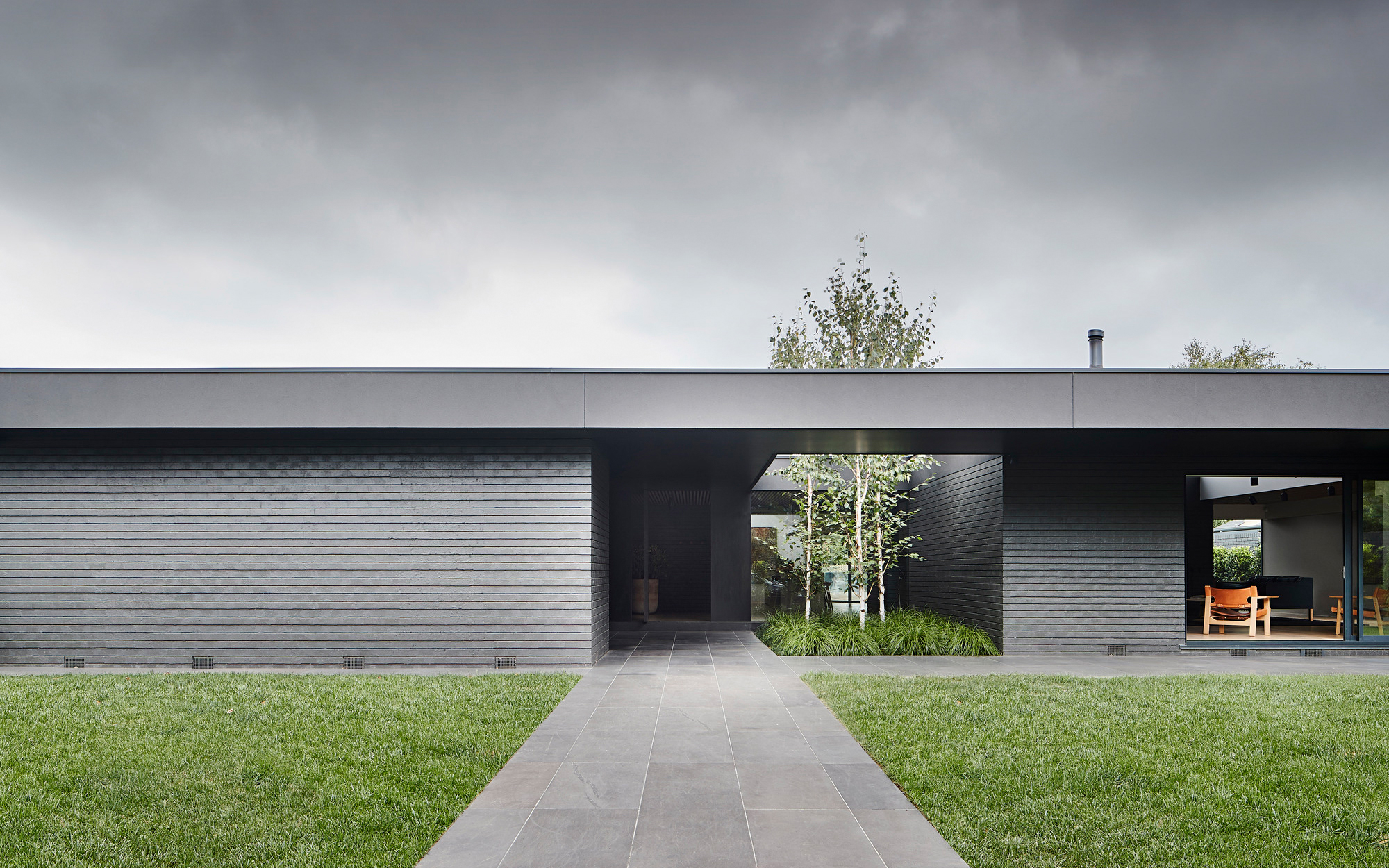 Located in Malvern, Australia, this house was built in the 1970s and needed a makeover to bring its original purist forms back to life. studiofour redesigned the dwelling to create a home full of warmth and character. The project also focused on exploring the concept of hygge, in a nod to the clients’ Danish heritage. Apart from painting the brown brick walls in dark gray and black, the studio also designed oversized eaves that accentuate the horizontal plane.