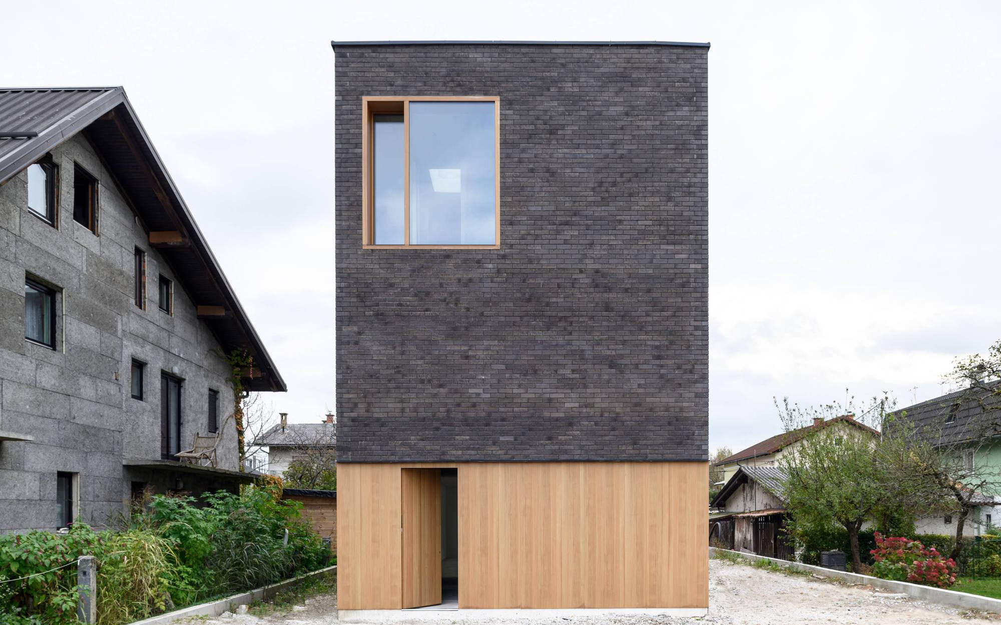 With this project in the Rožna Dolina district in Ljubljana, Slovenia, architecture studio Arhitektura has consolidated the area’s recent re-urbanization and growth. Previously a prestigious neighborhood, the district begun to degrade from the 1930s and became filled with low-quality housing, workshops, and flimsy structures. Double Brick House is a breath of fresh air in this setting. Created for two families, the black brick house makes the most of the long and narrow plot. Designed with an almost monolithic presence, this modern home boasts dark walls punctuated by wood-framed windows and voids that create a dynamic rhythm. The two identical residential units have three stories. On the top floor, the master bedrooms have access to terraces that provide a good view of the neighborhood’s skyline.