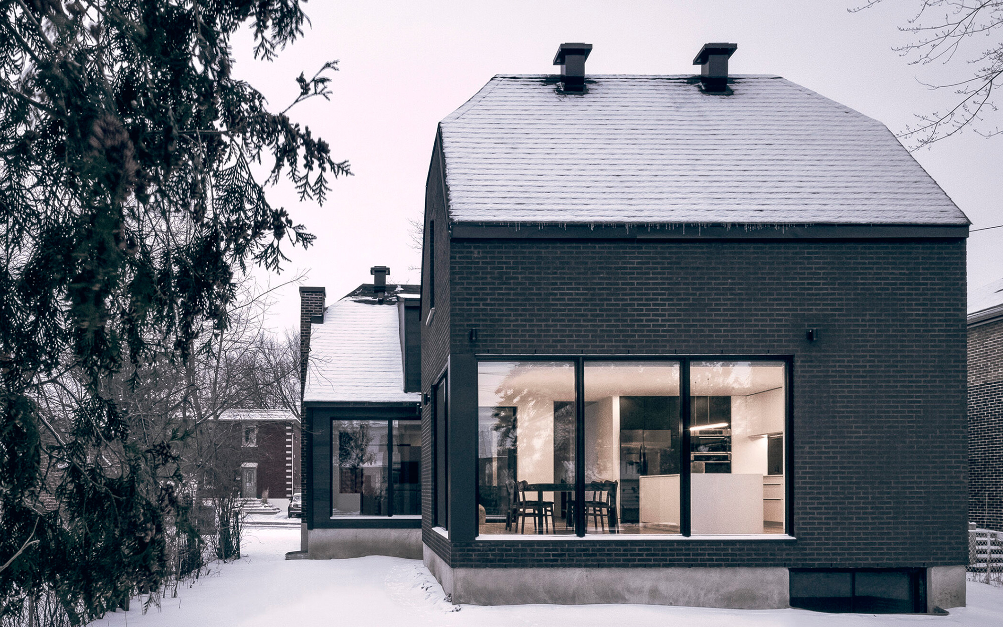 Maison Soeur, or Sister House, is a house that dates back to the 1950s. Montreal-based APPAREIL architecture collaborated closely with the client, architect Catherine Gauthier, to redesign and also expand the dwelling. A new volume extends the living spaces while complementing the character of the original building. Giving a nod to the old house, the extension boasts a matching double-pitched roof and a dark brick exterior. Large windows welcome more natural light inside the new living spaces while framing views of the garden. A glass and metal footbridge links the old and new parts of the house. To contrast the dark exteriors, the interiors feature white walls and neutral colors as well as warm materials like wood. Still, the architects used dark accents throughout, including in the staircase balustrade, sliding glass door frames, and kitchen furniture.