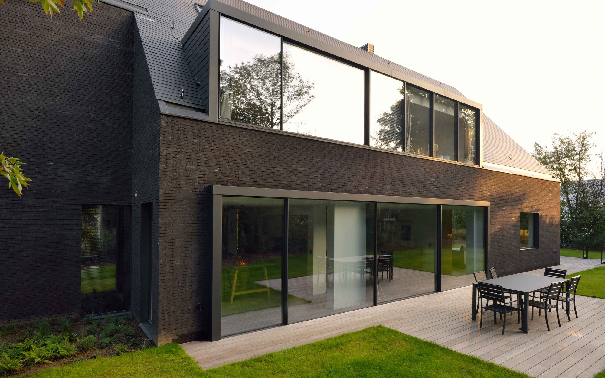 The façade now features openings that welcome nature closer to the house as well as more natural light to the interiors. The architects also used black brick inside the house alongside warm timber and leather. Minimal decorations and no superfluous detailing let the natural materials take center stage. Exceptionally warm, the living spaces flow into one another in layers, creating the feeling of open spaces but without losing their sense of calm and tranquility.