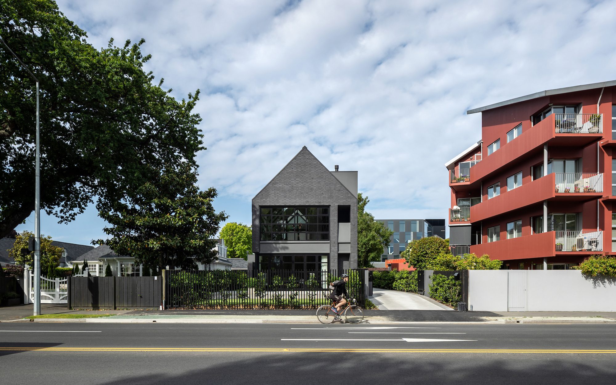 Located in Christchurch, New Zealand, a city ravaged by two earthquakes in consecutive years, this house takes inspiration from vernacular architecture for its distinctive design. Studio PRau a gave homage to Christchurch’s heritage with a townhouse reminiscent of industrial warehouses. The new dwelling has two levels and drastically different facades. While to the south and east the building has an almost opaque brick exterior design, to the north and west it features large windows and carefully placed openings that frame views to an adjacent garden. The black brick walls pay tribute to the loss of the city’s architectural archetypes. At the same time, the dark finish gives a shelter-like feel to the home. Protruding bricks create a play of light and shadow that changes throughout the day.