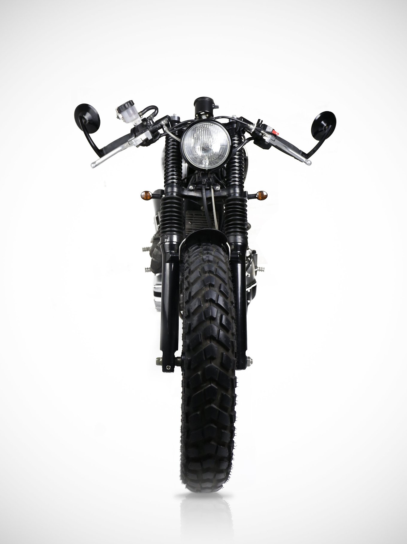 At the rear, there’s a new stainless steel fender, perforated aluminum side covers, and two Öhlins shock absorbers. The redesigned front area now features a ¾ headlight, new Heidenau tires, and black rims. Other changes include two mirrors on the handlebar, a Hummer cover wrapping around the chassis, and a modified Jarama seat. The simple palette enhances the fierce look of the motorcycle, with black and steel complemented by silver and white accents. Images courtesy of Tamarit Spanish Motorcycles.