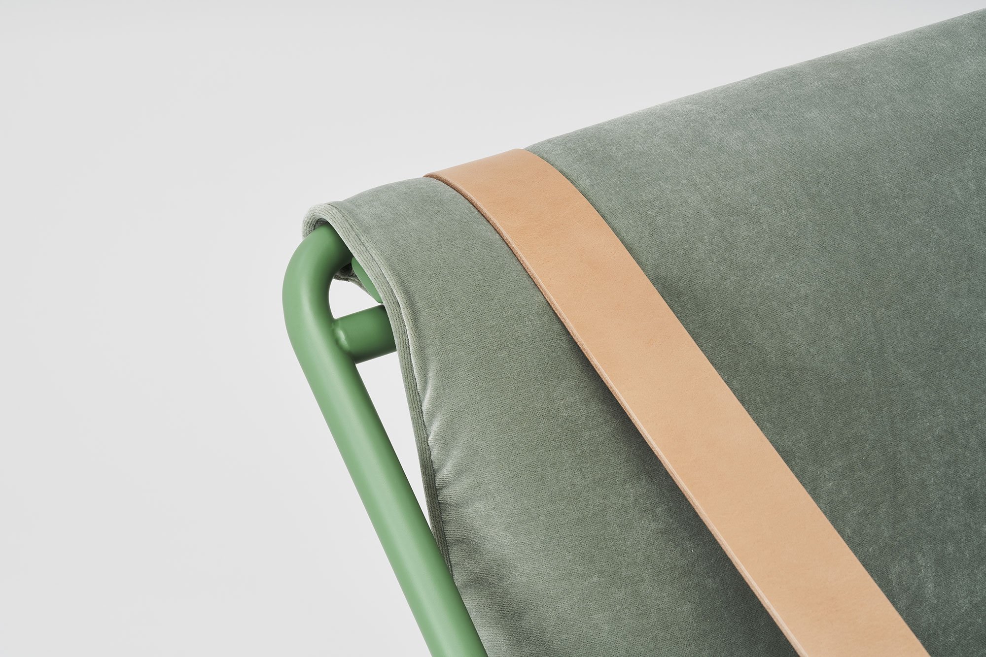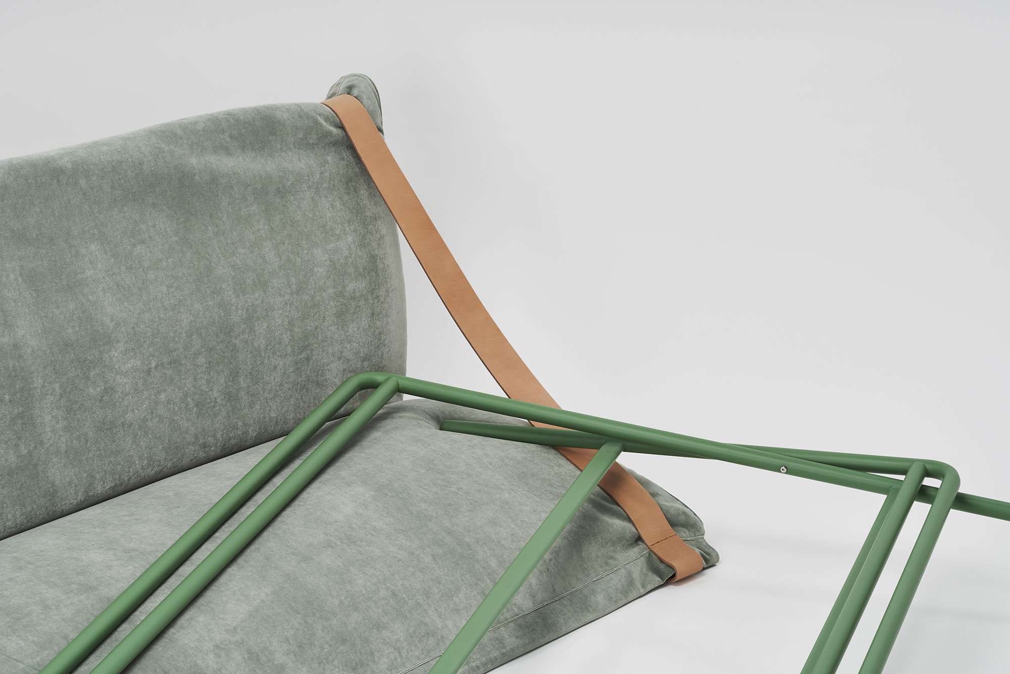 Sent flat-packed for easy shipping, the sofa is easy to both assemble and disassemble when needed. The user can attach the cushion to the powder-coated steel frame via rods. The final step includes the tightening of the leather belts at both ends. Apart from adding an eye-catching accent, the belts also secure the X-frame. Stylish and creative, the folding sofa provides an ideal balance between modern design, comfort, and function. The lightweight build and convenient assembly method provide the perfect way to move Blanco, whether from storage to the living room or from an apartment to another. Photographs© Ryoukan Abe.