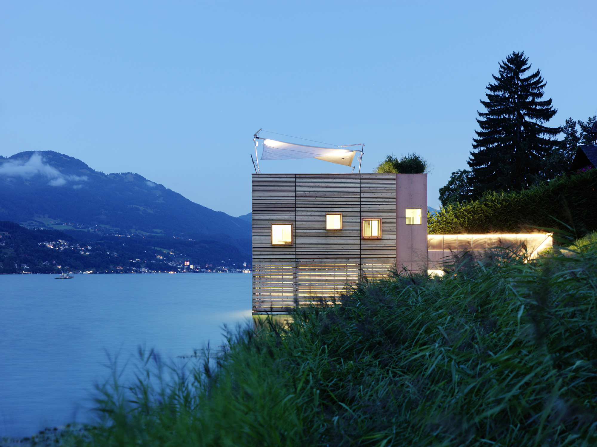 It is always a delight to find a salient engineering solution integrated with architectural design. MHM Architects have seamlessly blended the two in the project Boat’s House at Millstätter Lake. Because of docking restrictions at the waterfront, the wooden façade of the building folds down to create an external footbridge, and this same mechanism is used to create a path to the boat moorings right on the water. The transitioning state of the boat house, and the changing relationship it has with the water, is also represented in the floors of the building. The upper floor encompasses relaxation with a solarium and massage rooms while the more functional spaces are on the lower floors, which eventually open up to the water. Photographs © Paul Ott photografiert