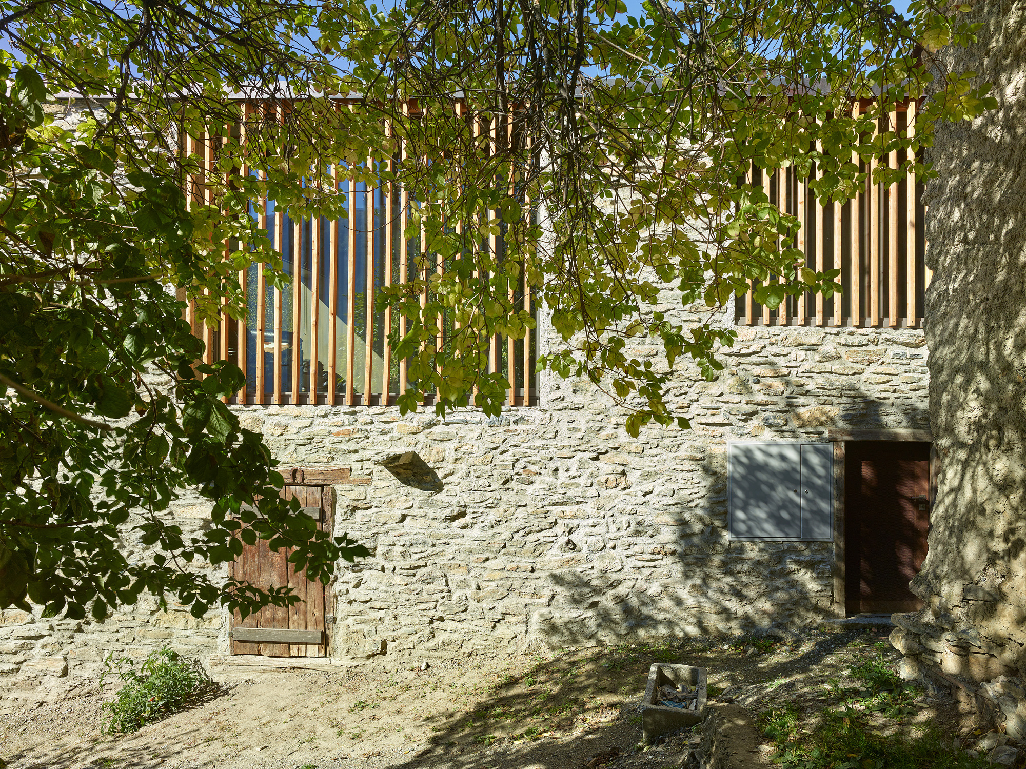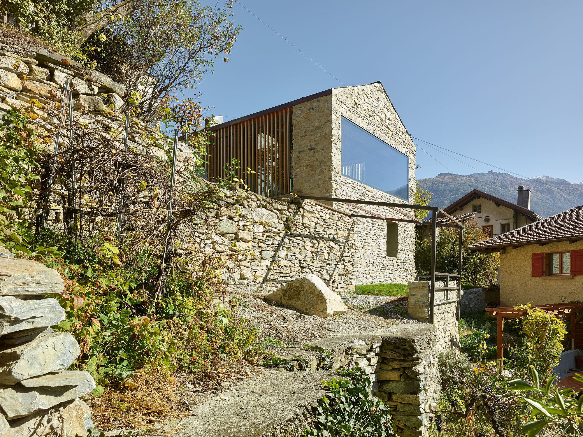 On the ground floor, an open-plan space includes a living room and the kitchen area. Located towards the west, the lounge features a new window that runs across the entire width of the building. Apart from providing views towards the village and the Rhône Valley beyond, it also floods the room with natural light. Following the slope of the site, the main bedroom occupies a higher area of the house, orientated to the east. A utility room divides the socializing areas and the private rooms. The bedroom has access to a small terrace, while the basement area includes an office, a bathroom, and equipment. Although the west wall required a complete renovation, allowing the architects to introduce the panoramic window, the rest of the barn maintains its original openings.
