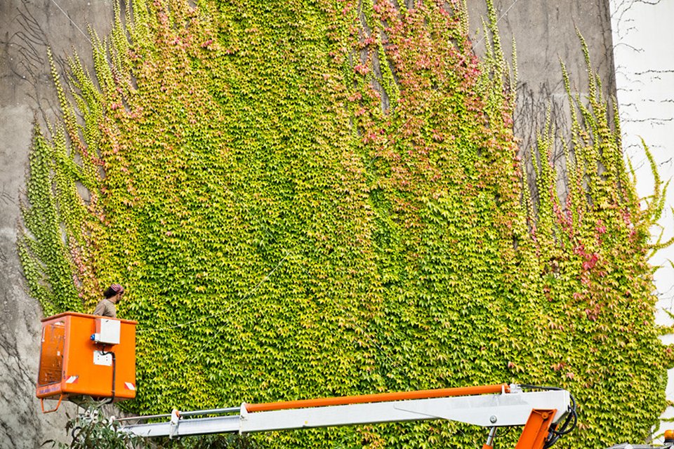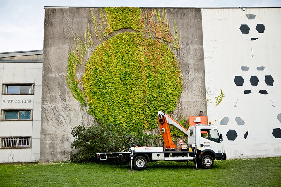 SpY took it upon himself to spruce up the city of Besancon, France with some botanical street art. It serves as a soothing reminder that nature can make us smile in the midst of the bustling city’s daily grind. So take a minute and take a look, a bit of beauty can stick with you for at least 3 blocks. To maintain the project, he hired a cherry picker man lift and committed to pruning the climbing plants into precise forms, shapes, designs. When the seasons change, the leaves turn colors and the organic graffiti really starts to pop.