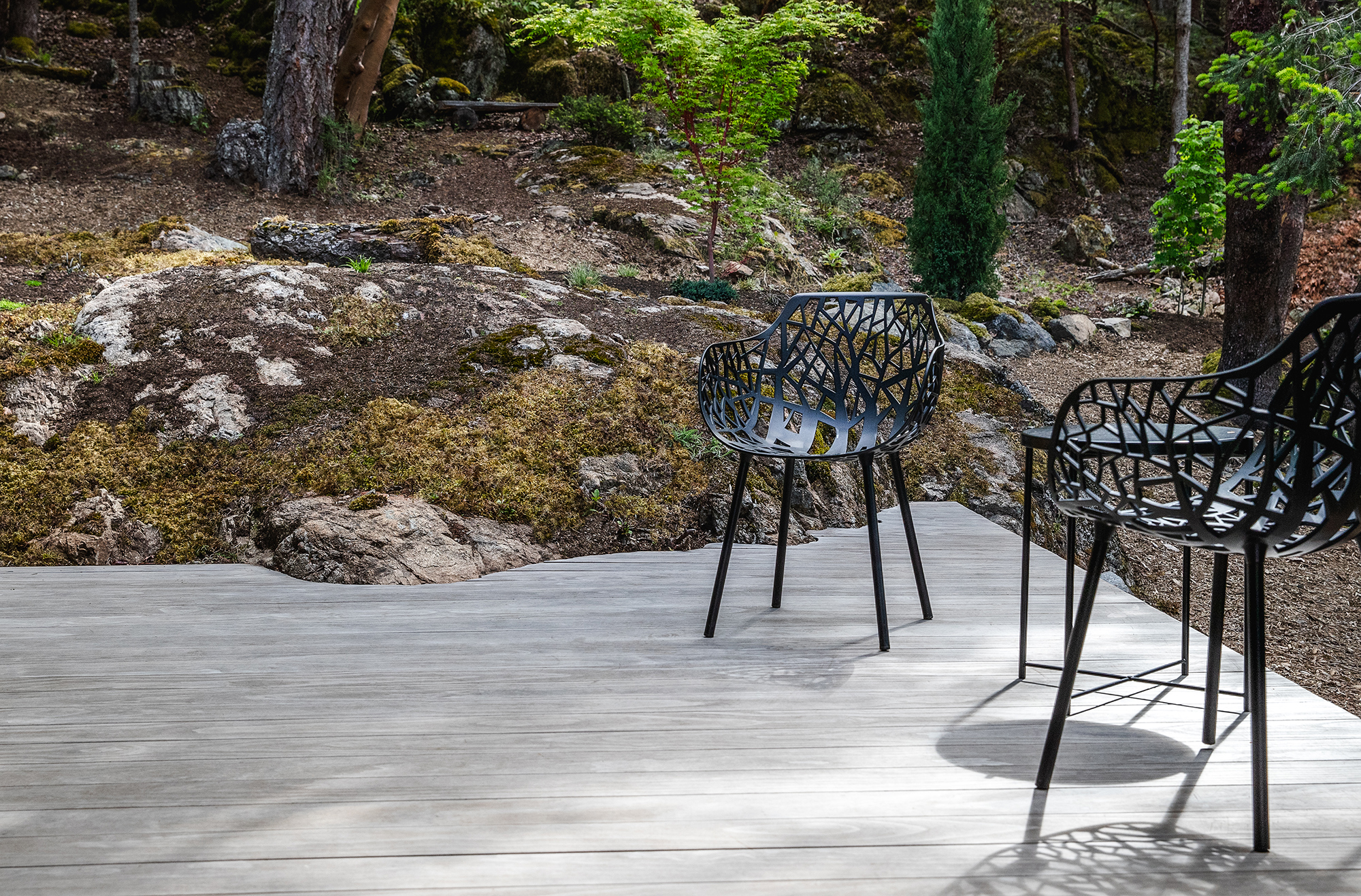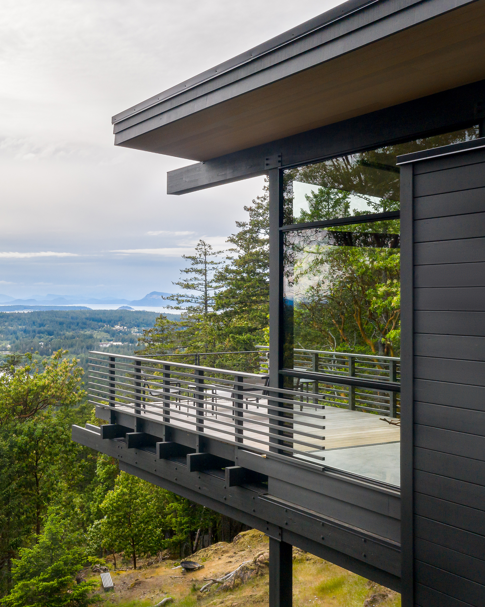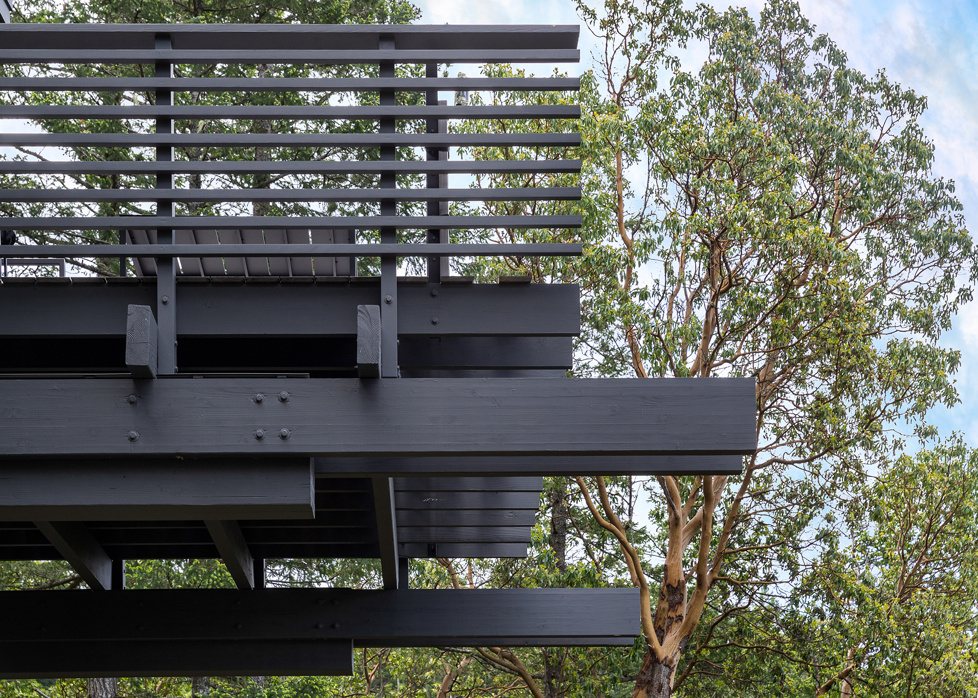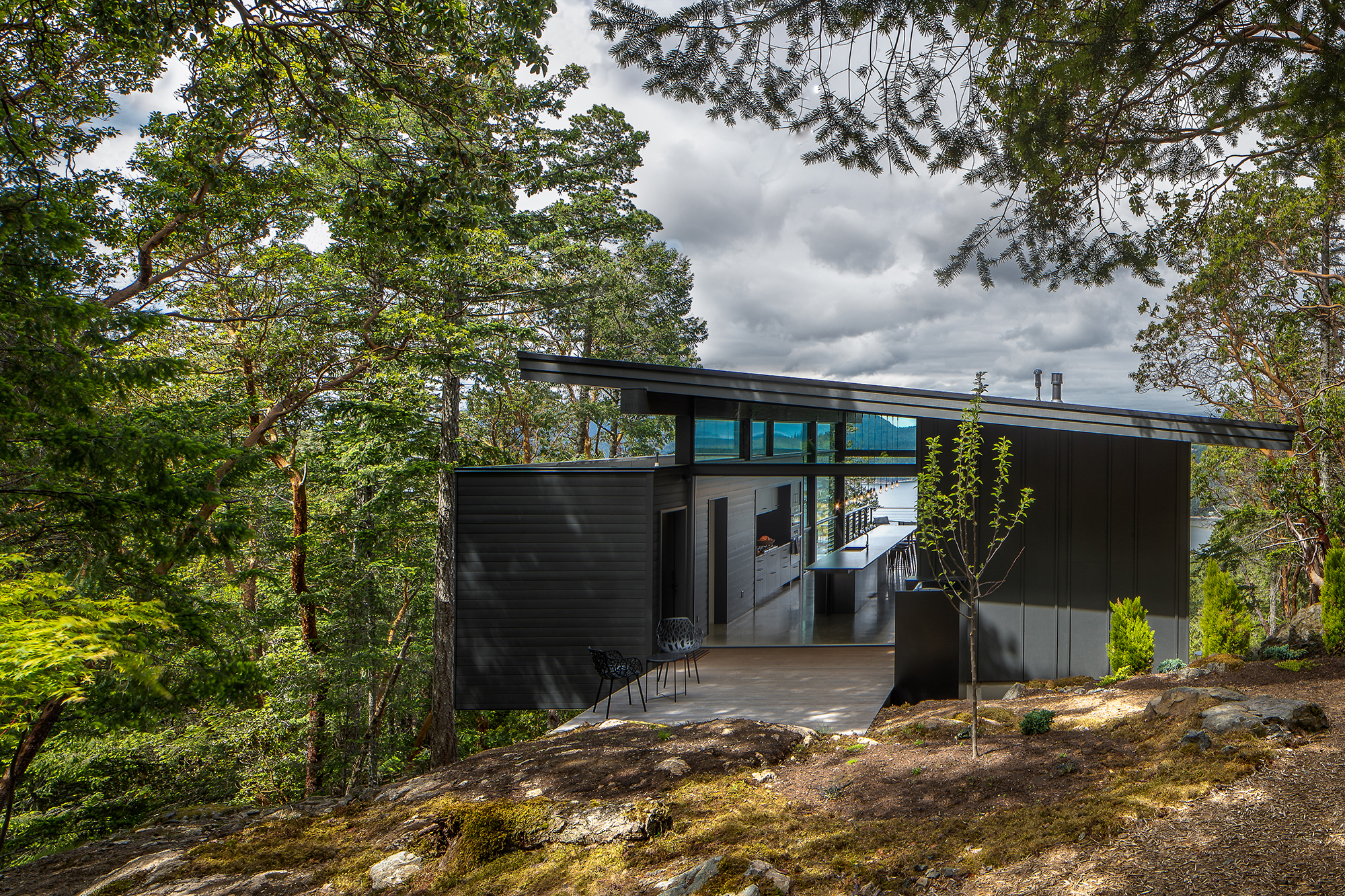 Designed by architecture studio Heliotrope, this retreat on Orcas Island, Washington, makes the most of a challenging site to optimize the dialogue between living spaces and nature. The parcel, located on a steep hillside where mature trees grow alongside grassy basalt bedrock, presented the architects with a great opportunity to immerse the structure into the site in a creative way. Without removing any trees or excavating the hill, the studio built the black house around natural features, thus embracing the narrow clearing in the woodland. Elevated on point-load columns that stand on exposed bedrock, the cabin cantilevers 22 feet above grade toward water views. On the opposite side, the retreat has a strong connection with the surrounding Douglas fir and Pacific madrone forest, making the inhabitants feel like they’re living in a tree house.