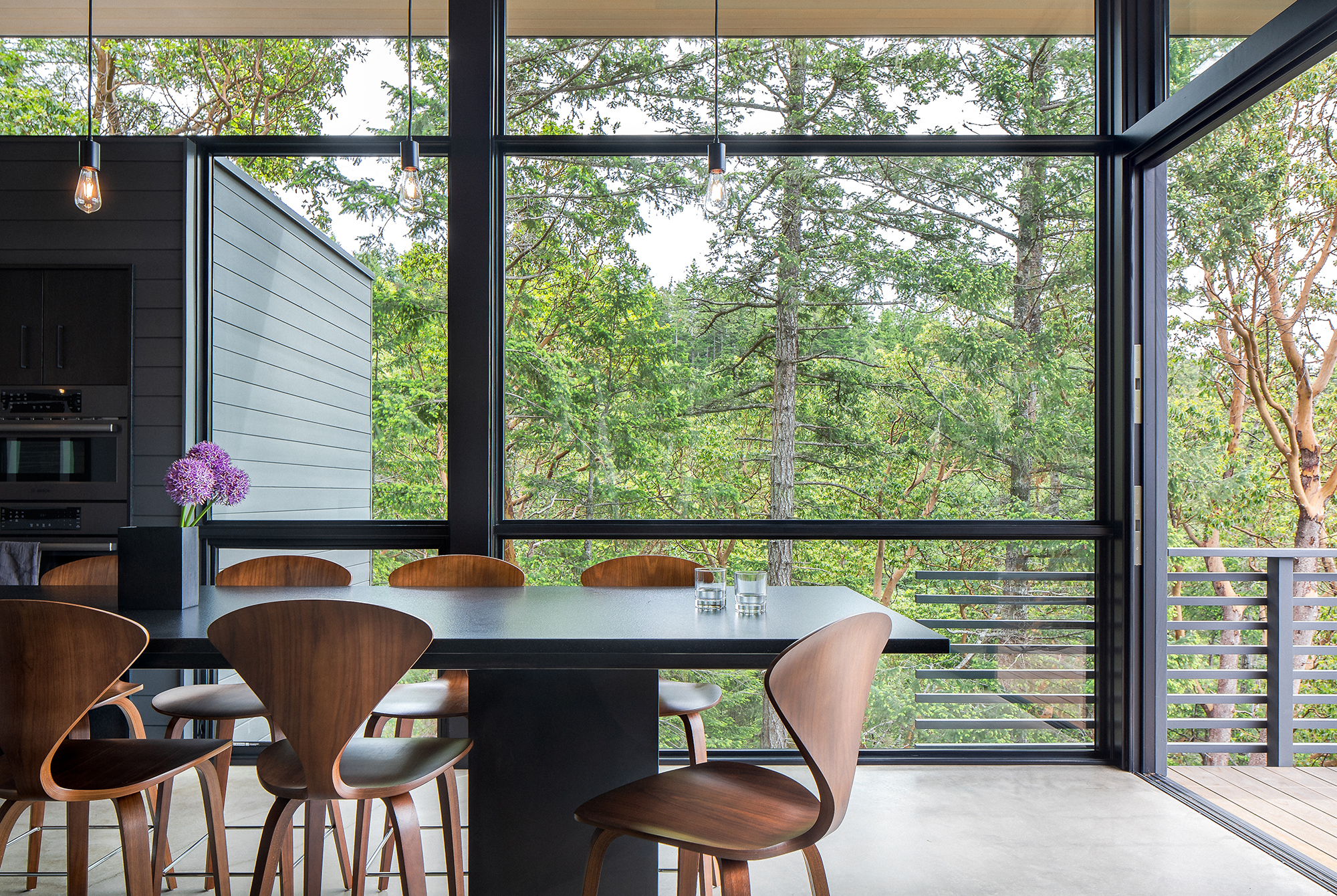 The architects placed the more intimate bedrooms and bathrooms on the forest side; here, the rooms open to views of the woodland and a rocky hillside. By contrast, the dining area and the living room overlook the San Juan islands. Pocketing sliding doors on both ends establish a seamless corridor that runs through the entire house, connecting two terraces. Minimalist and built to last with little maintenance, the cabin features understated, rectangular forms and honest, durable materials. Apart from solid wood with a dark stain on the exterior, the house also features polished concrete flooring throughout. Finally, large overhangs and clerestory windows to the south ensure optimal winter solar heat gain. The studio completed both the architecture and the interior design for the Buck Mountain Cabin. The team also collaborated with Native Landscapes on landscape design. Photographs © Taj How