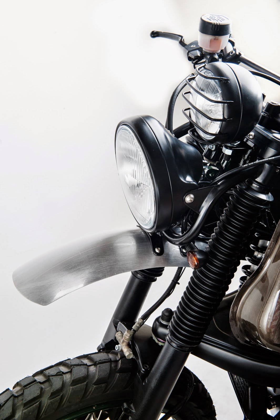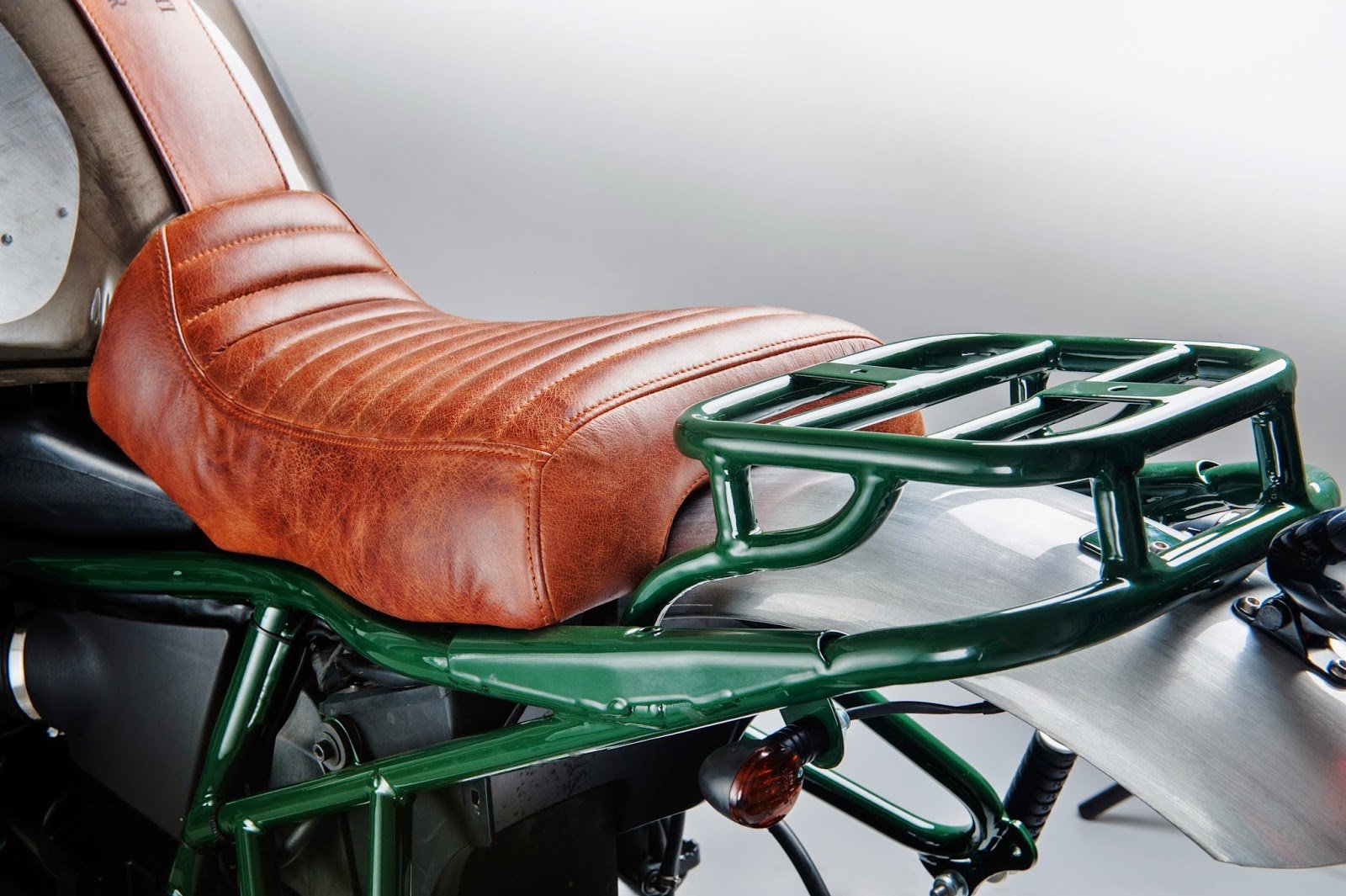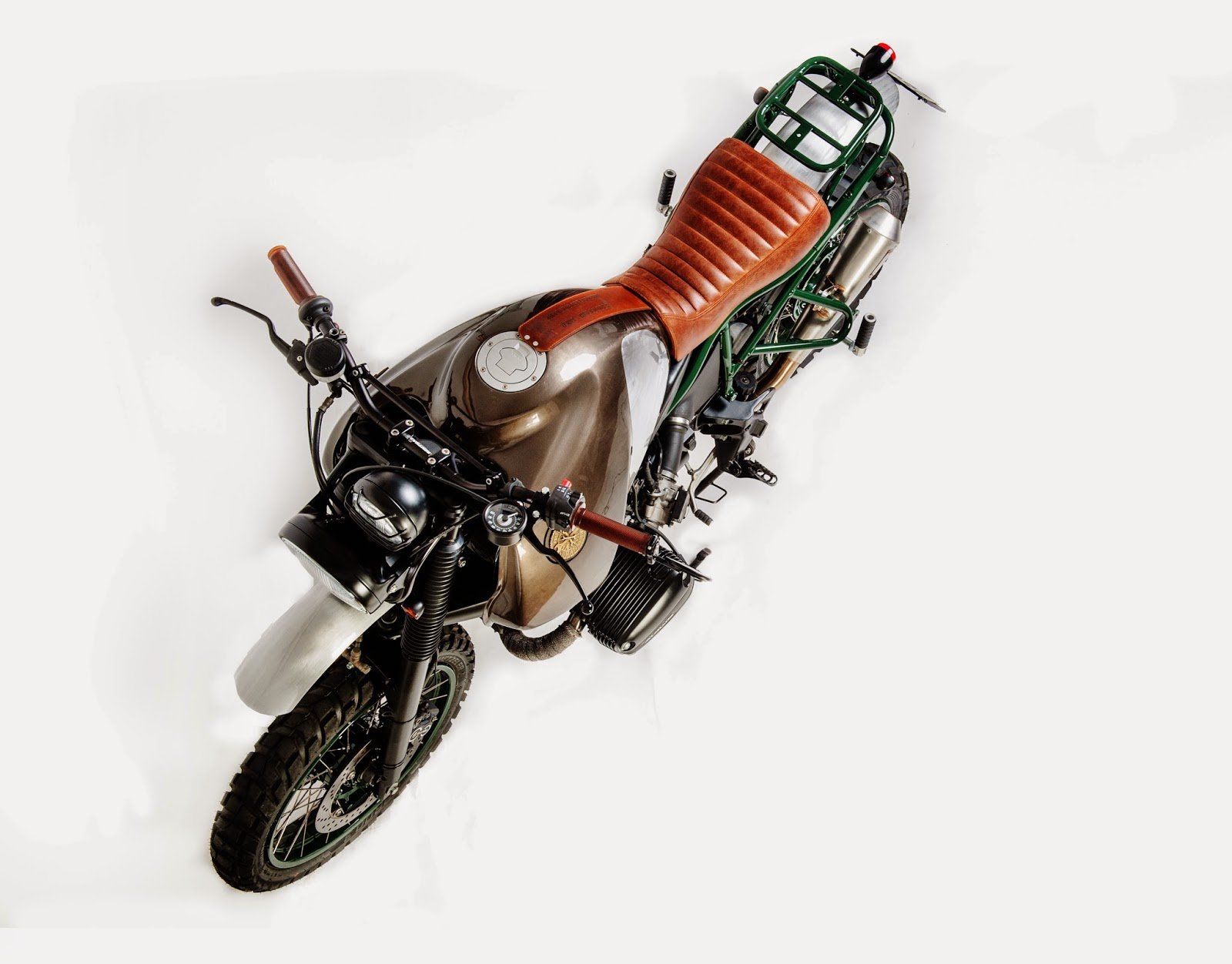 Buldozzer (or “Bulldozer”) is a BMW R1100GS build by the Italian workshop Officine Sbrannetti. The motorcycle rocks a new, custom-made leather seating and tank cover, aluminum fenders, a double headlamp, threaded tires, a fresh exhaust system, and a handy luggage rack. The radiator was also moved behind the front wheel for a sleeker look. A handsome take on a classic motorbike, the Buldozzer shines with a rich palette of browns, metallics, green, and black.