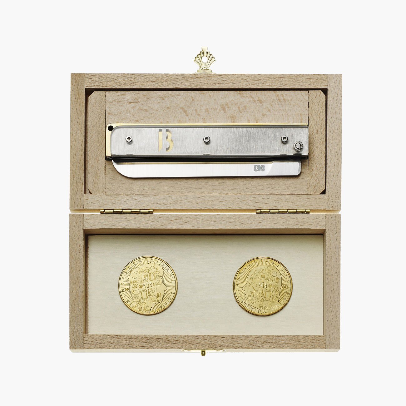 Founded in 2006 by art school graduate Ben Gorham, BYREDO brings a unique perspective to the perfume and home fragrance industry. The idea for starting the company came after a trip his mother’s hometown in India, where fascinating aromas and spices inspired Gorham and opened up a completely new path that strayed from his art background yet maintained the same sense of creativity. A complete novice with no training in the field, he reached out to renowned perfumers to create a line of scented candles and perfumes, all made from the highest quality raw materials. The new travel collection is designed with the same passion for quality and creativity, and the beautiful travel knife is a perfect example. Italian craftsmanship and elegant design are brought together in a product that is as functional as it is stylish. It comes in a wooden box with stunning details that include two golden coins and a chic seashell closure. The silver gray knife has a brushed matte handle with the number 13 inscribed in gold on one side and a solid wood material on the other, while the sharp blade features a rounded shape and subtle industrial accents. Striking and unique, this travel knife is a great choice for anyone looking for creative design in a practical product, and will add undeniable style to any journey.