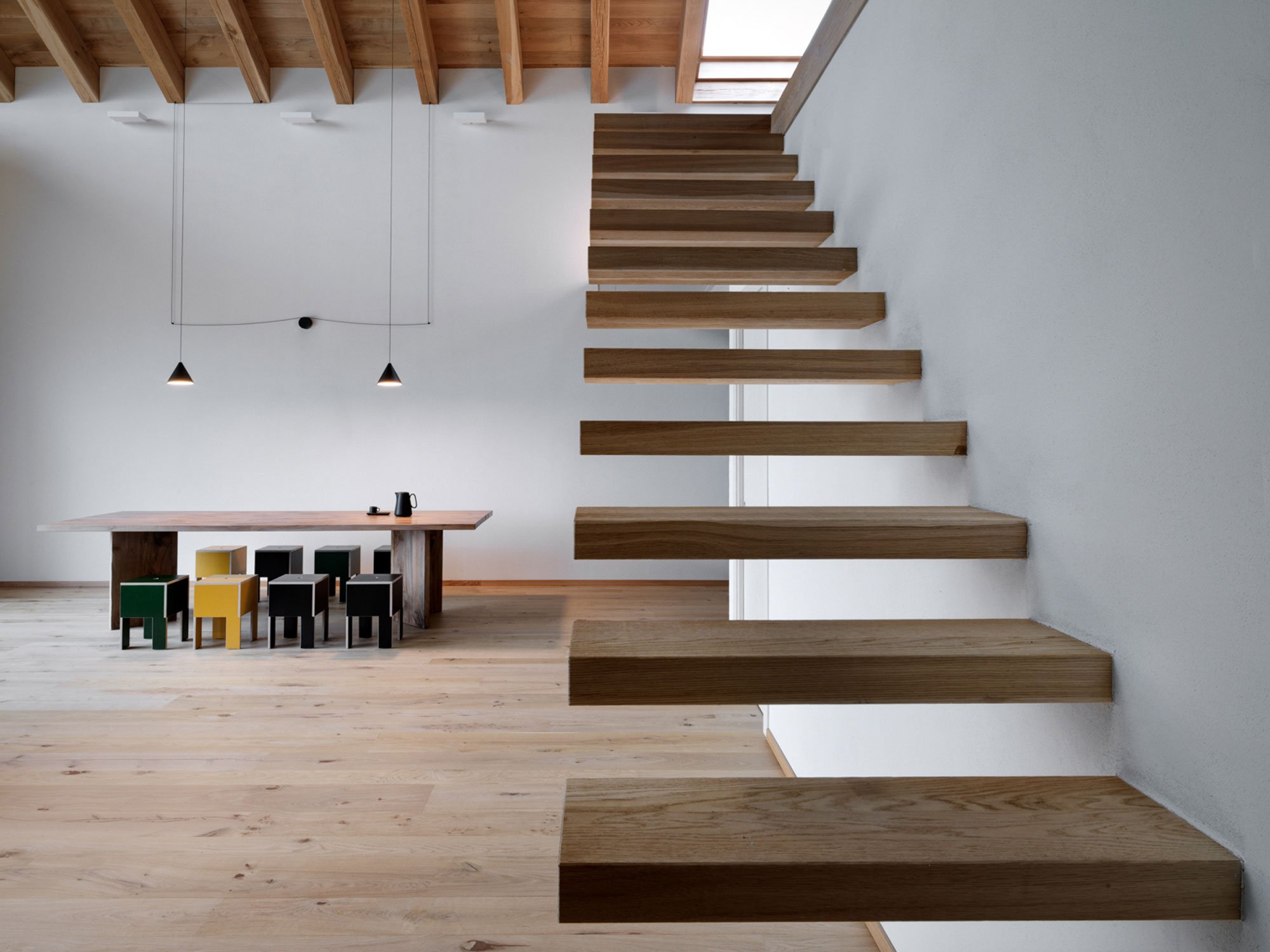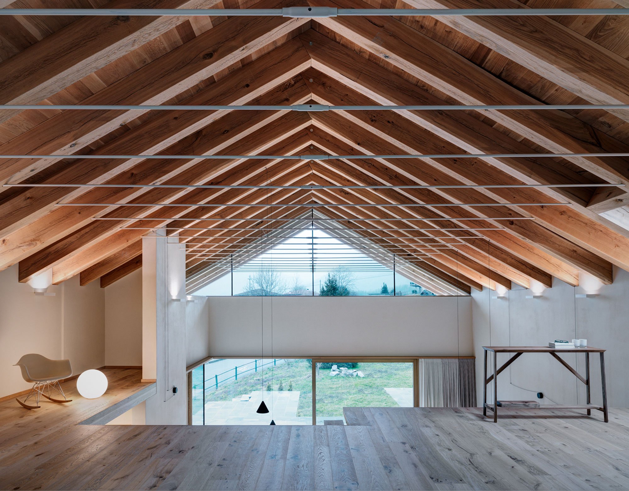 Local natural stone covers the north and east facades as well as southern part of the previously built structure, blending rustic elements and rich textures with the building’s contemporary design. The roof trusses provided the perfect solution to create an airy interior with a double-height ceiling. Stepping inside from the garden, guests find a spacious living room, kitchen and dining area, as well as a mezzanine level. Featuring few internal divisions, this space connects the different areas and offers direct views to the landscape through large windows. The décor favors simplicity and brightness. White walls, solid wood, and carefully selected modern furniture and lighting enhance the elegant appearance of the interior. Photographs© Rocco Borromini.