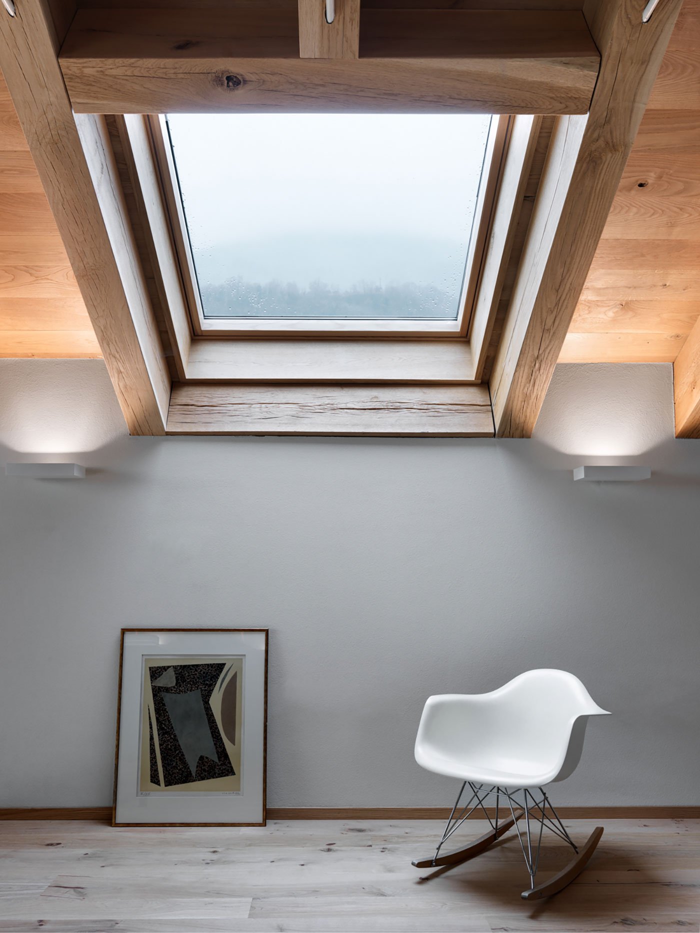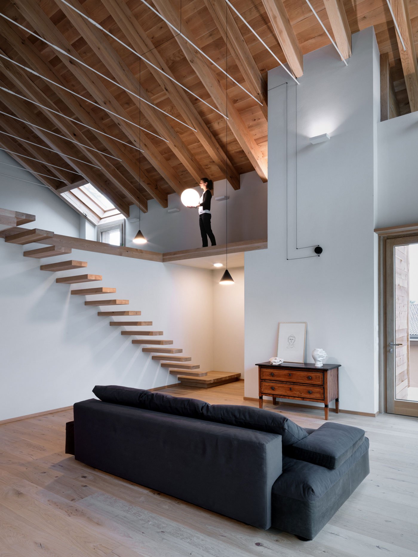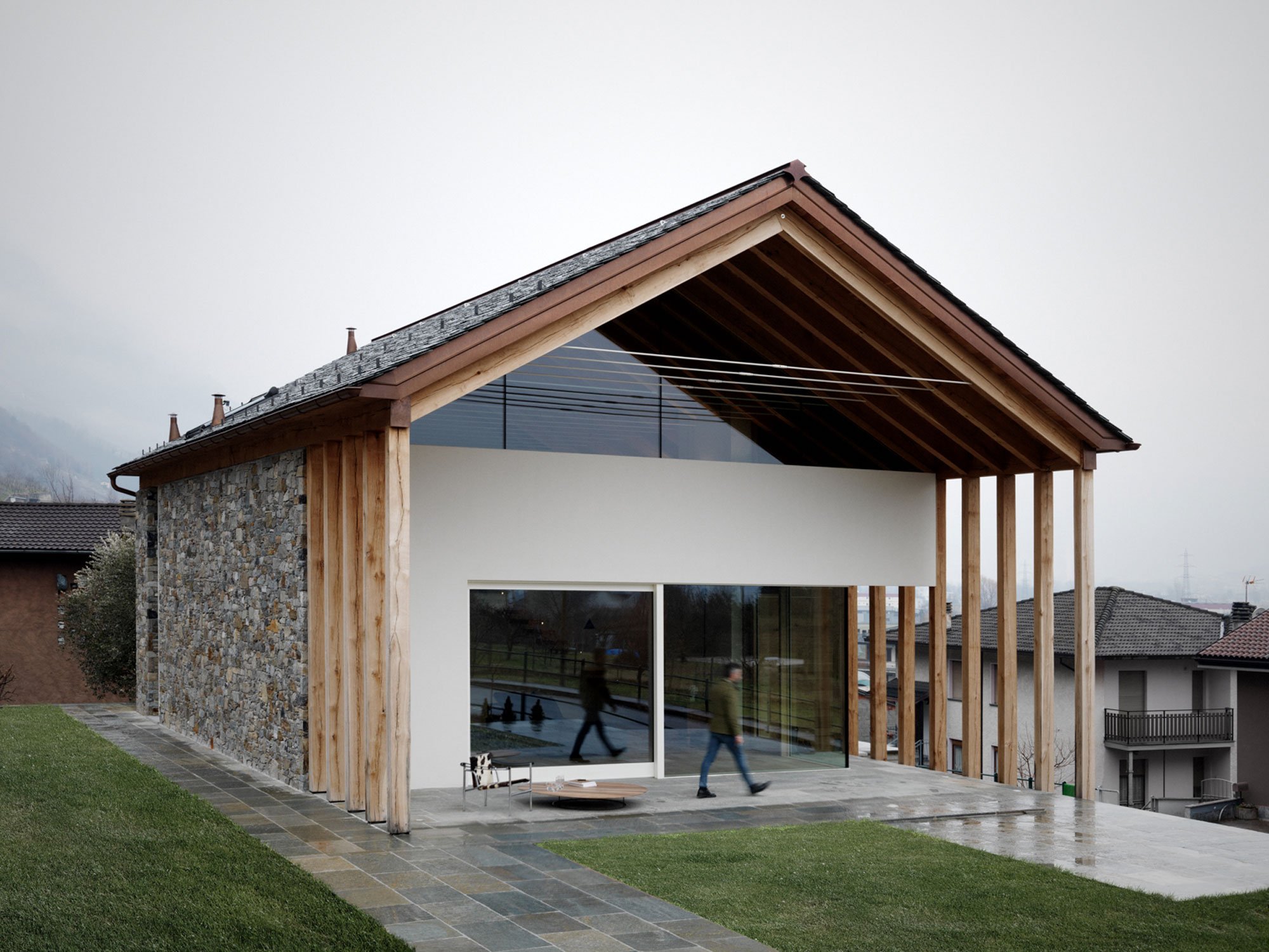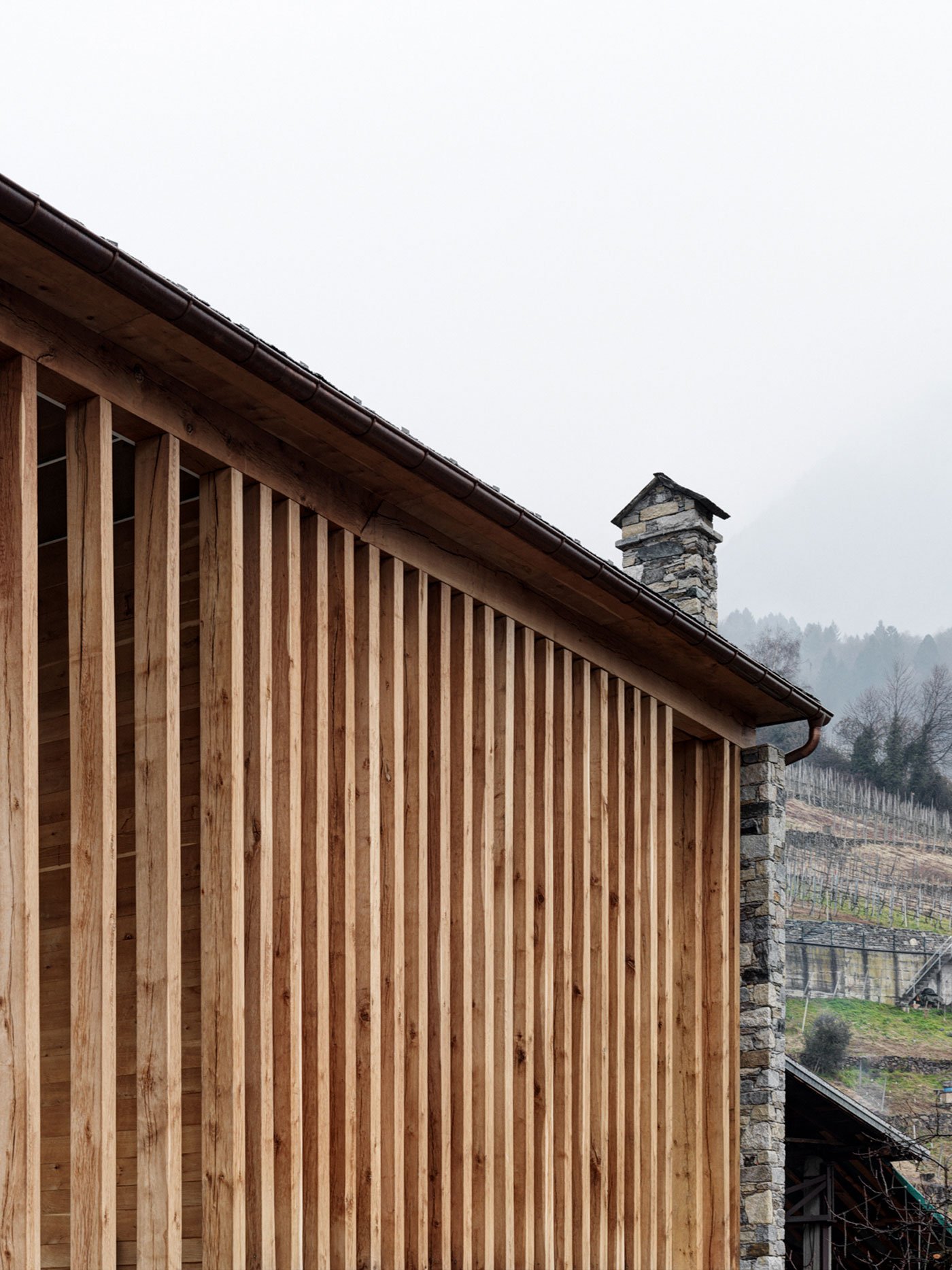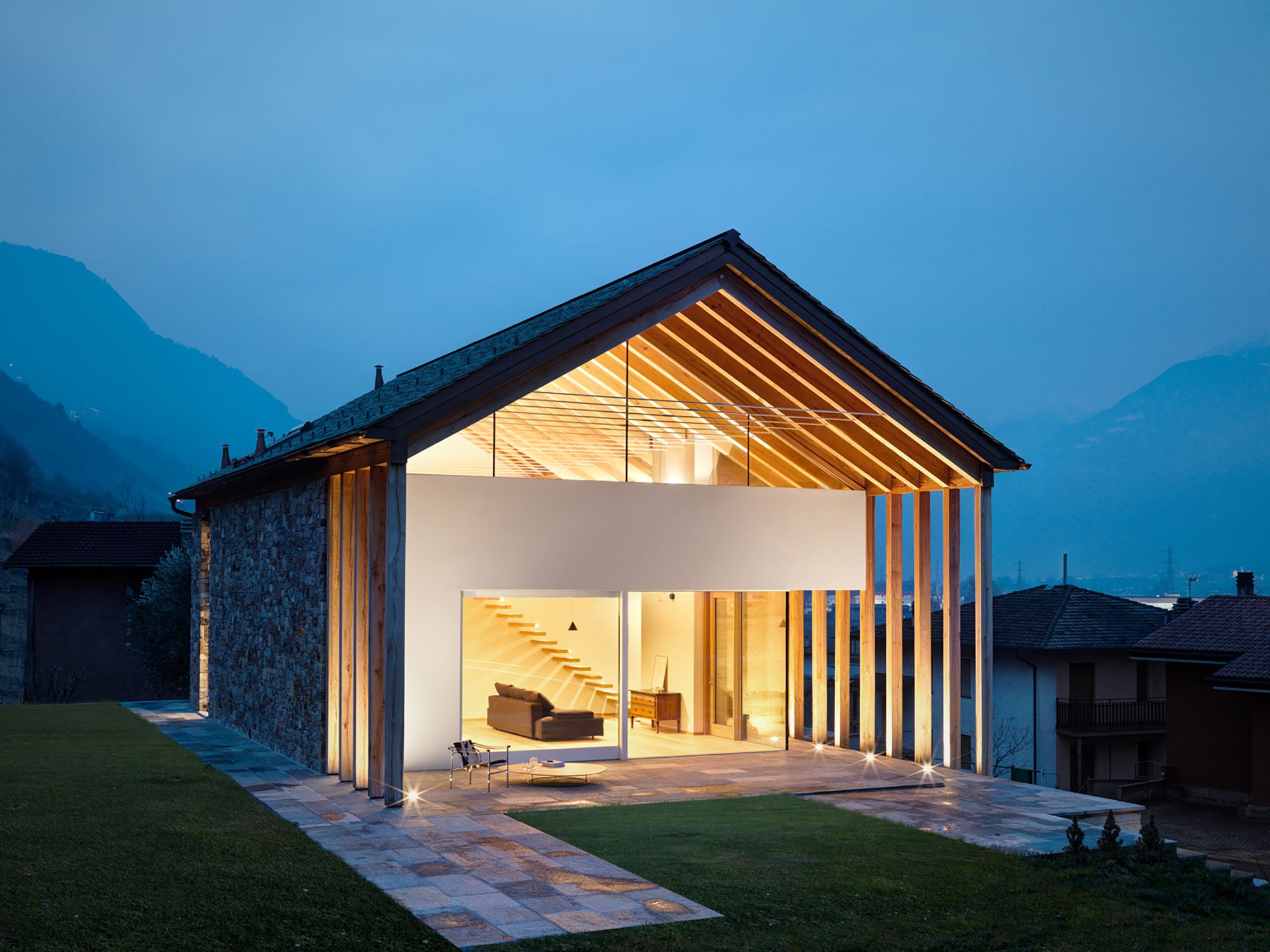 The home sits in a beautiful area in the Valtellina Alps, on the Rhaetian side. Like the SV House, this structure features a similar blend of natural, locally sourced materials, but in a more restrained design. The new building sits on top of a pre-existing garage, with a wooden structure connecting the two volumes in a single unit while also serving as support for the new roof. The use of solid oak allowed the architect to increase the size of the pillars and beams. On the south side, pillars on two levels provide support to a succession of trusses. Overall, this design feature gives the modern cabin in the Alps a distinctive look.