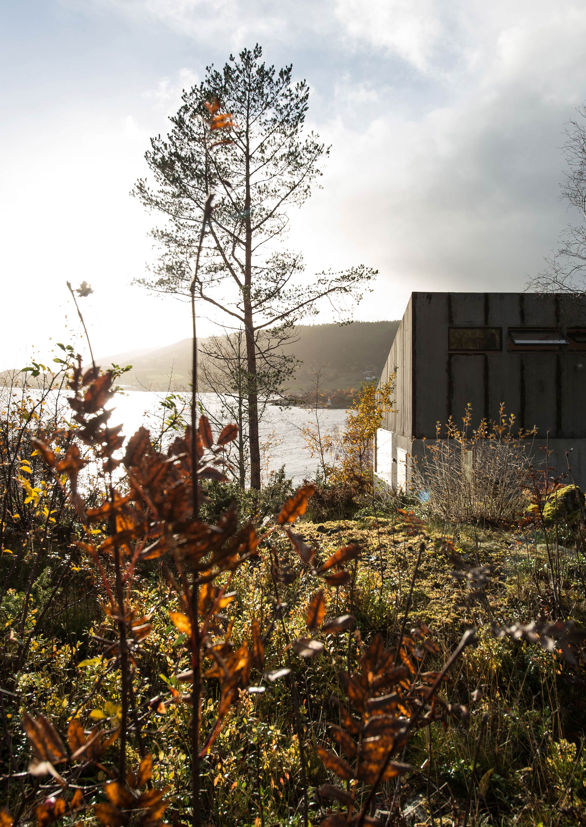 As it follows the topography of the plot of land, the ground floor has three different levels. Similarly to the exterior, the living spaces boast a blend of concrete and timber surfaces. The architects used both textured and polished concrete along with Norwegian pine and birch wood. Large windows with wooden frames open the interiors to views of the rugged landscape and the fjord in the distance. Wide windowsills double as seating and lounge spaces. A glass door links the main living area to a terrace nestled among larger boulders. Photography © Sanden+Hodnekvam Architects.