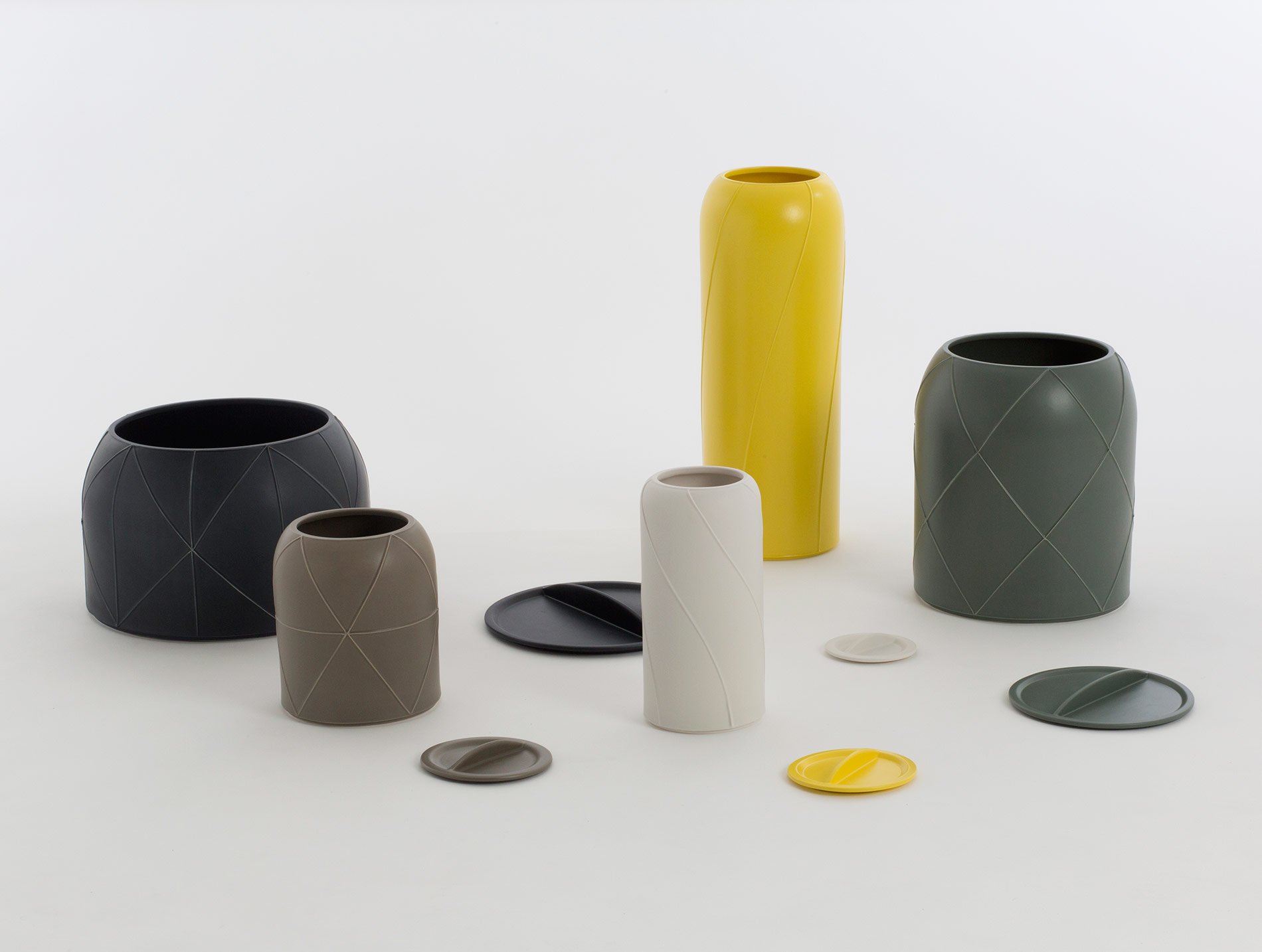 Canisters is a collection of five large ceramic centre pieces designed by Benjamin Hubert Ltd for Italian ceramic manufacturer Bitossi Ceramiche.
