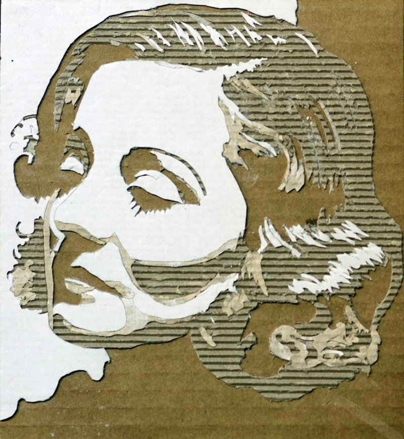 Cardboard portraits by Giles Oldershaw lead us into the golden age. Using shadows to define his cuts, he carefully manipulates the layers in bound cardboard pieces to present a clear picture. The romance of the time is amplified by the ladies full lips and styled hair; likewise projecting jacket and tie office days as the gentlemen sport concentrated brows. A faint subliminal message is printed on many reminding us to “Please Recycle” as the artist has shown by example.