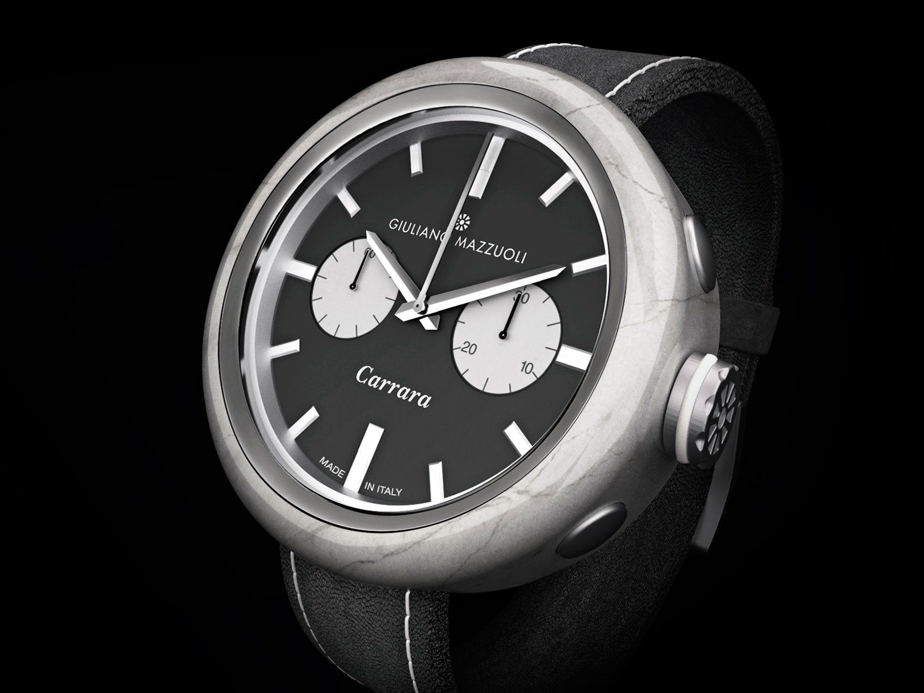 The Carrara and Carrara Chronograph are the two latest timepieces by Giuliano Mazzuoli. An Italian designer, Mazzuoli was raised in Florence and works there in the city today. His creativity is sparked by place and culture, and he is known for his innovative wristwatches inspired by the Italian automotive scene. In the Carrara collection, Mazzuoli diverges from his interest in car culture, however, turning his focus to another Italian institution: marble.