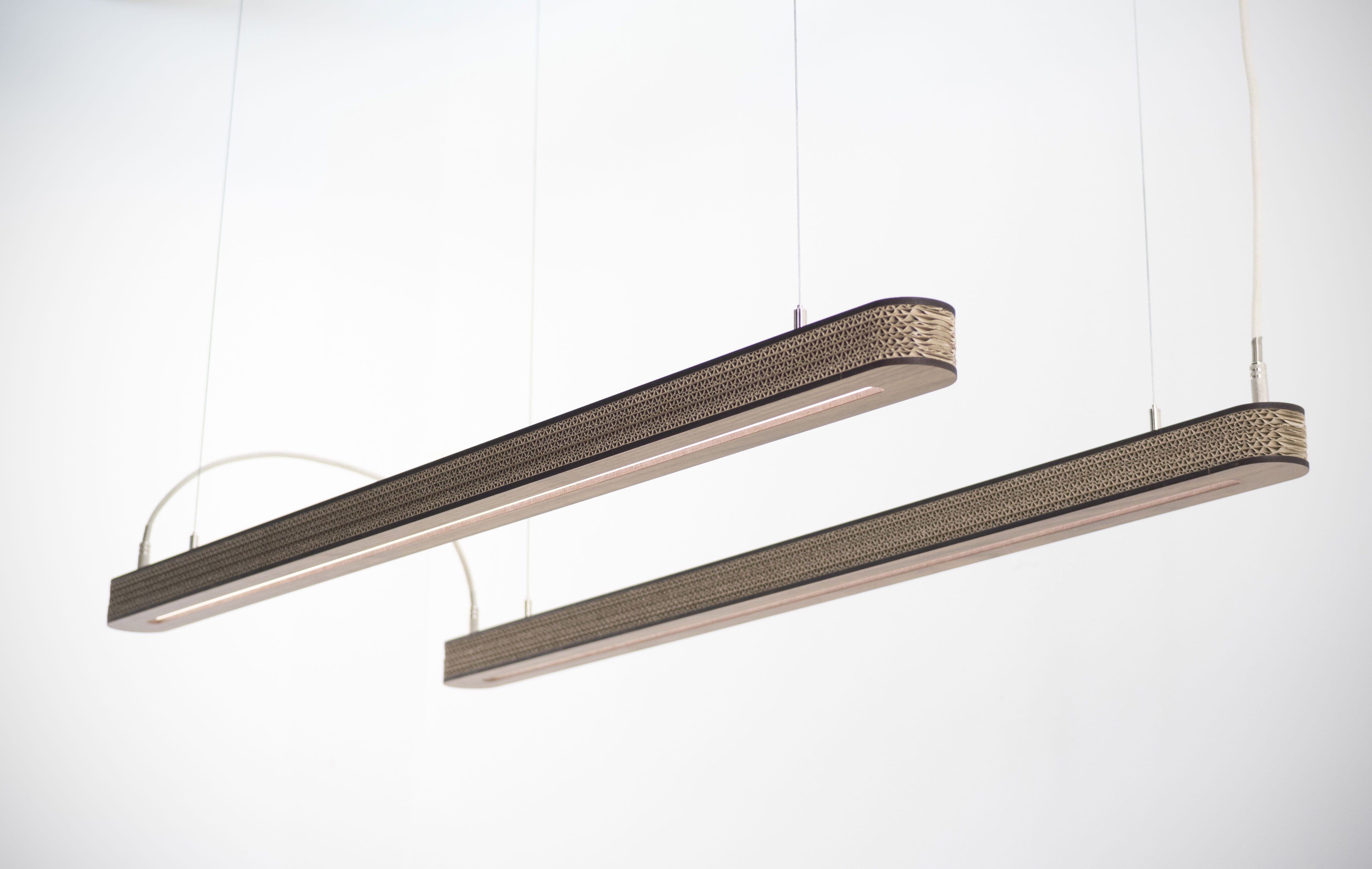In recent years, lighting and furniture products have become increasingly more eco-friendly. The Cartoni 900 cardboard light exemplifies this perfectly. Created by designer Wisse Trooster for Cartoni Design, the pendant light features several layers of recycled corrugated cardboard as well as an energy-efficient LED light. A veneer top completes the design, adding a warm accent to the design and providing customization options at the same time. The user can select a certain finish to ensure that the cardboard lamp design blends into the décor.