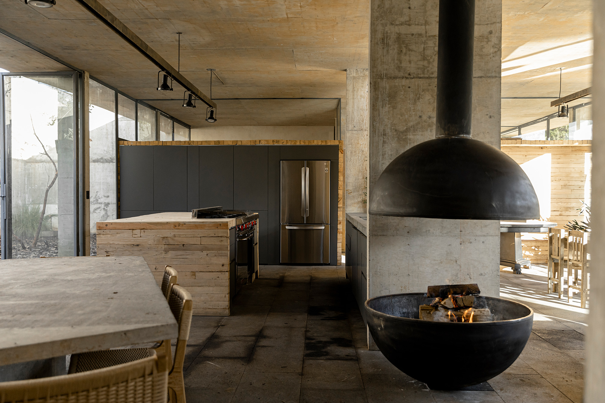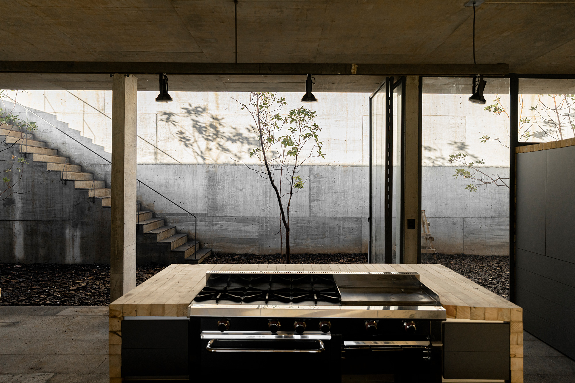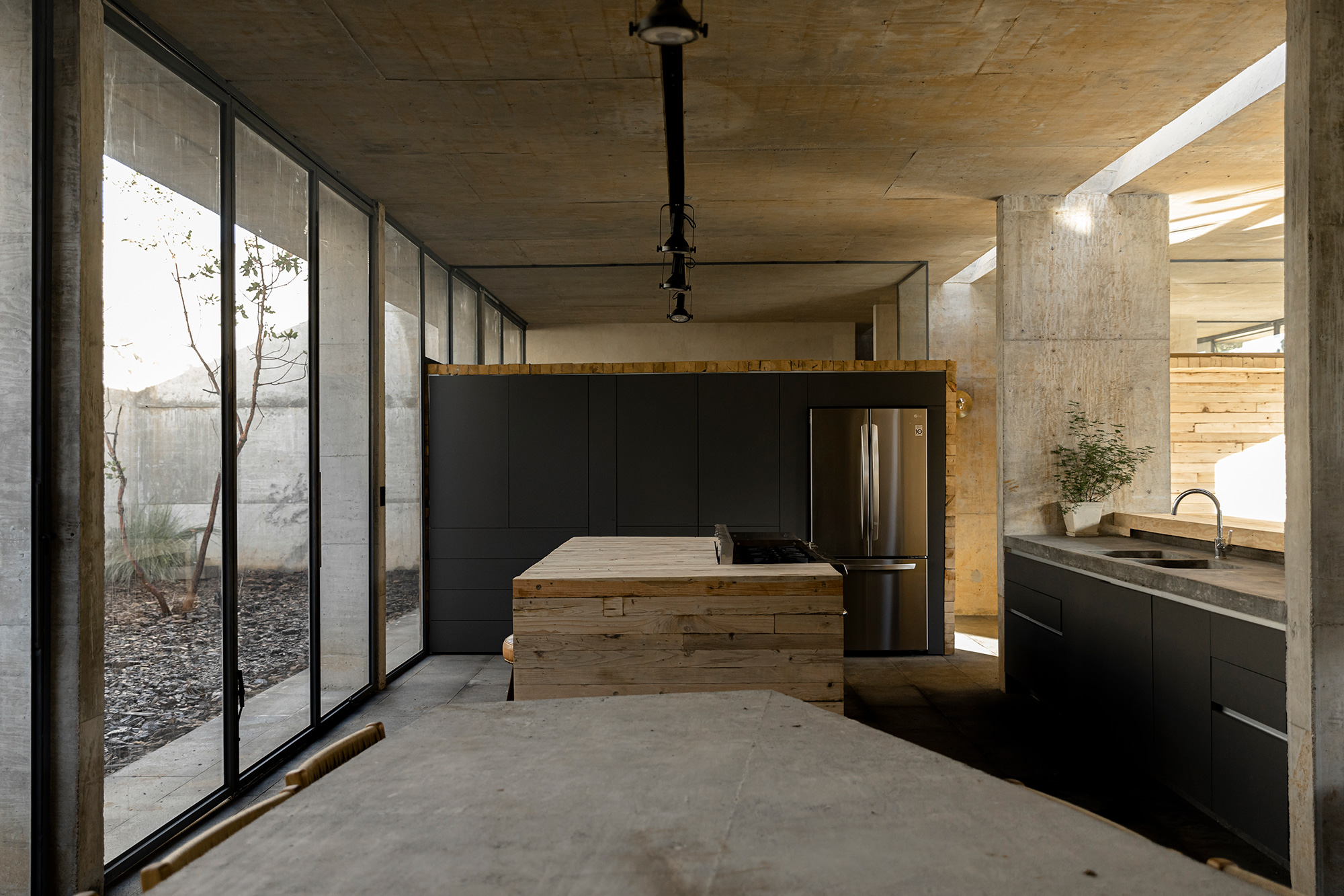 A concrete weekend home built under an avocado field.