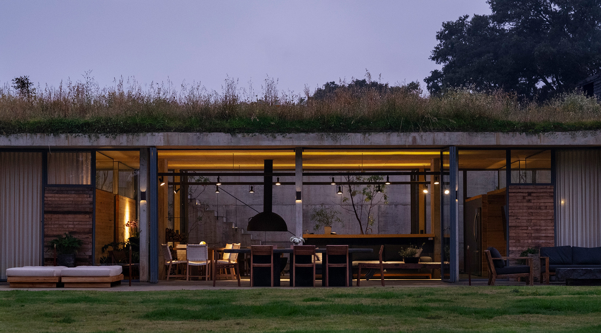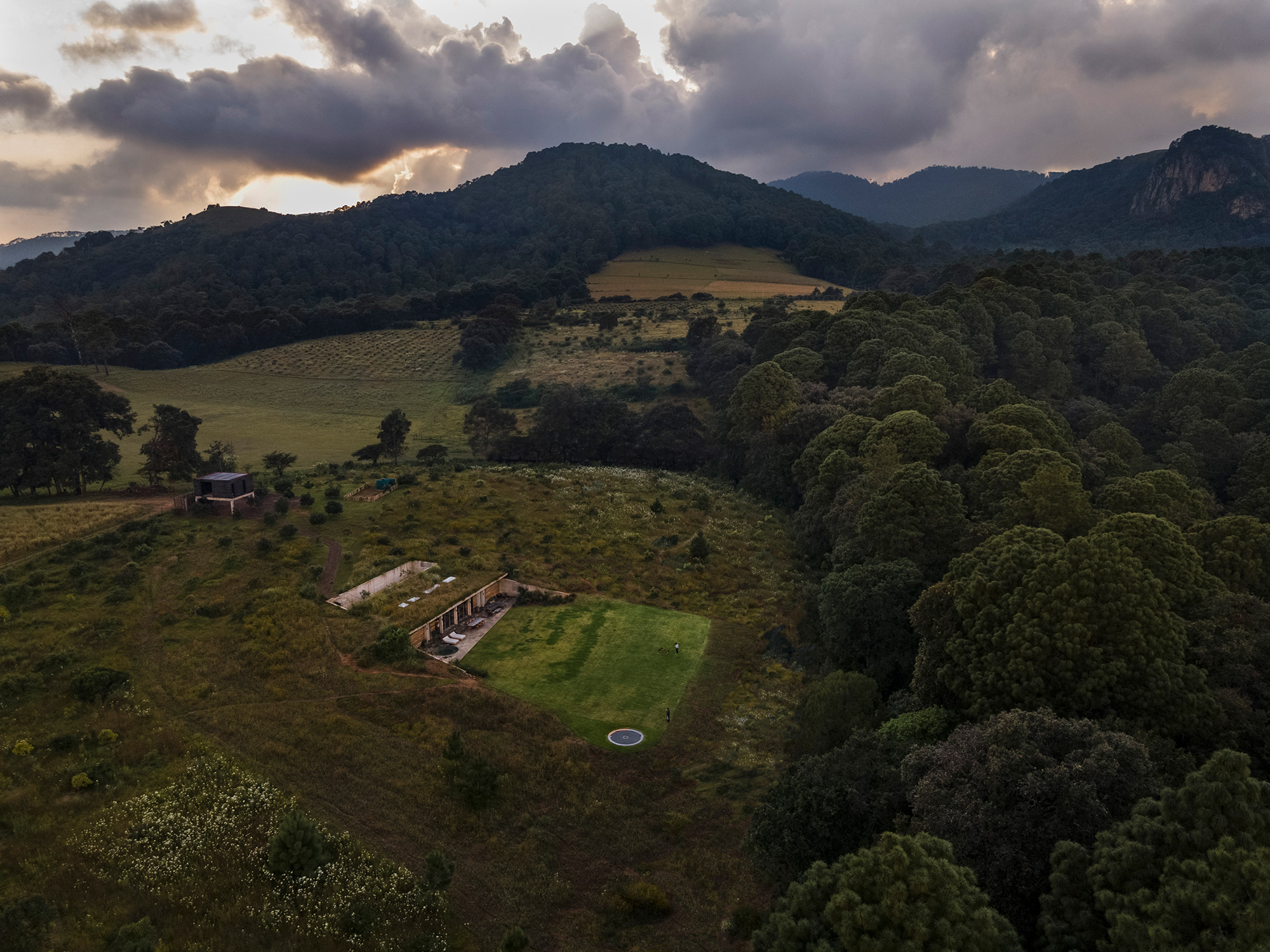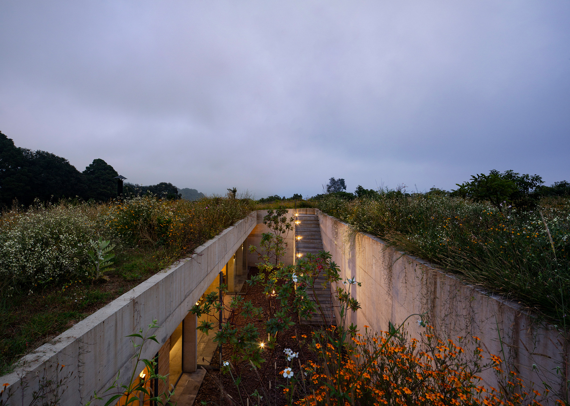 Many houses nestled in natural landscapes aim to minimize their visual impact on pristine sites, but Mexico City-based architect Francisco Pardo took a more radical approach for this weekend home. Named Casa Aguacates (Avocado House), the concrete house is built under an avocado field in Valle de Bravo, Mexico. The clients, a young couple who love hang gliding, wanted a weekend retreat that in no way disrupts the beauty of the site. To accommodate their request, the architect buried the brutalist dwelling in the landscape. The plot of land is located in a quiet rural area, only a couple of hours away from Mexico City. On one side of the avocado field, there’s a dense forest and glen, while on the other one can admire mountains in the distance.