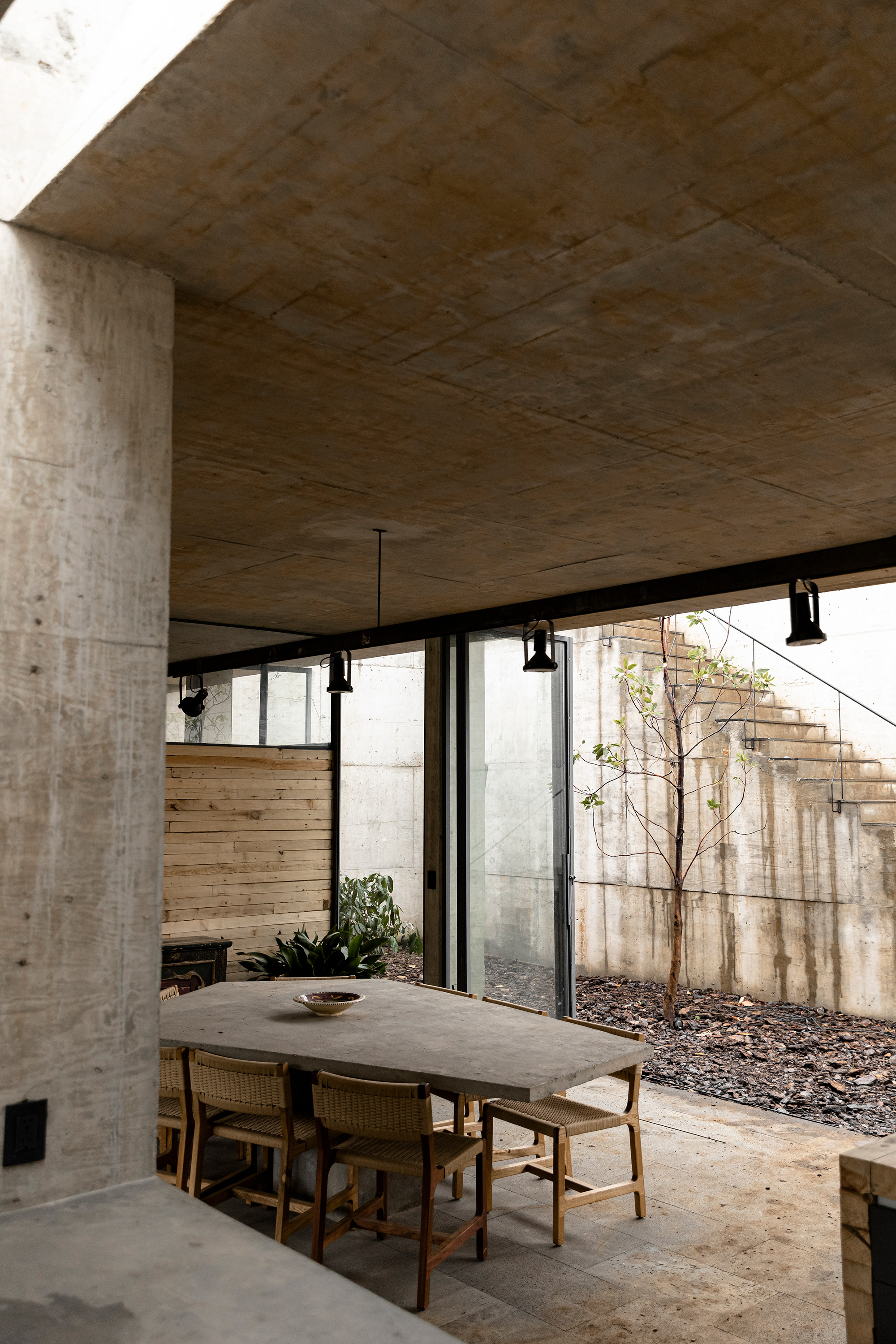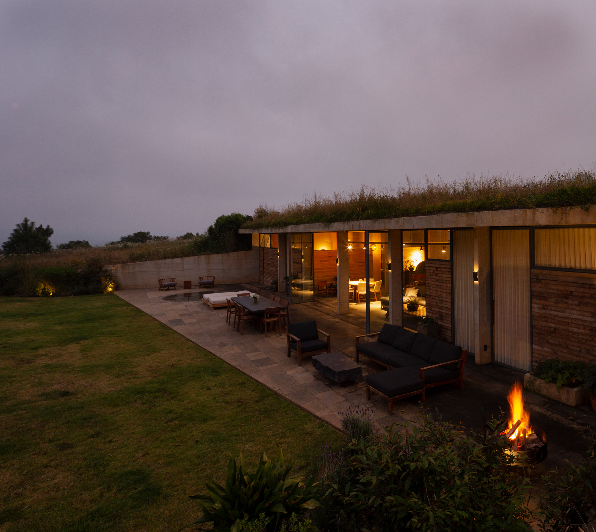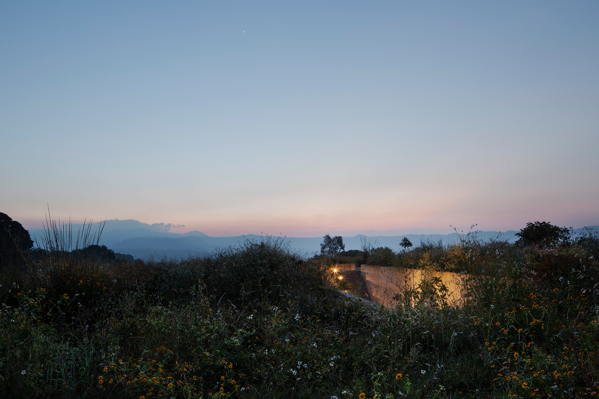 Many houses nestled in natural landscapes aim to minimize their visual impact on pristine sites, but Mexico City-based architect Francisco Pardo took a more radical approach for this weekend home. Named Casa Aguacates (Avocado House), the concrete house is built under an avocado field in Valle de Bravo, Mexico. The clients, a young couple who love hang gliding, wanted a weekend retreat that in no way disrupts the beauty of the site. To accommodate their request, the architect buried the brutalist dwelling in the landscape. The plot of land is located in a quiet rural area, only a couple of hours away from Mexico City. On one side of the avocado field, there’s a dense forest and glen, while on the other one can admire mountains in the distance.