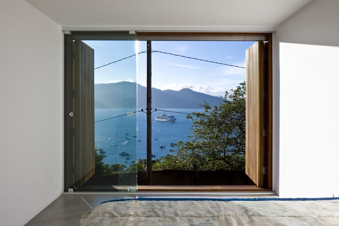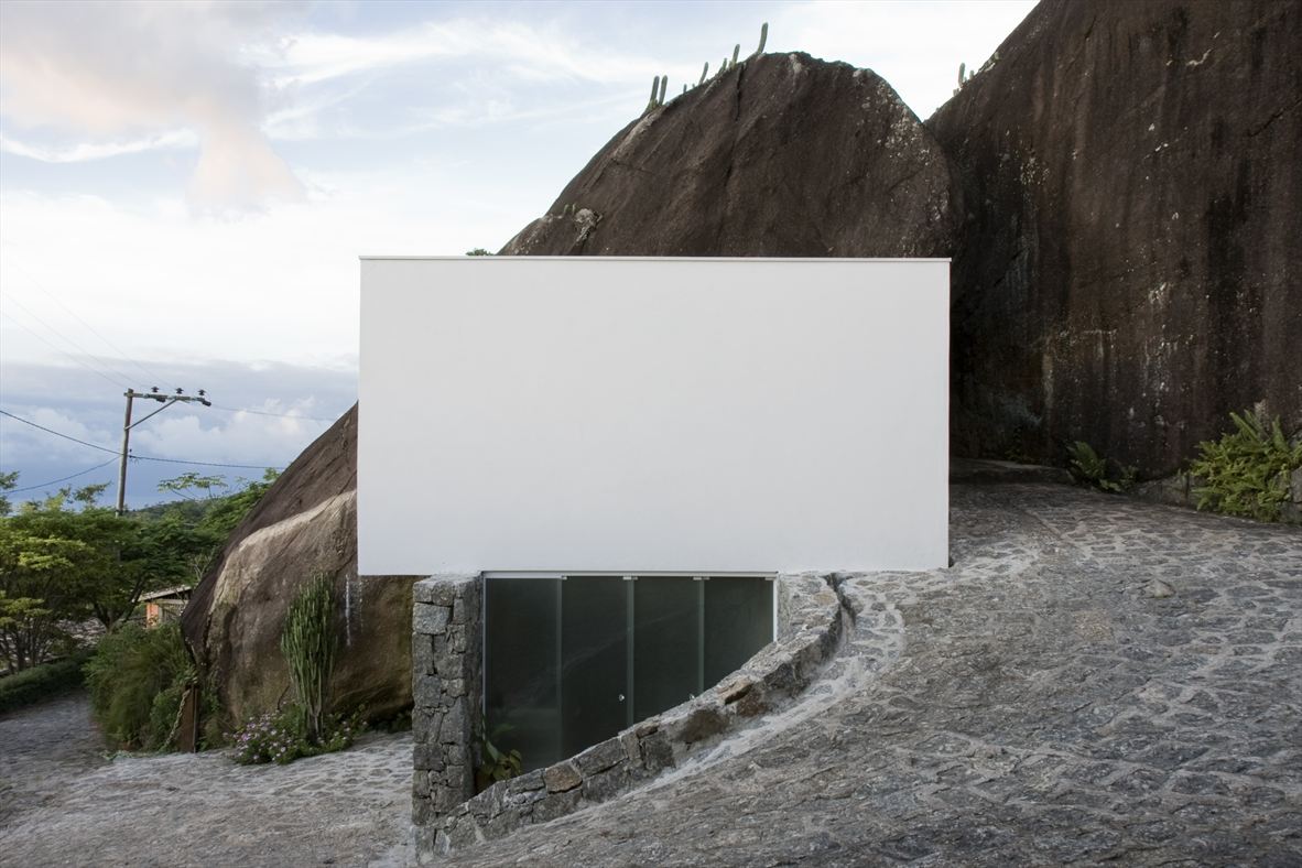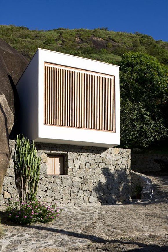 While working on a rebuild project for a caretaker’s house on the island of Ilhabela of São Paolo, Brazil, the main concern of architects Alan Chu and Cristiano Kato was to deliver a fresh, liberating sense of space. The original house was an oppressive one-story with stony walls and tiny punch-out windows, and the residence was capped by a clay rooftop accessible by means of a curved stone path. Though Casa Box still does not boast a high square footage, the now two-story residence generates its ambiance and spaciousness from both natural and constructed views. A white concrete box intended as bedroom space is suspended over a supporting stone wall, creating a void underneath that receives light from its glass doors that open out onto the ground floor. The box is punctured on two sides; one provides a view of the beautiful São Sebastião Channel through wooden shades while the other frames a graceful synergy of the box’s orthogonal geometry and the downward curving ramp. Casa Box also acknowledges economy in its design, for the leftover wood from scaffolding during construction is used to create custom pieces of furniture, the wall shelves, and the stairs within the house.