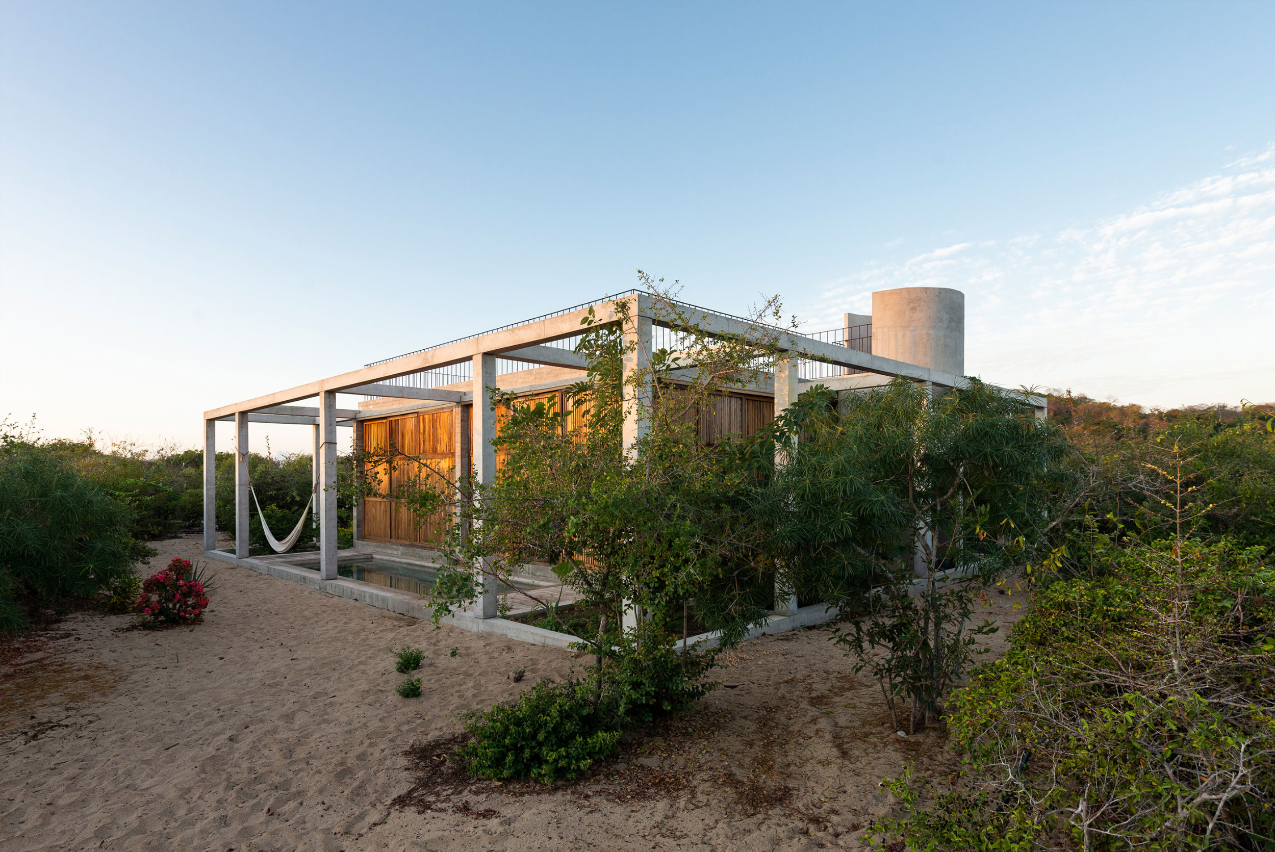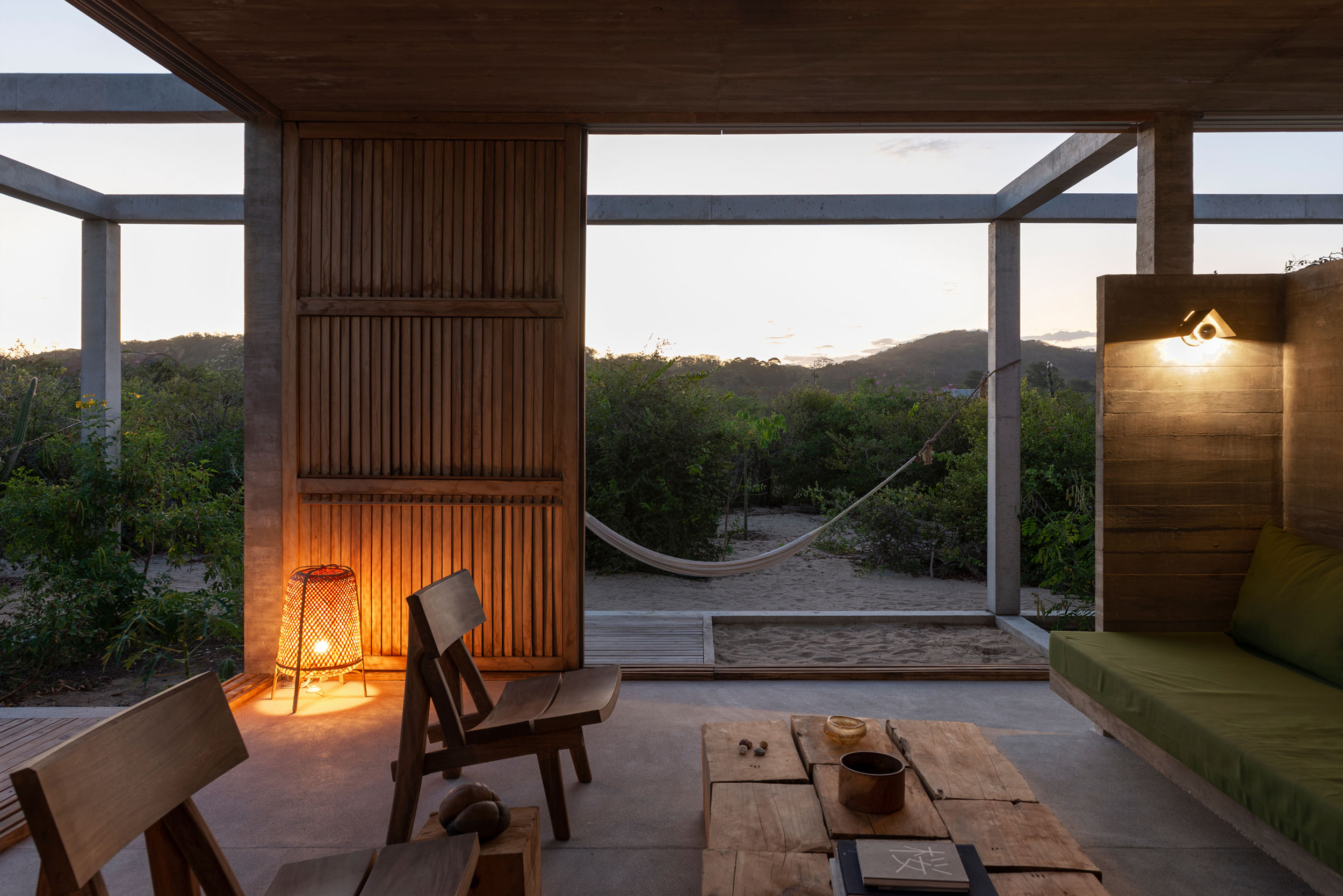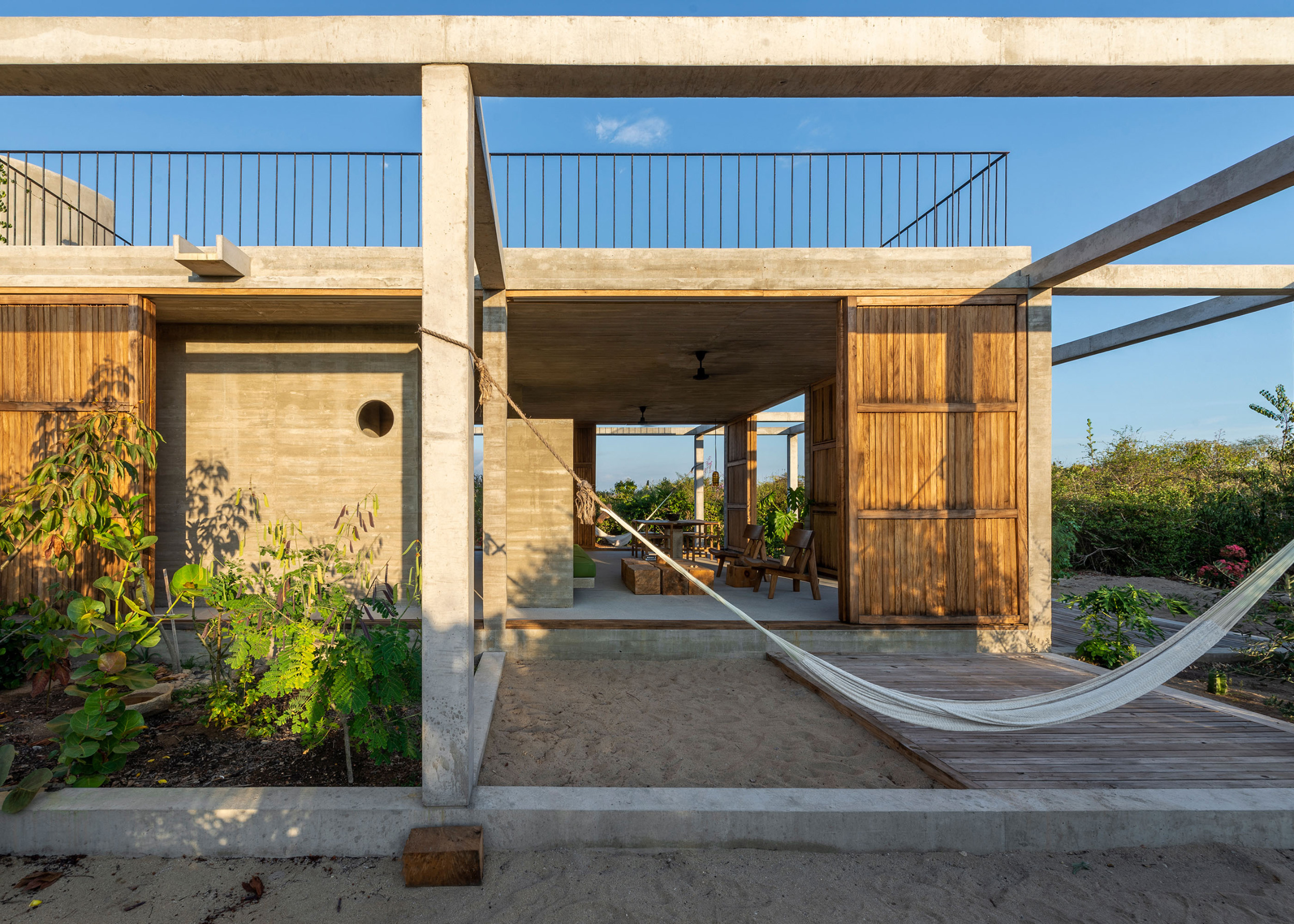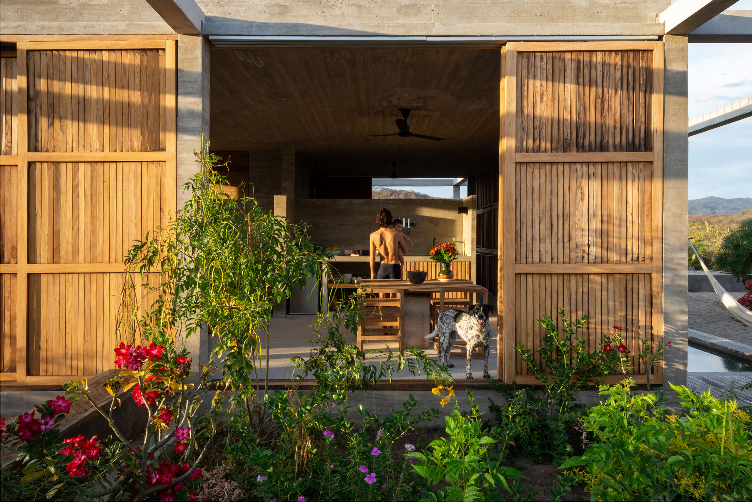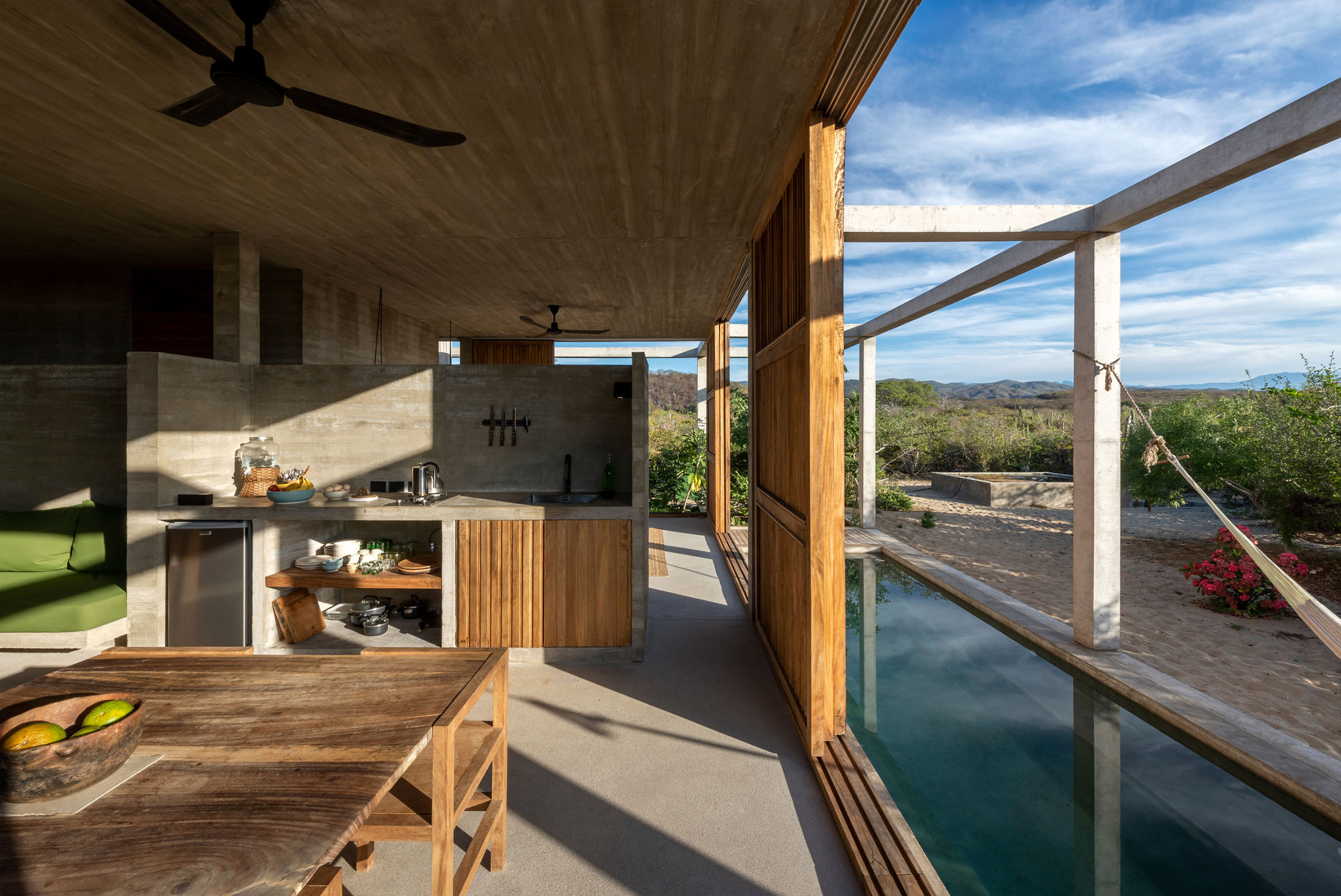 Built in a verdant setting in Puerto Escondido, Oaxaca, Mexico, Casa Cosmos’ design responds to the specific features of the site. Monterrey and Mexico City-based architecture firm S-AR designed the house with a central concrete volume. Placed around the rectangular core, a structure of concrete columns creates patios and terraces on the sides of the house. Wooden screens and doors slide to either open the living spaces to the landscape or to close them when not in use. Inside the compact volume there’s a bedroom, bathroom, kitchen, dining room, and cozy living room. Throughout the house, the studio used two materials closely connected to Mexican architecture: concrete and wood.