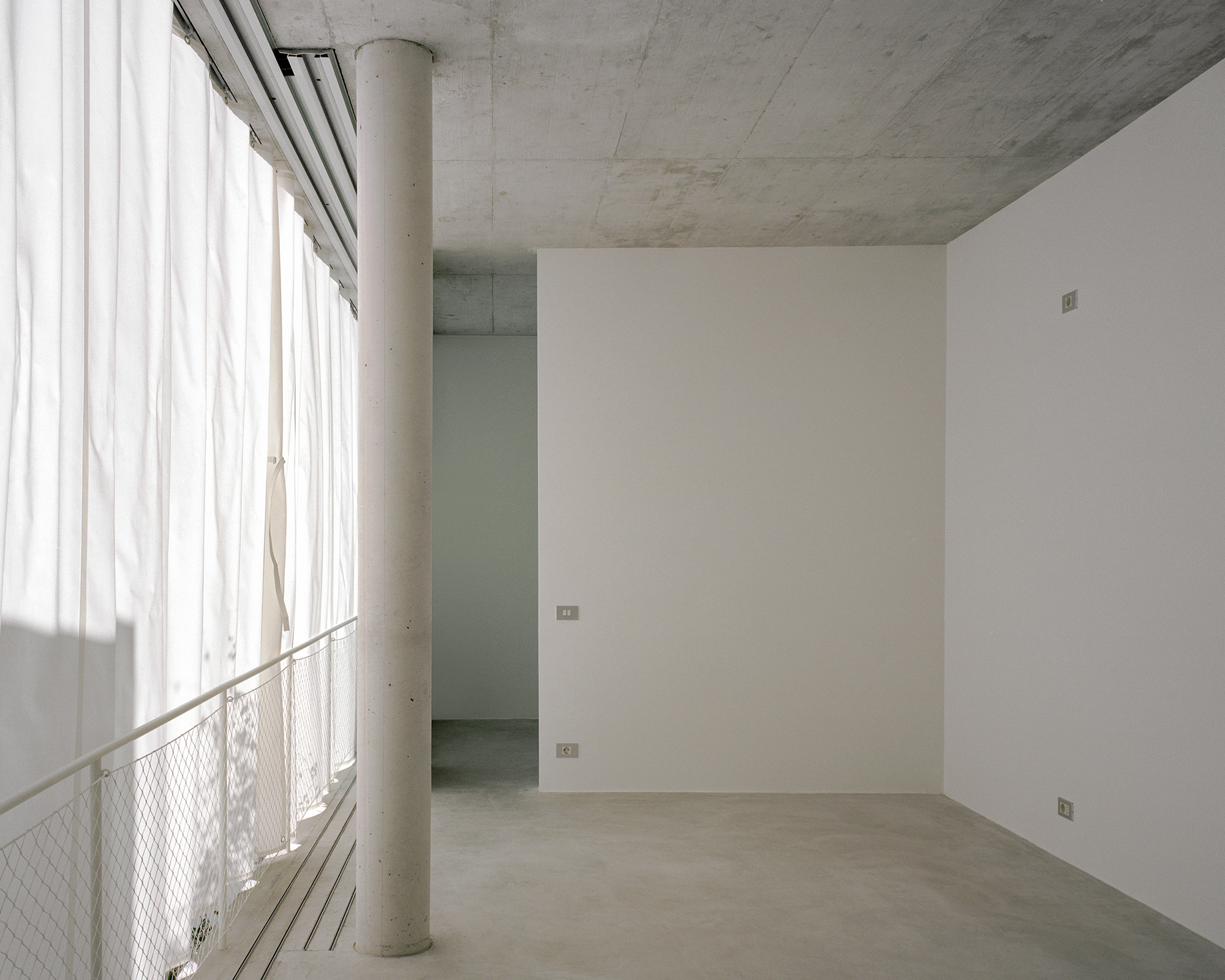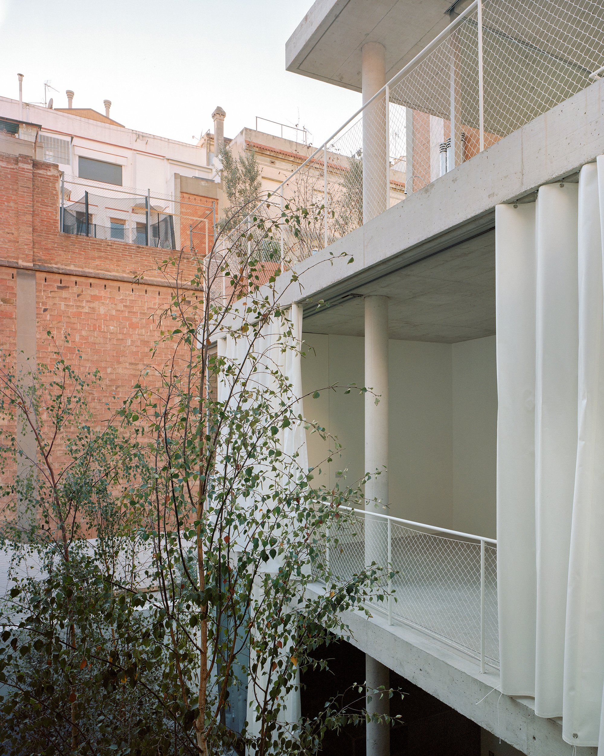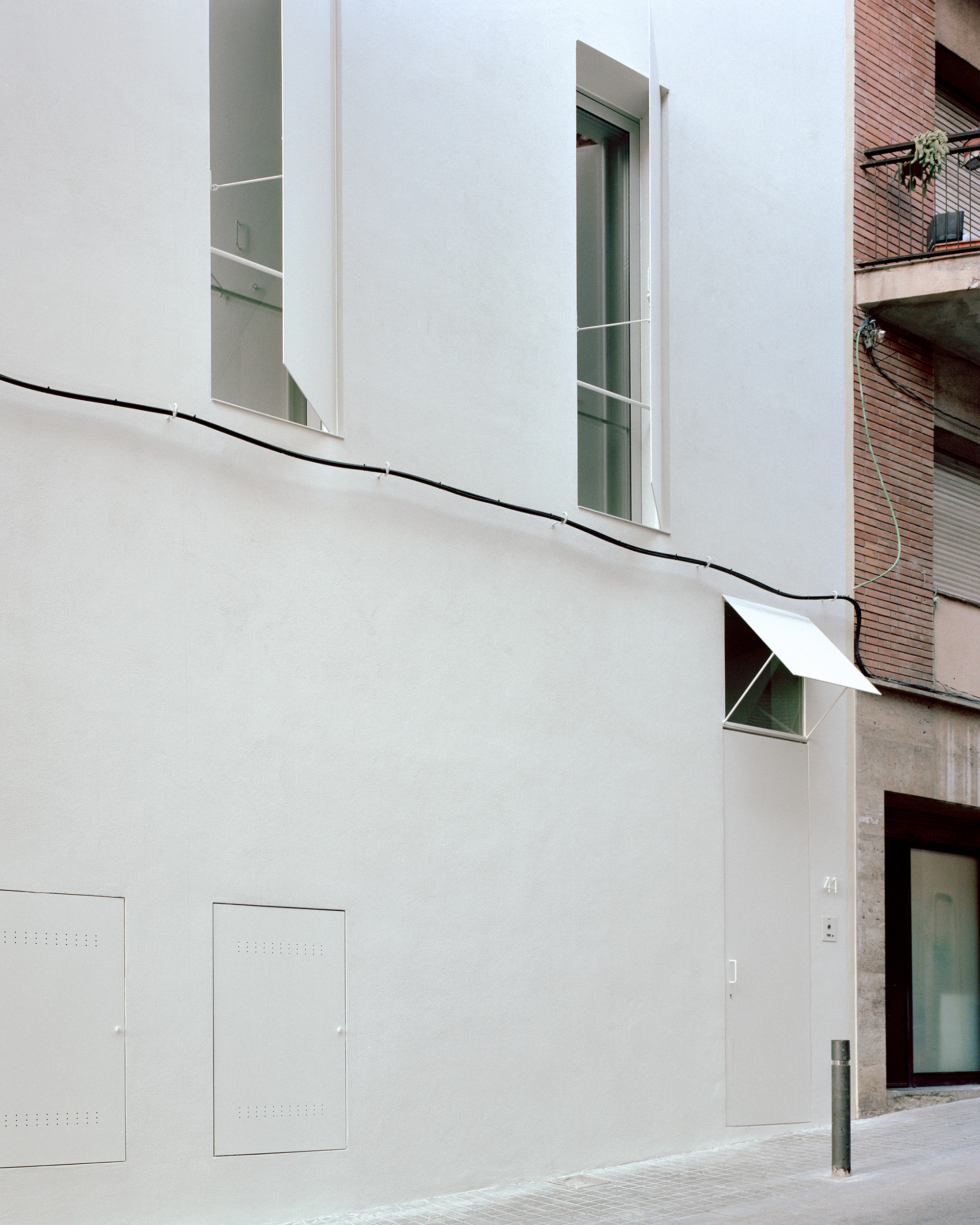 Located in Barcelona, Casa Costa occupies a narrow plot in a row of houses. Local studio Arquitectura-G designed the residence with a minimalist aesthetic that references brutalist architecture and with an interior garden that organizes the living spaces. Surrounded by party walls, the site presented a series of challenges which the architects solved in an elegant way. The façade has a simple white finish, becoming another wall that encloses the living spaces and ensures complete privacy from the street. Matching white shutters effectively make the windows disappear on the façade, but the residents can easily open them to connect the interior to the urban setting. The three-story house features open-plan living spaces that communicate not only with each other but also with the garden.