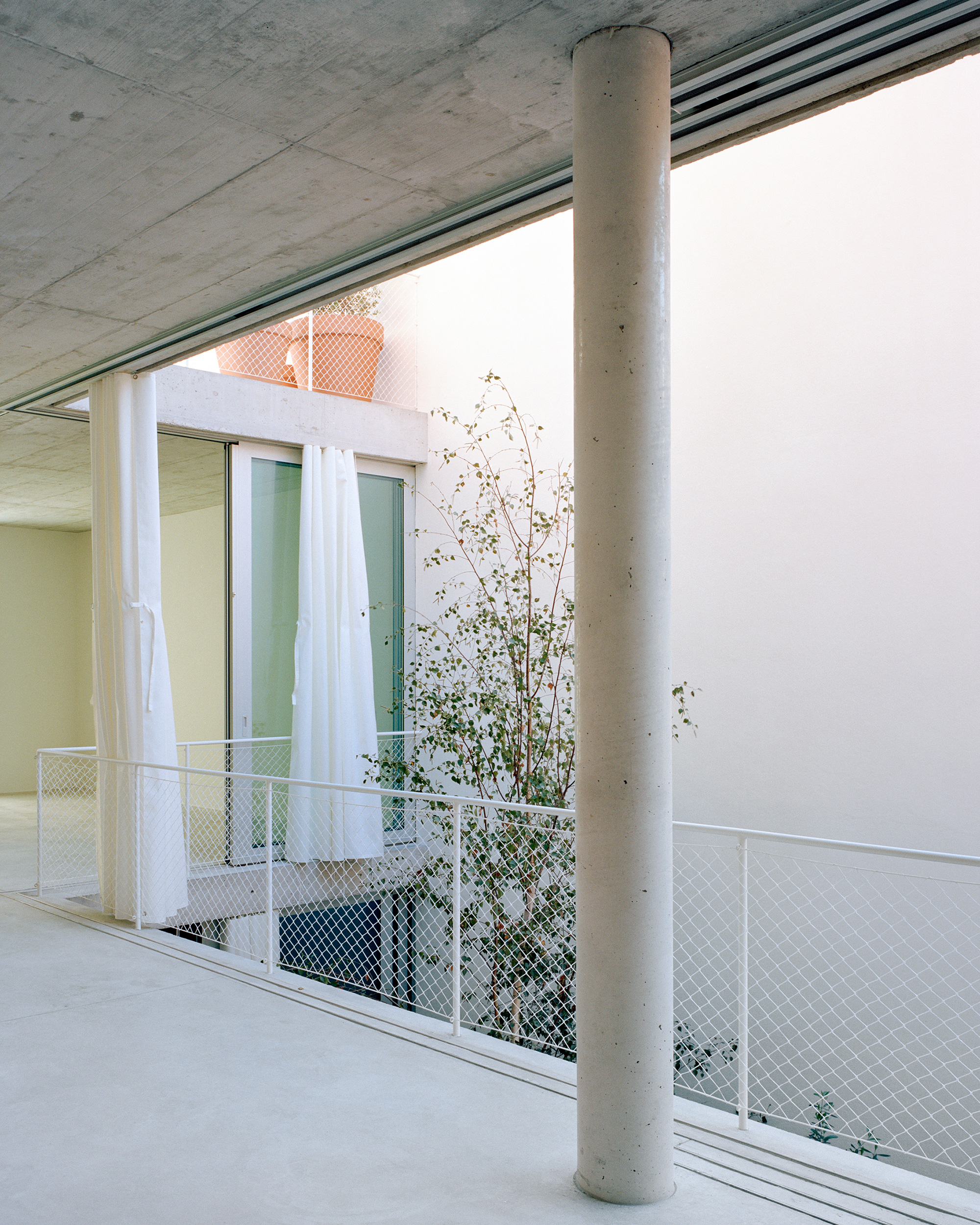 A spiral staircase links all floors. Made from exposed concrete, the staircase matches the ceilings and floors, along with columns that provide structural support. The ground floor houses the kitchen which features a stainless steel island, cabinets, and open shelving. Sliding glass doors connect this area to the courtyard where trees and vegetation grow. The studio designed the home without traditional partitions or dividing walls. As a result, the interiors are not only airy and bright, but also benefit from natural cross ventilation. Additionally, the interior garden and terraces allow the residents to relax outdoors in a tranquil setting despite the urban location. Photography © Maxime Delvaux.