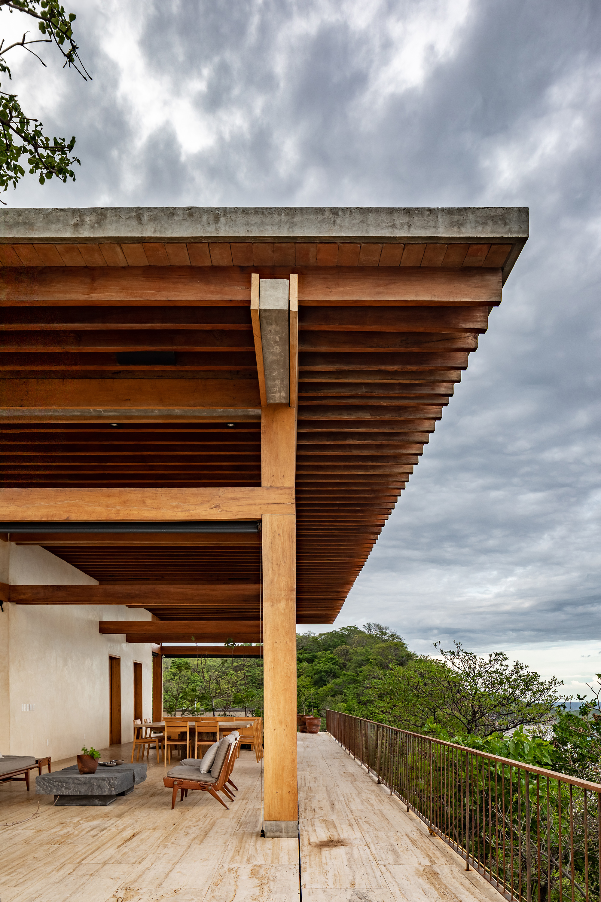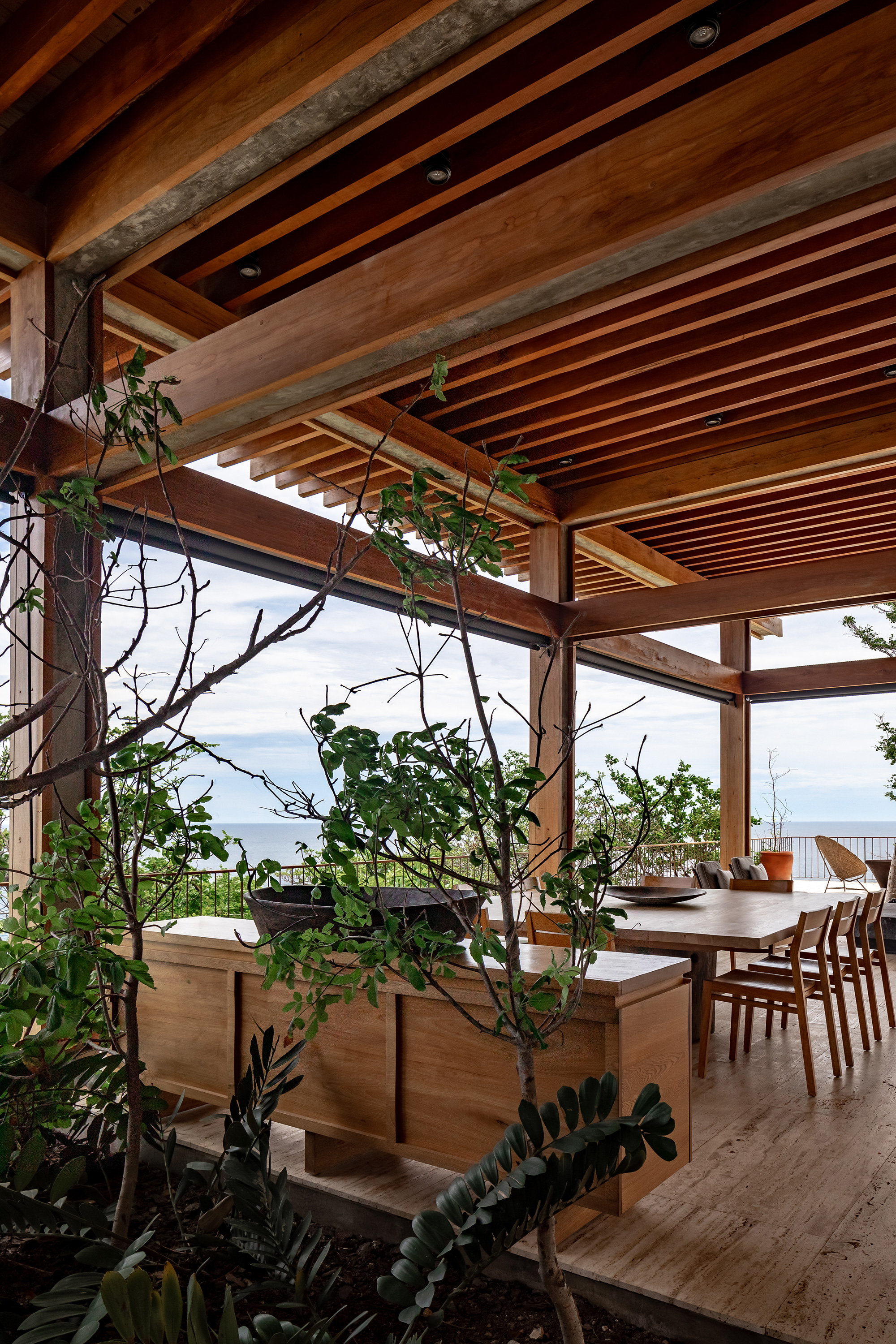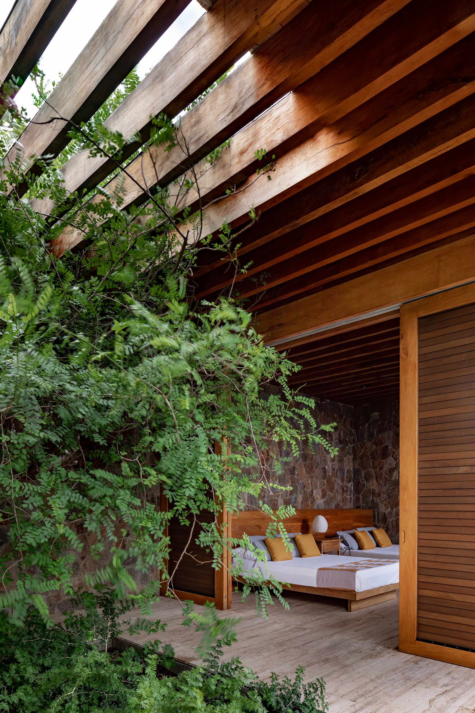 When needed, PVC curtains descend to protect the interior either from the sun or the rain. Likewise, the bedrooms feature wooden shutters that can easily control the light or ventilation. To build the house, the architecture firm used natural and locally sourced materials. Apart from tropical wood and palm roofs, the volumes also feature concrete and wood beams along with stone left over from the excavation stage. Finally, the travertine used for the terraces comes from the nearby state of Veracruz. Photographs© Onnis Luque.