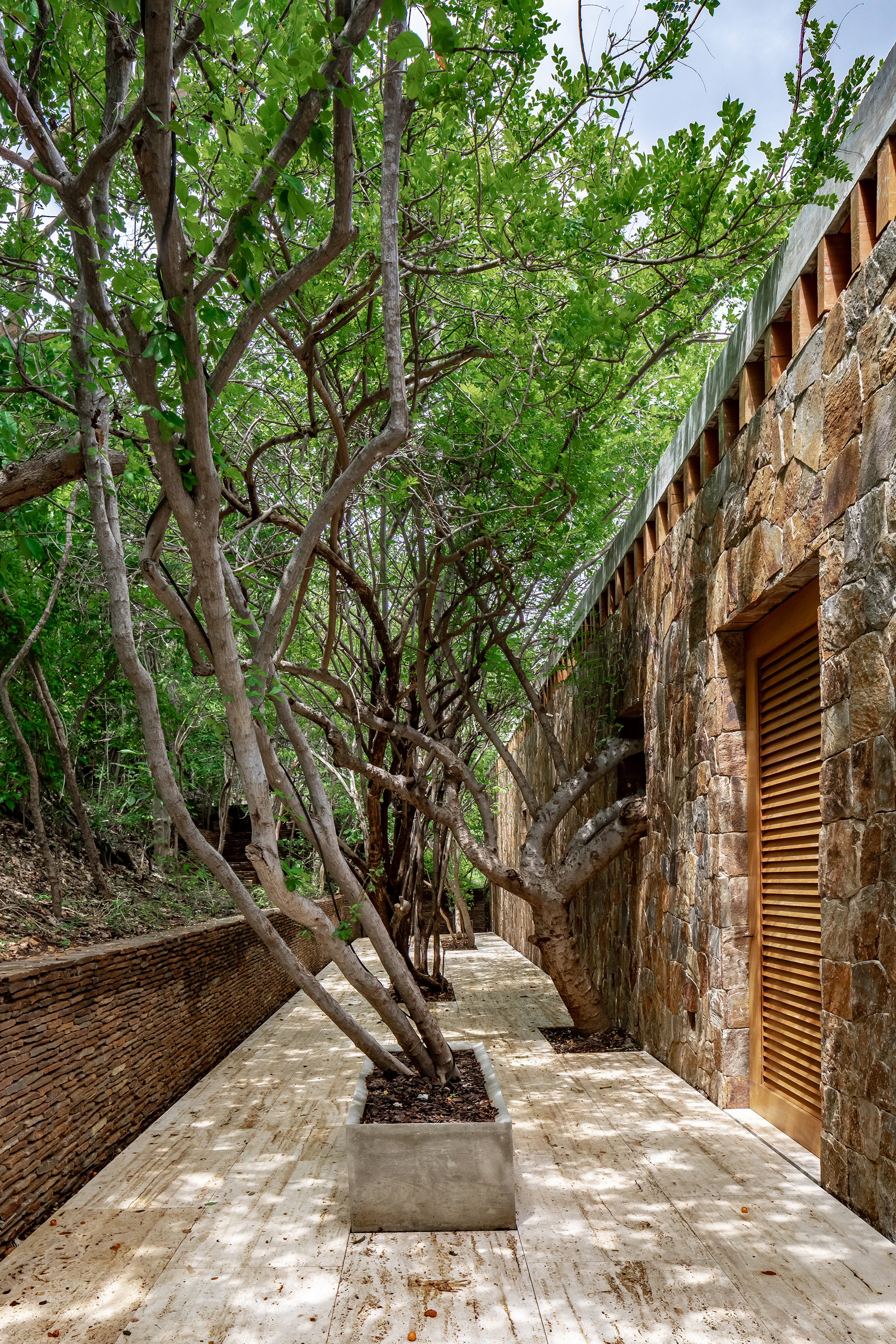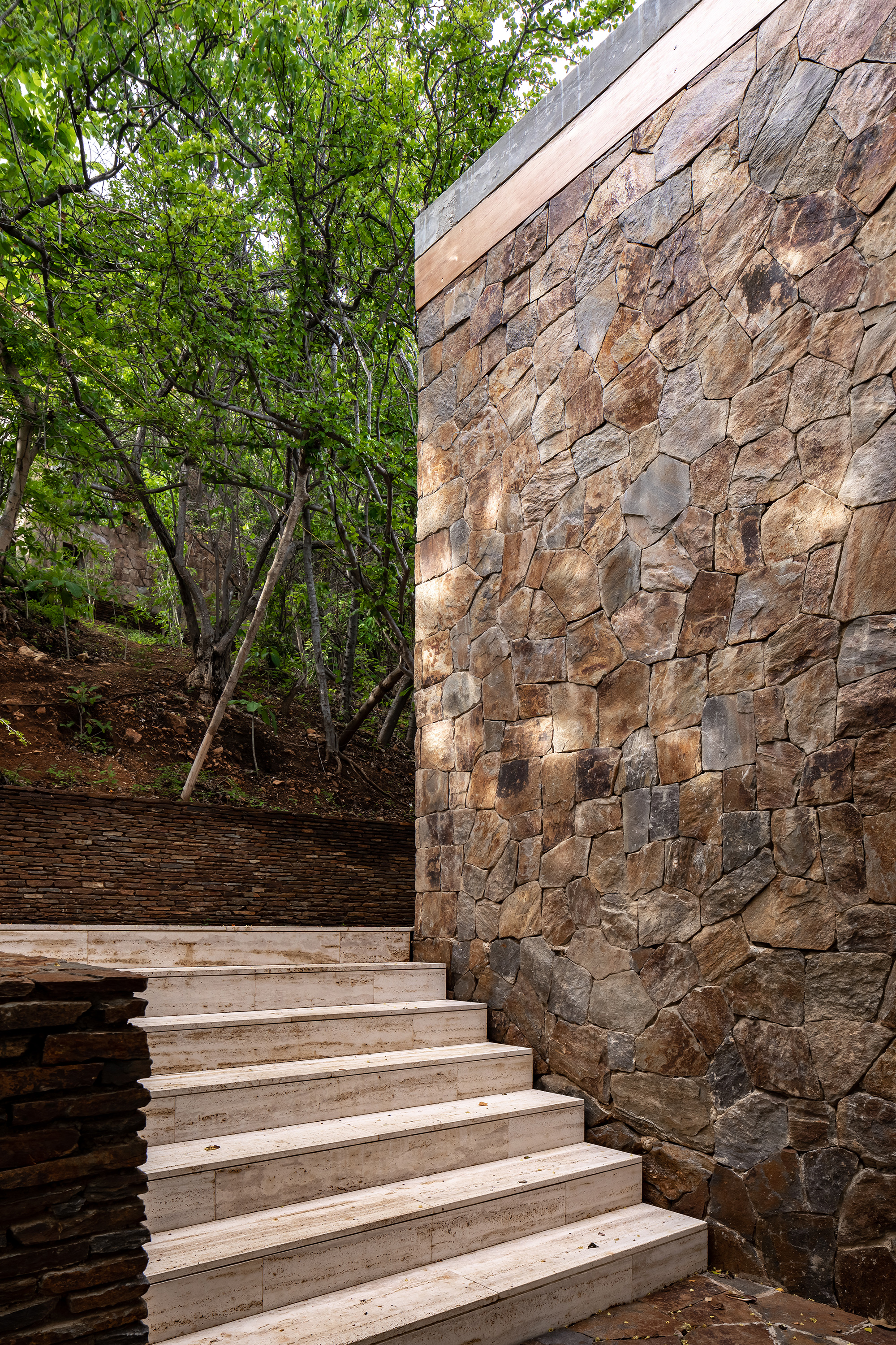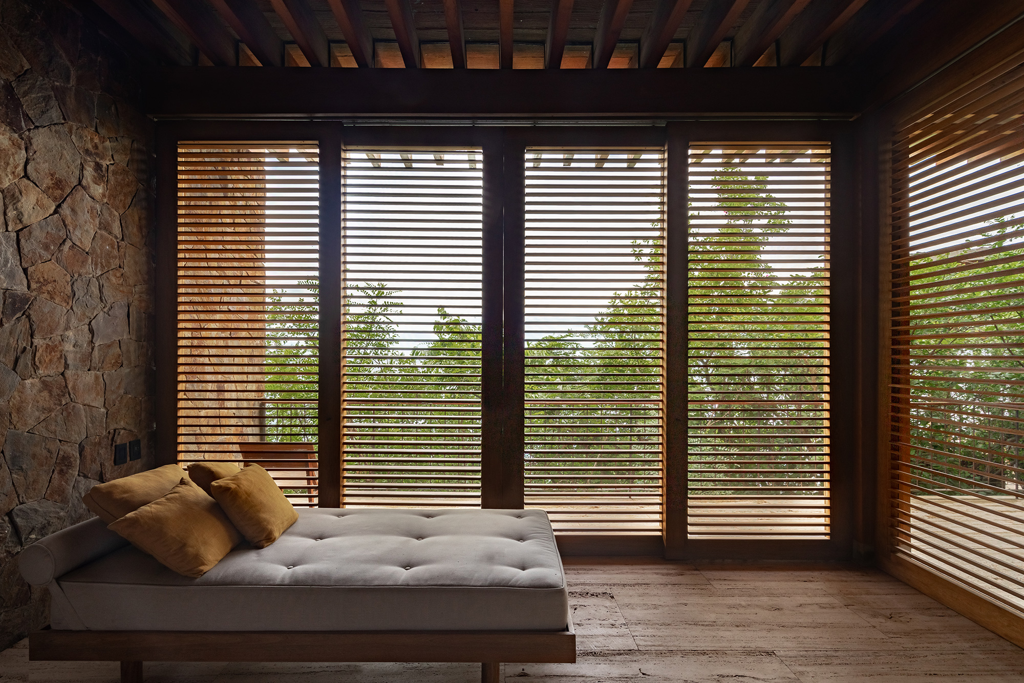 When needed, PVC curtains descend to protect the interior either from the sun or the rain. Likewise, the bedrooms feature wooden shutters that can easily control the light or ventilation. To build the house, the architecture firm used natural and locally sourced materials. Apart from tropical wood and palm roofs, the volumes also feature concrete and wood beams along with stone left over from the excavation stage. Finally, the travertine used for the terraces comes from the nearby state of Veracruz. Photographs© Onnis Luque.