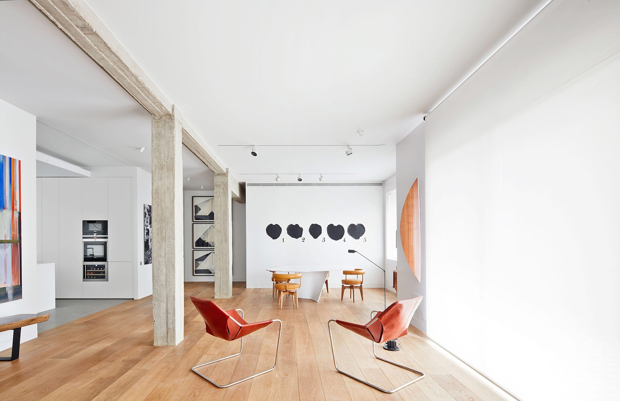 White walls covered in artworks and modern furniture create a distinctive décor where every detail matters. Light floods the interior and enhances the beautiful textures of the well chosen materials: solid wood, concrete and marble as well as glass, leather and matte surfaces. Neutral and light tones allow the furniture and artworks to stand out in the rooms even further. Brought together in a perfect balance, art and modern design intertwine in a refined living space that looks and feels welcoming and relaxing. Photography by José Hevia.