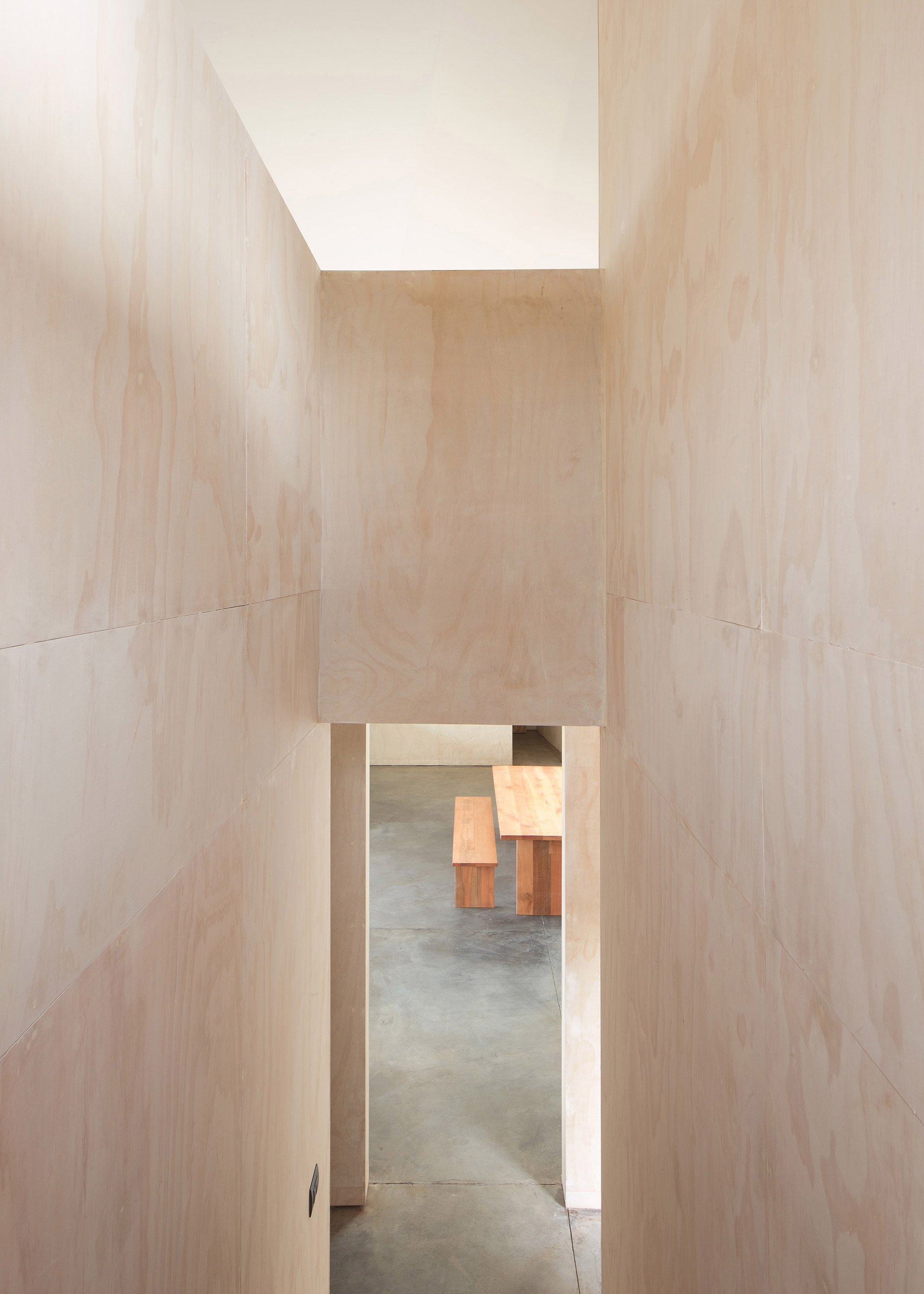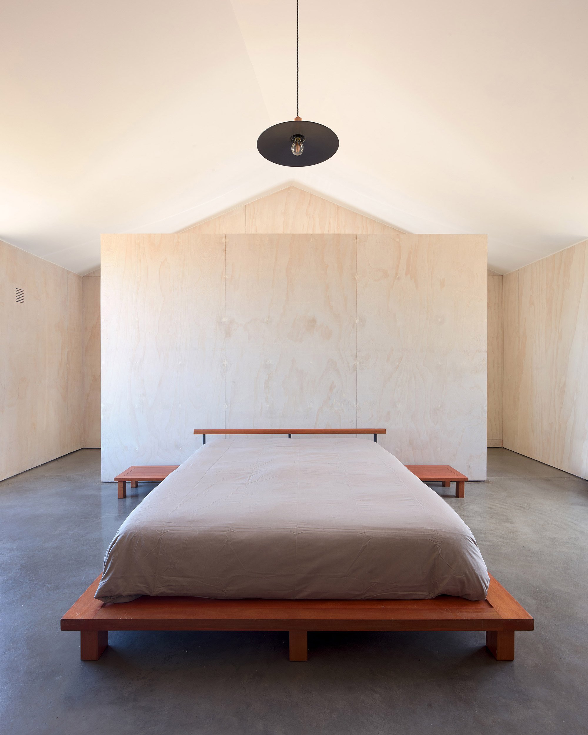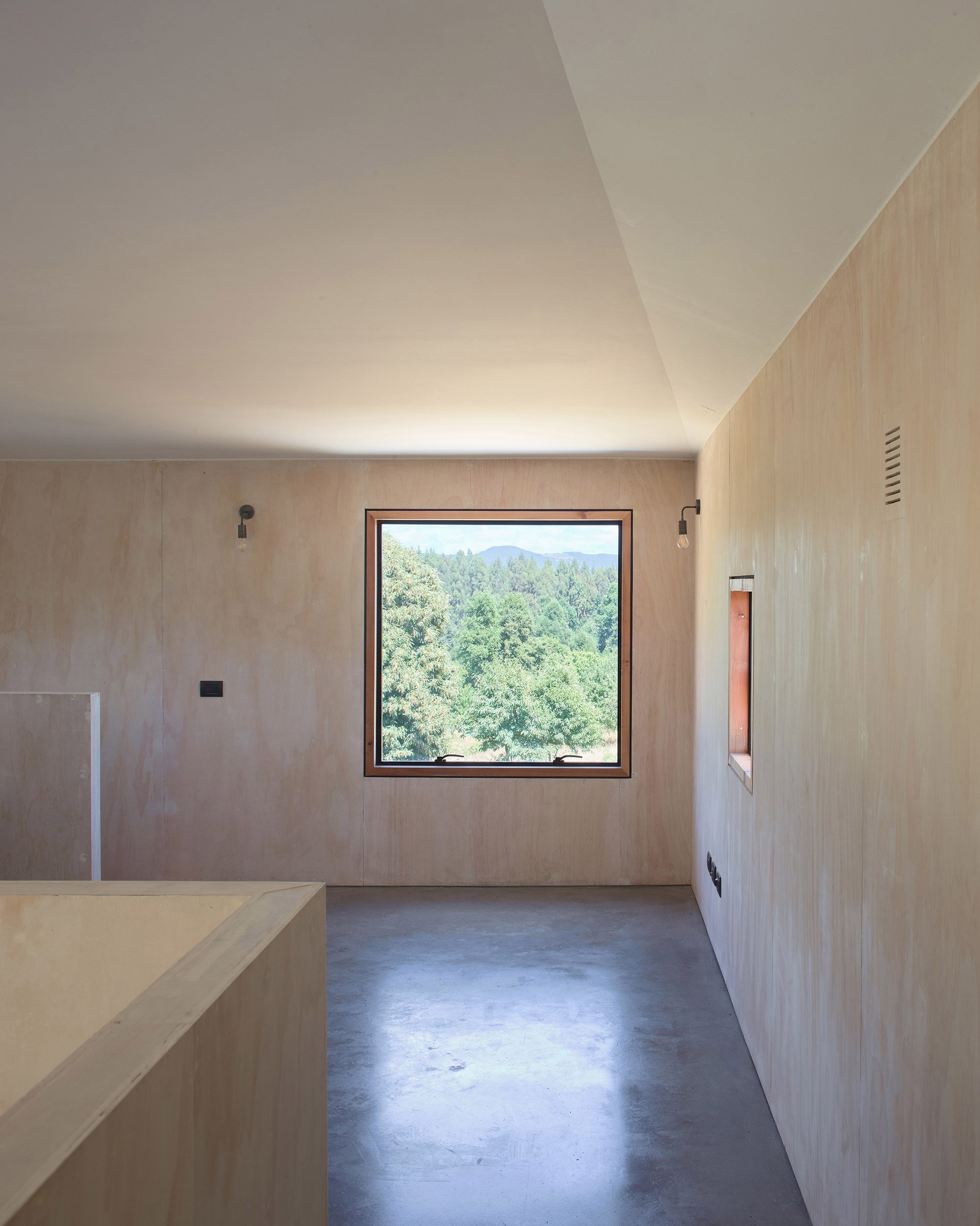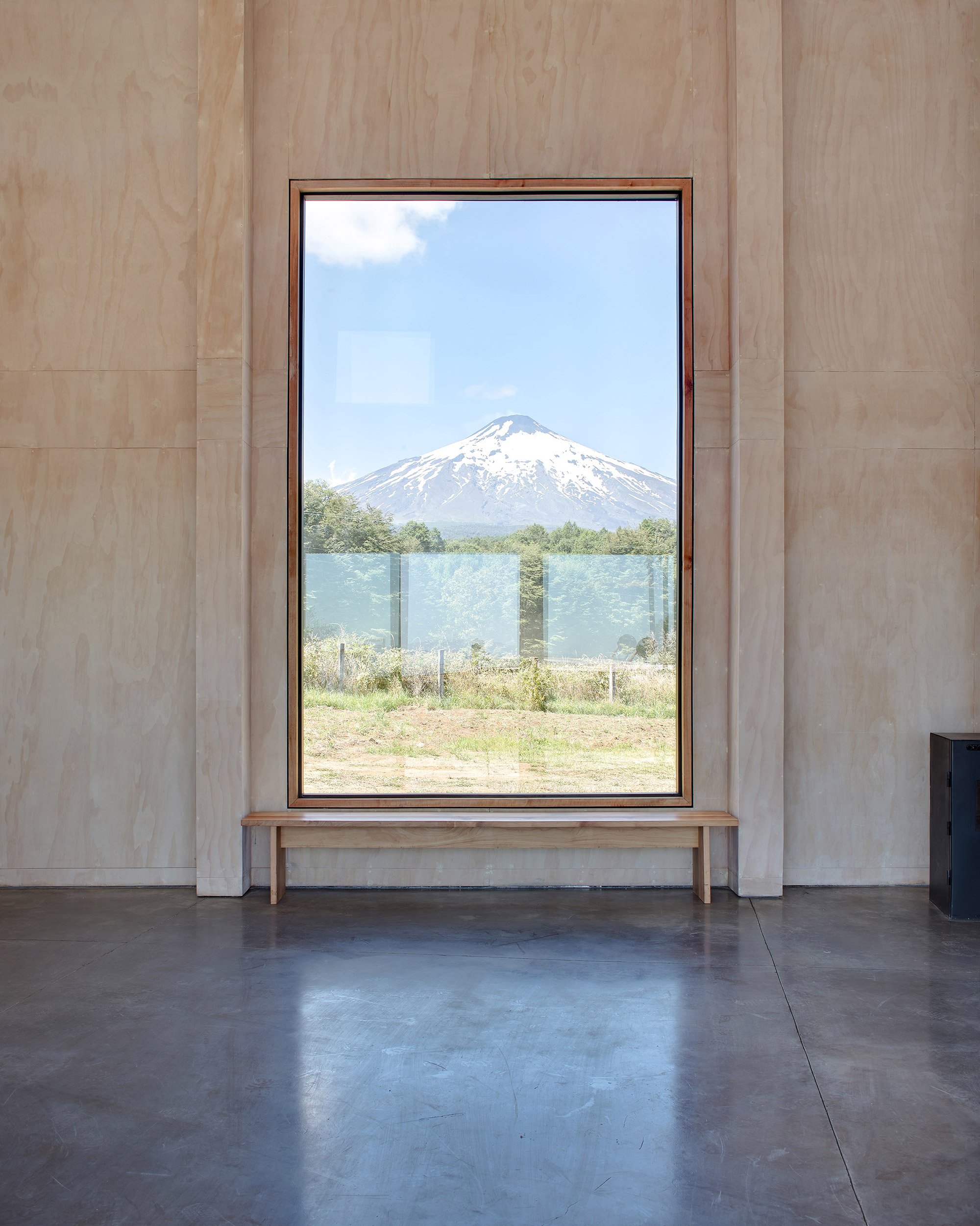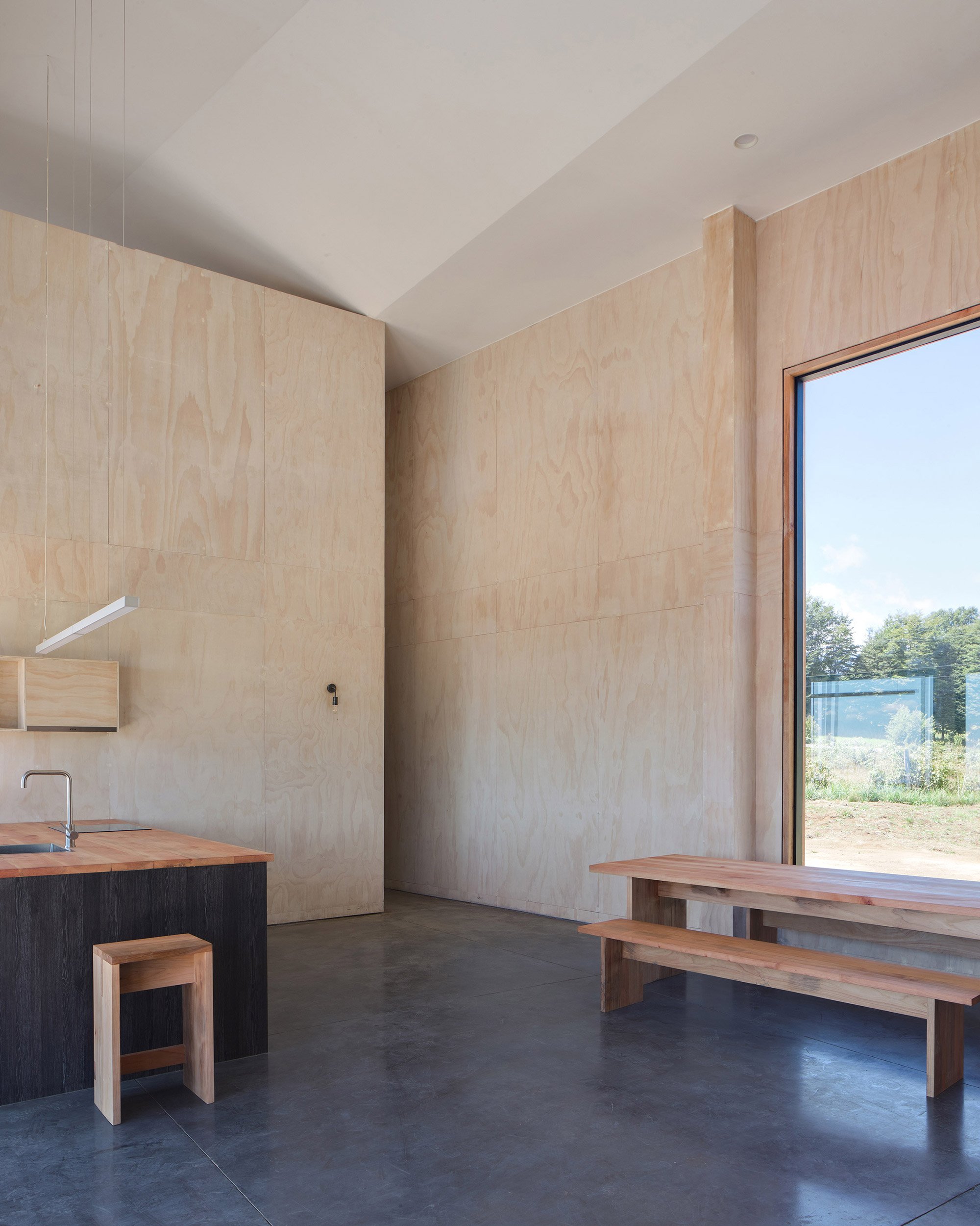 Two stories provide plenty of living spaces in this family home. The roof boasts a flat design in the south-west side, while the north-east elevation has a traditional pitched volume. Inside, internal walls end right before reaching the single and double height ceilings to accentuate the dynamic design of the roof and to also allow the separate planes to flow into one another. The interior walls contrast the dark exterior of the black siding house; they boast white washed plywood panels which brighten the living spaces. Distinct and seemingly random, the fenestration curates the views. One window frames the volcano, while another provides views towards the lake. Like paintings, the openings frame the landscape and bring the beauty of nature inside the modern dwelling. Photographs© Felipe Fontecilla, Javier Ampuero.