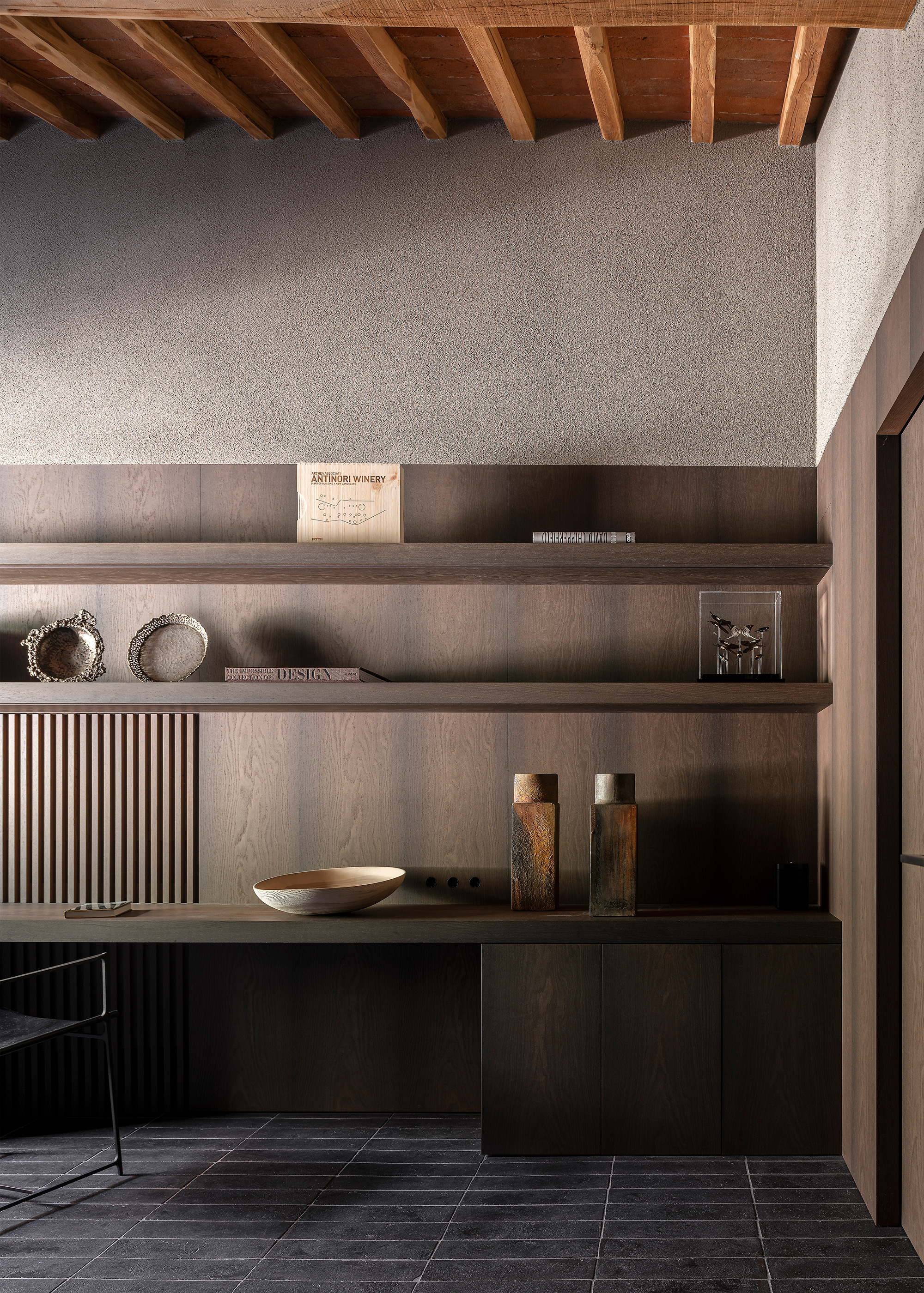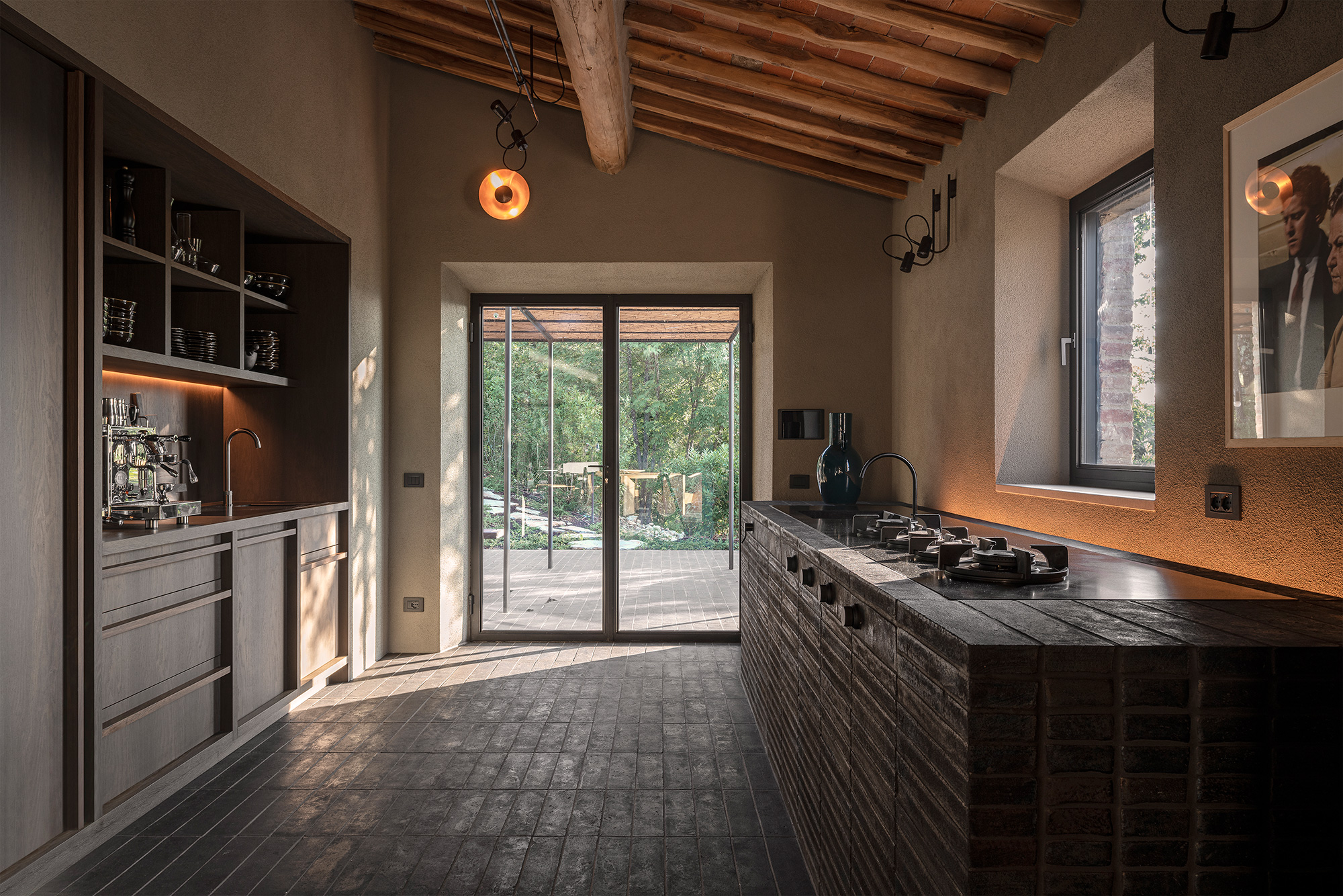 Casa Morelli features custom-made furnishings and lighting as well as carefully chosen artworks and industrial pieces. Materials include antique wood flooring and dark stone tiles as well as chestnut wood beams and Tuscan travertine basins. Generous glazing brings plenty of natural light into the moody, dark interiors.